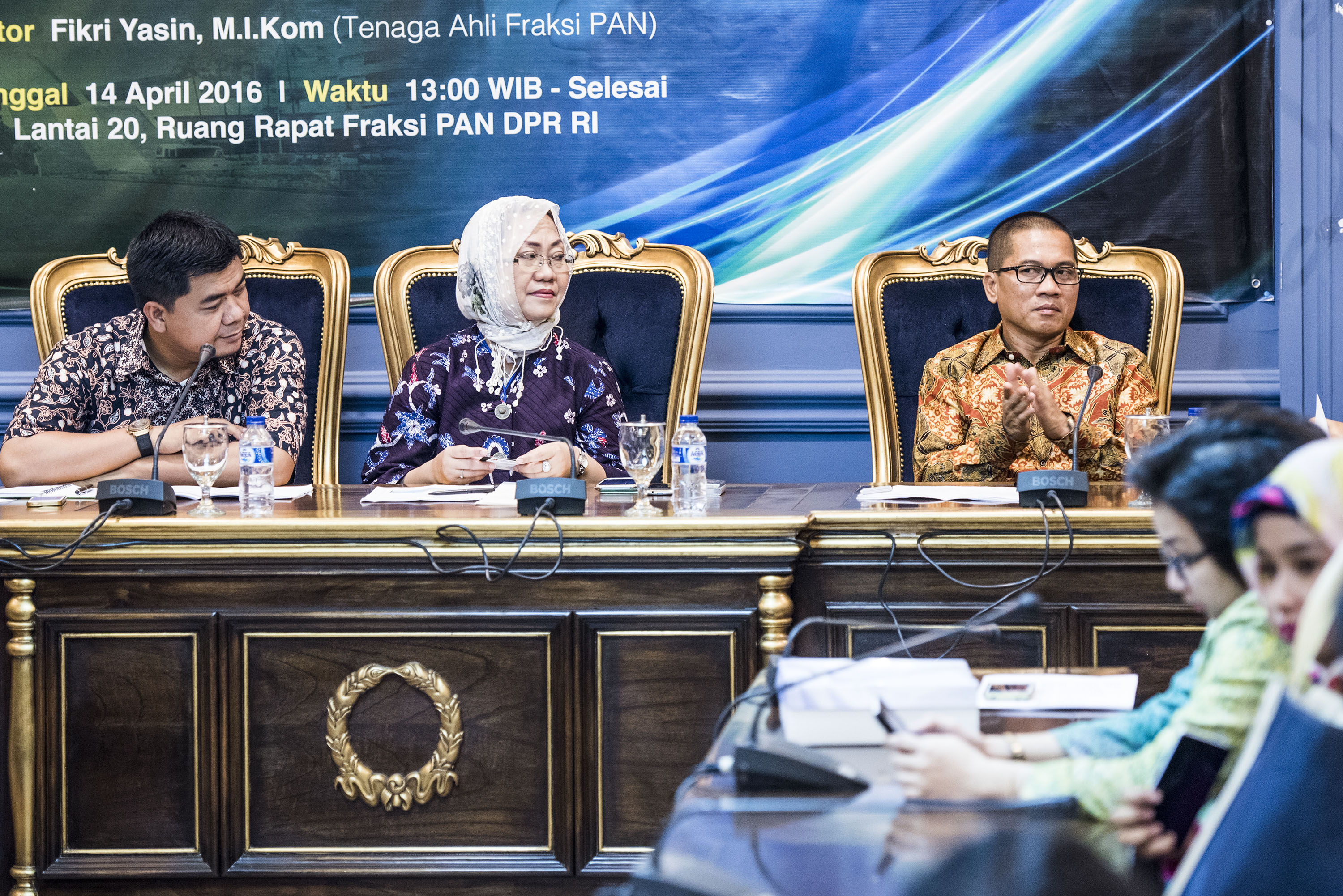 Anggota Komisi II DPR Fraksi PAN Yandri Susanto (kanan) didampingi Pengamat Politik LIPI Prof Siti Zuhro (tengah) dan Komisioner KPU Juri Ardianto (kiri) menjadi pembicara dengan tema Dialog Revisi UU Pilkada di Fraksi PAN, Komplek Parlemen Senayan, Jakarta, Kamis (14/4). Dalam diskusi tersebut Fraksi PAN berharap revisi UU Pilkada ini akan menjadi revisi yang terakhir. ANTARA FOTO/M Agung Rajasa/foc/16.