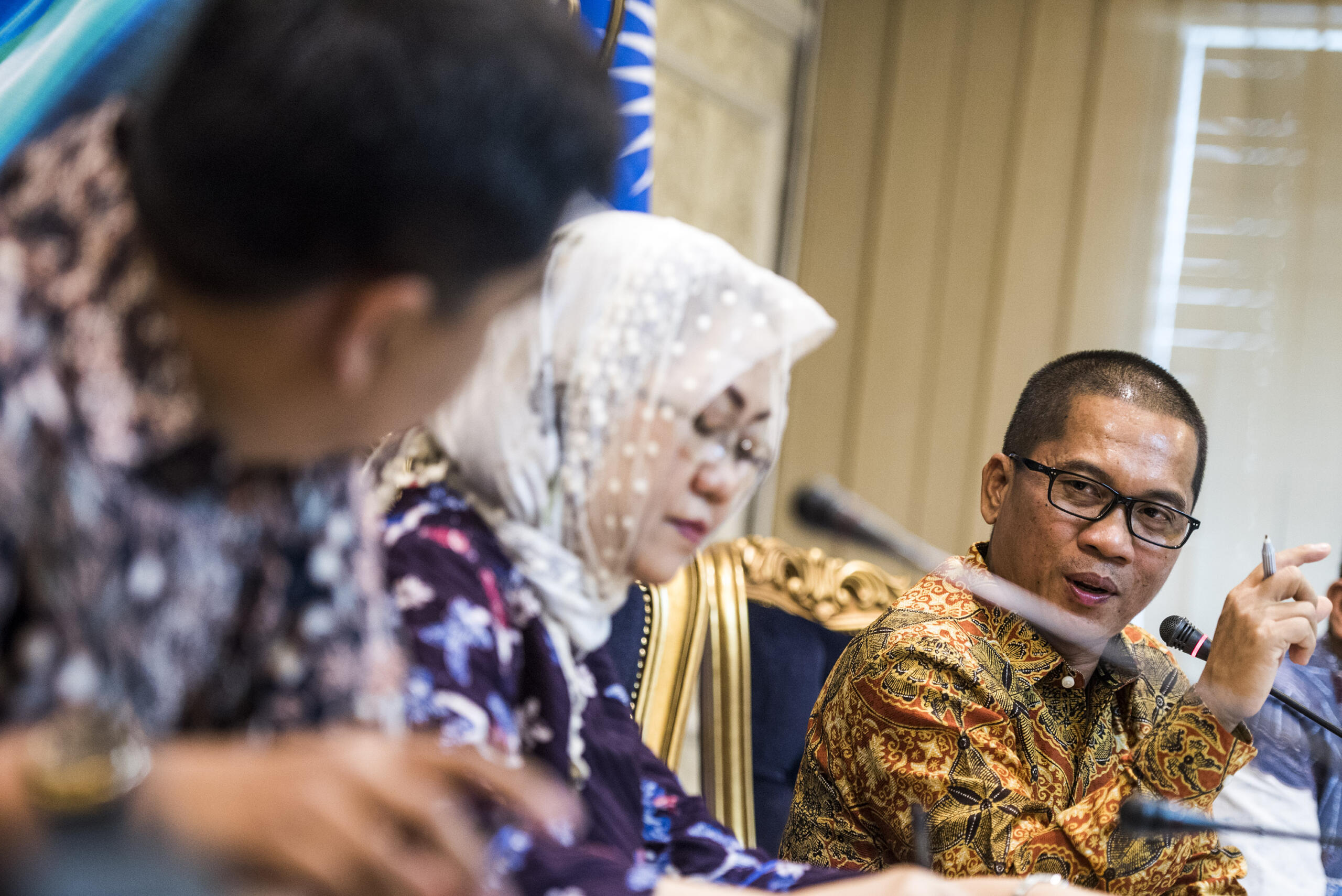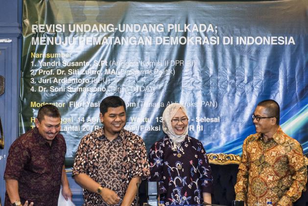 Ketua Fraksi PAN DPR RI Mulfachri Harahap (kiri) didampingi Anggota Komisi II DPR Fraksi PAN Yandri Susanto (kanan) berbincang dengan pengamat politik LIPI Prof Siti Zuhro (kedua kanan) dan Komisioner KPU Juri Ardianto (kedua kiri) saat Dialog Revisi UU Pilkada di Fraksi PAN, Komplek Parlemen Senayan, Jakarta, Kamis (14/4). Dalam diskusi tersebut Fraksi PAN berharap revisi UU Pilkada ini akan menjadi revisi yang terakhir. ANTARA FOTO/M Agung Rajasa/foc/16.