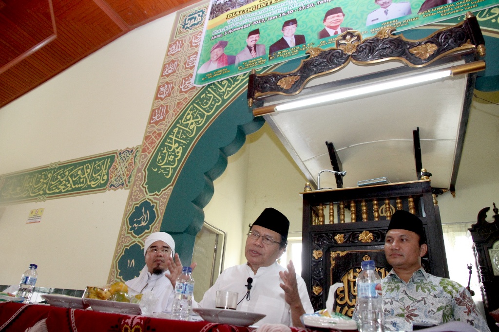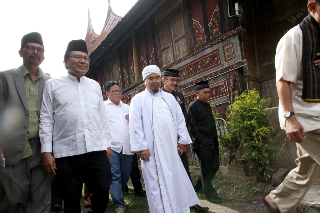 Tokoh Nasional Rizal Ramli (dua dari kiri) didampingi Ketua MUI Sumatera Barat Buya Gus Gazahar (dua dari kanan) saat melakukan kunjungan dan dialog bersama masyarakat Simarasok, Kabupaten Baso Agam, Sumatra Barat, Minggu (5/11). Pertemuan yang dihadiri oleh masyarakat dan ratusan Wali Nagari, Rizal Ramli mengatakan masyarakat Minang adalah masyarakat yang berani, demokratis dan mandiri, ia berharap kebangkitan ekonomi Indonesia yang lebih baik akan berawal dari Sumatera Barat. AKTUAL/HO