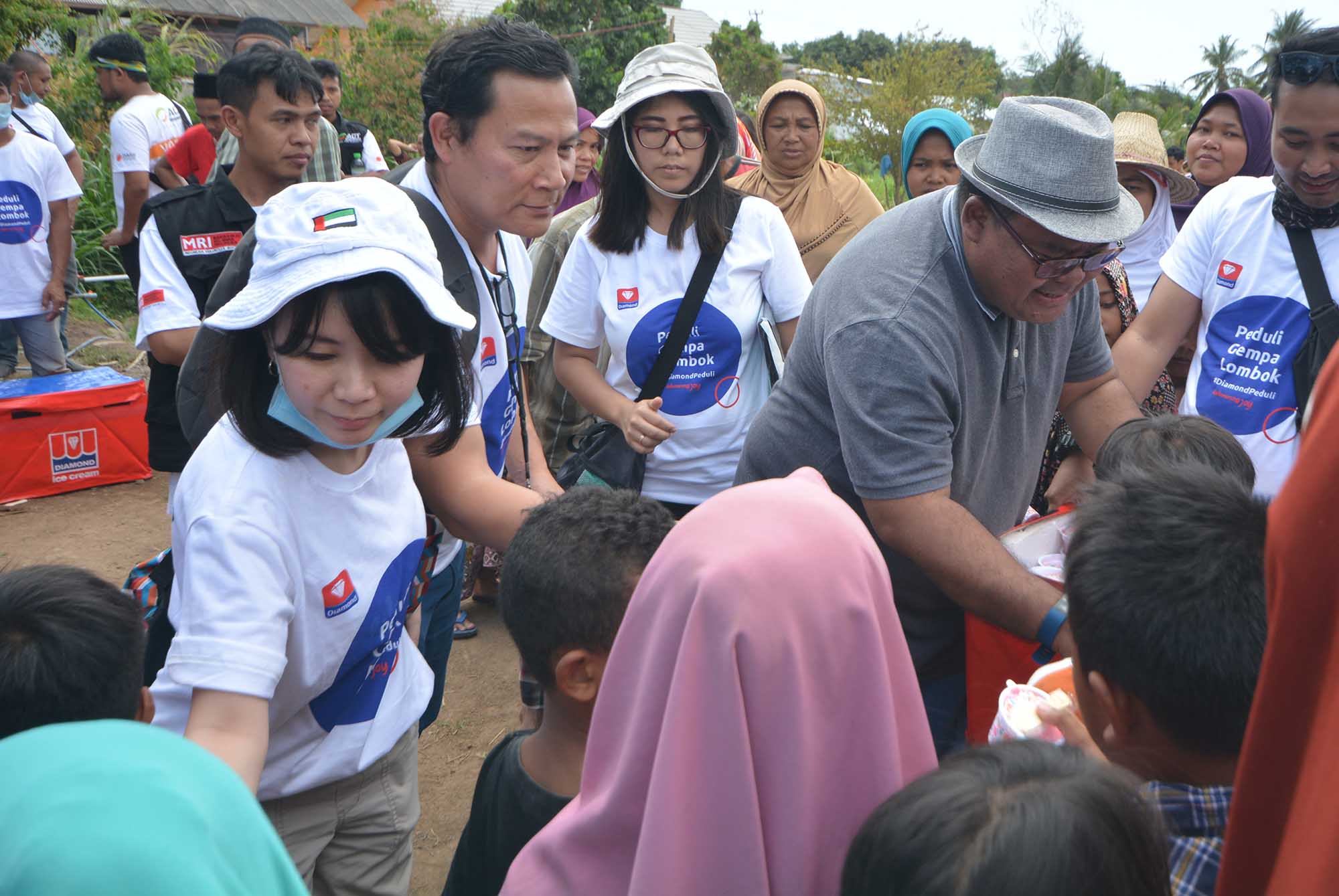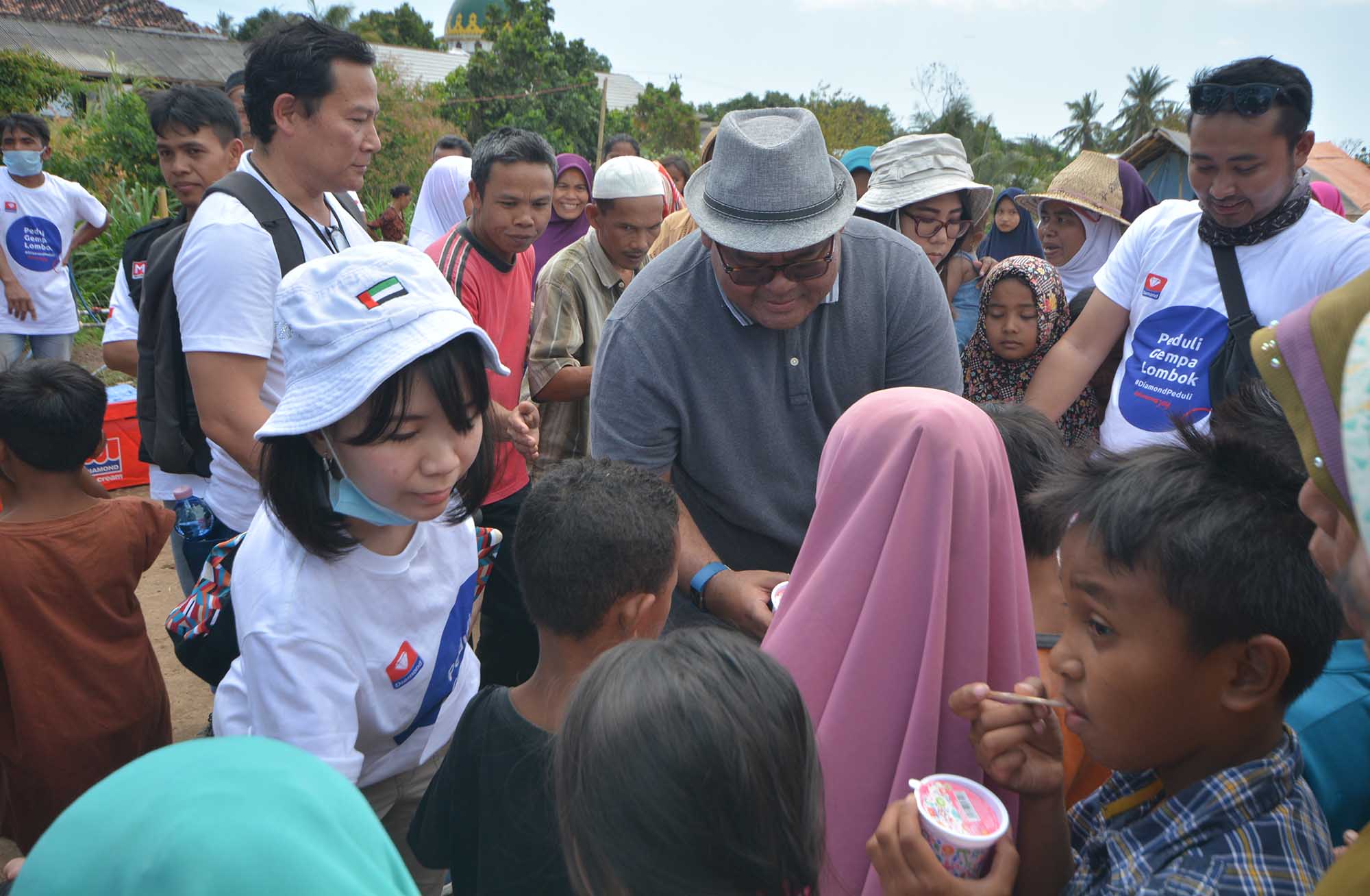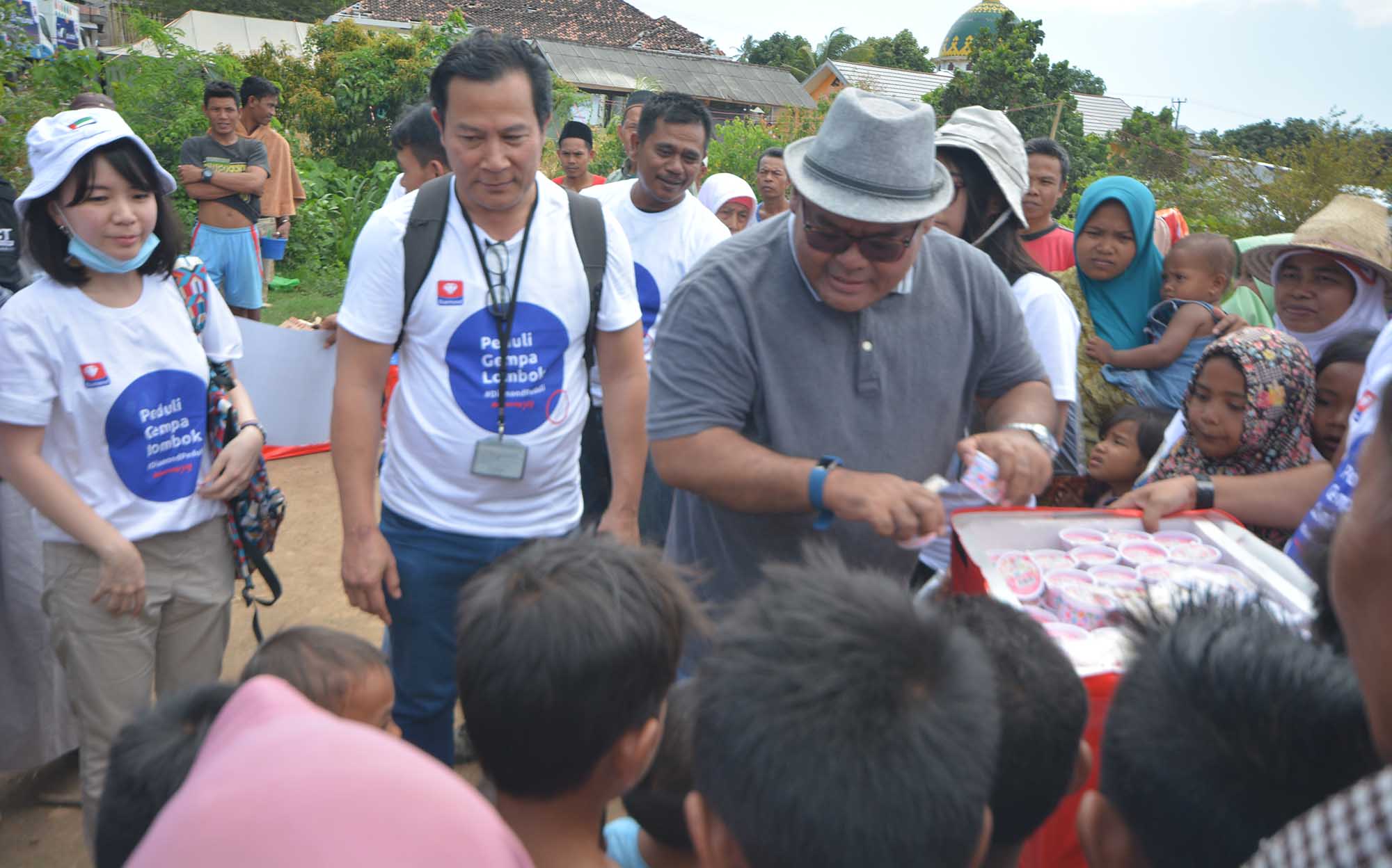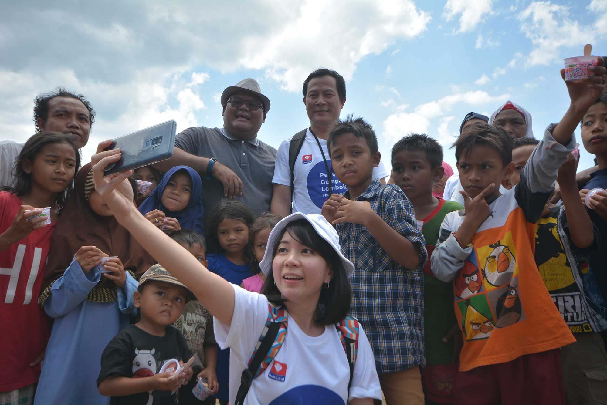 General Manager Corporate Communication Diamond Group Meitra N Sari, General Manager Fine Food &Beverage PT Sukanda Djaya Jong Fan Nie dan General Manager PT Sukanda Djaya Cabang Mataram Nares Changsamlee bersama para pengungsi gempa Lombok saat kegiatan CSR Diamond Group Peduli di Dusun Trengan Timur, Kecamatan Pamenang Kabupaten Lombok Utara, Nusa Tenggara Barat, Sabtu (8/9). Diamond Group beserta karyawan kembali melakukan serangkaian kegiatan sosial sebagai wujud tanggung jawab sosial perusahaan untuk korban gempa Lombok. Selain bantuan berupa 150 ribu produk makanan dan minuman siap saji, Direksi dan Karyawan juga menyerahkan hasil penggalangan dana dari karyawan Diamond Group serta pengecekan kesehatan bagi para pengungsi. AKTUAL/Eko S Hilman