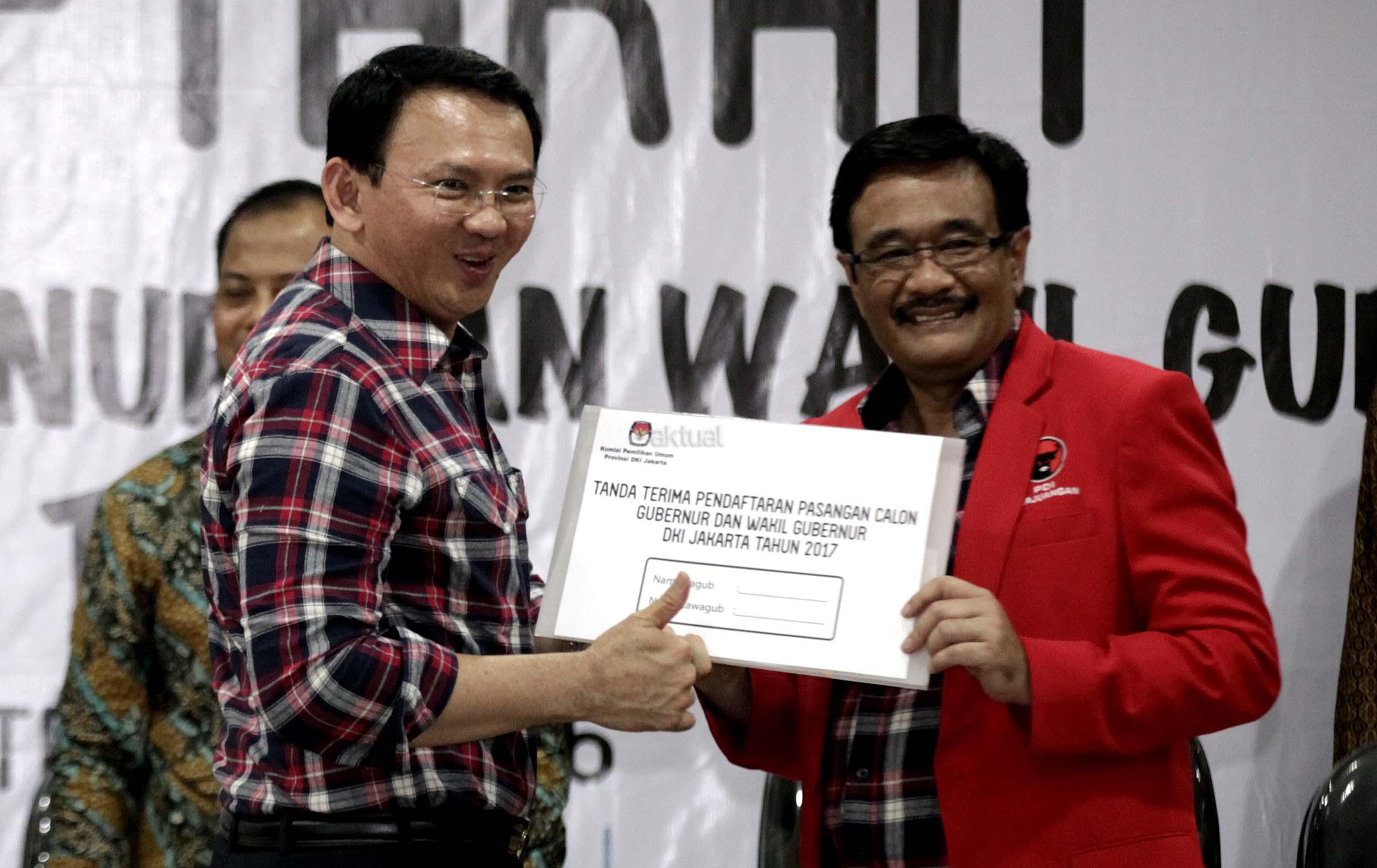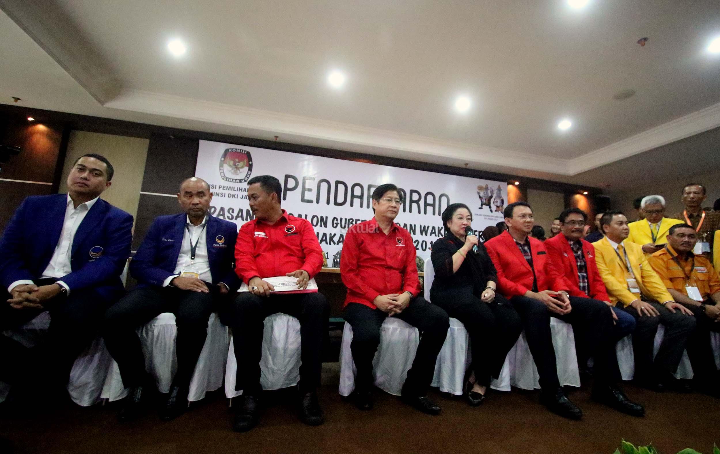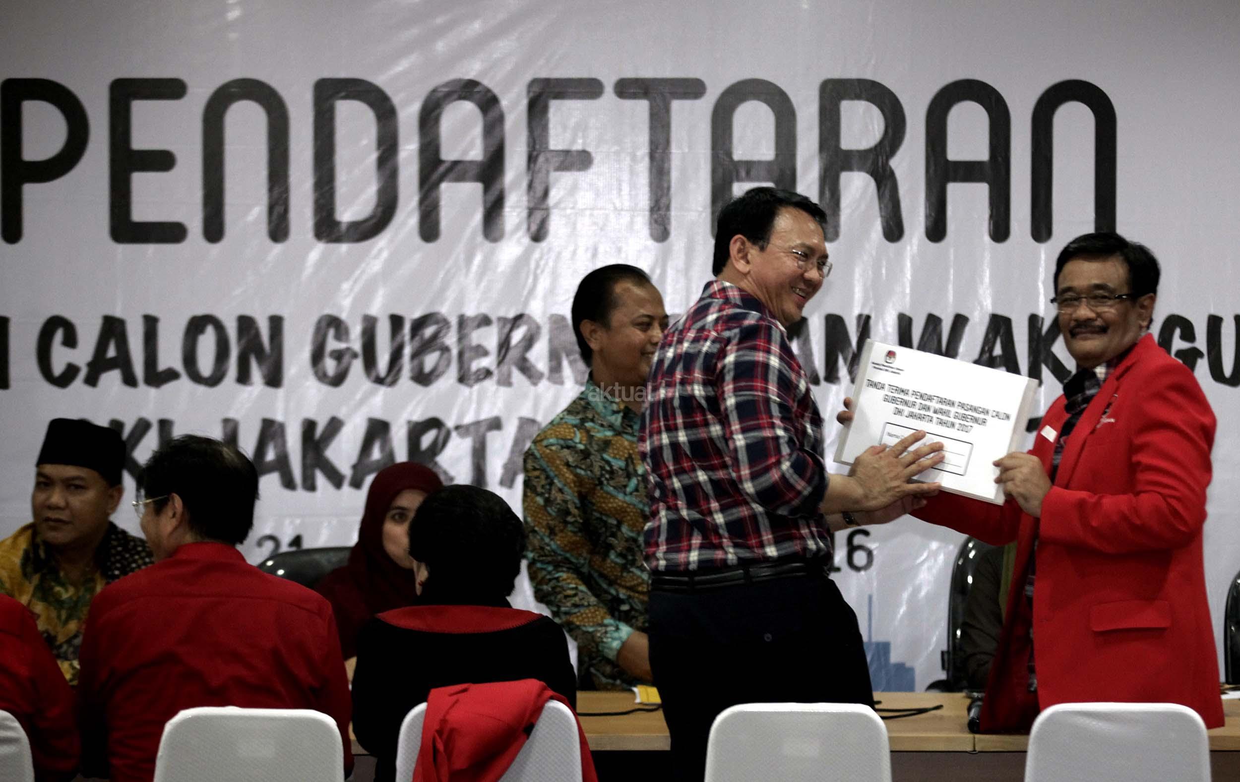 Pasangan Ahok dan Djarot resmi mendaftar ke KPU DKI Jakarta dengan diusung oleh Partai Demokrasi Indonesia Perjuangan (PDIP), Golkar, Nasdem dan Hanura.