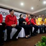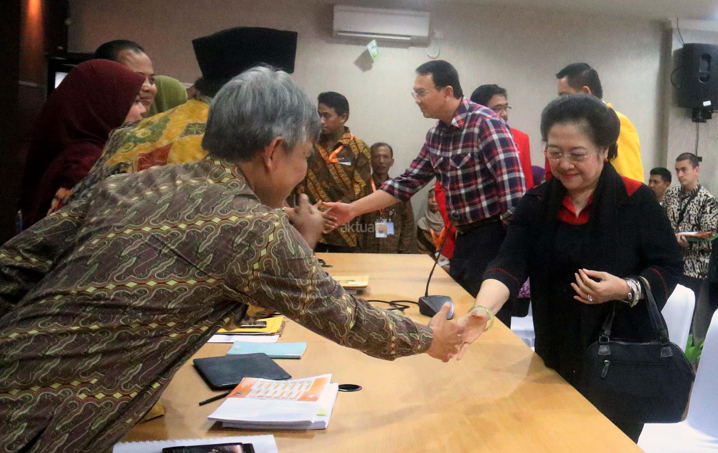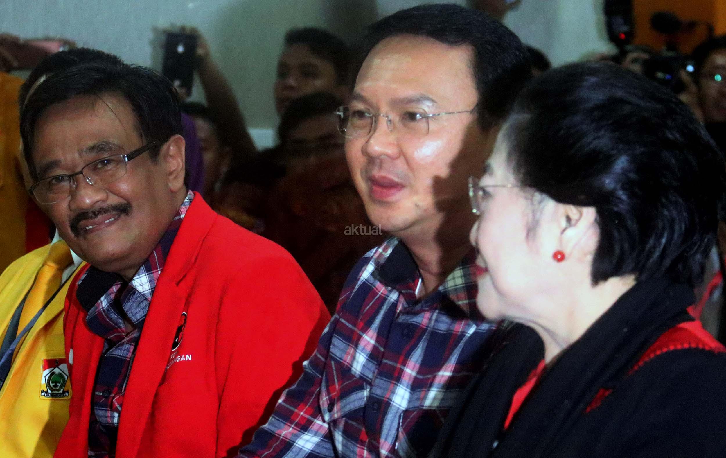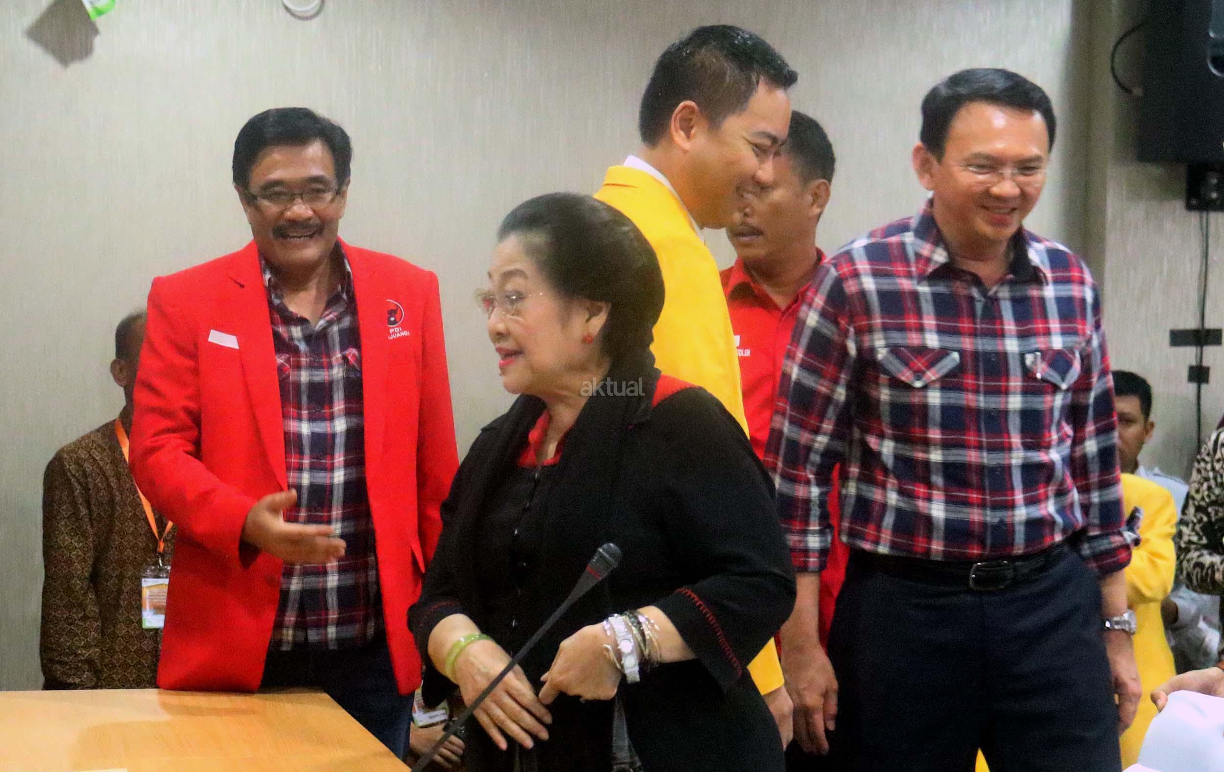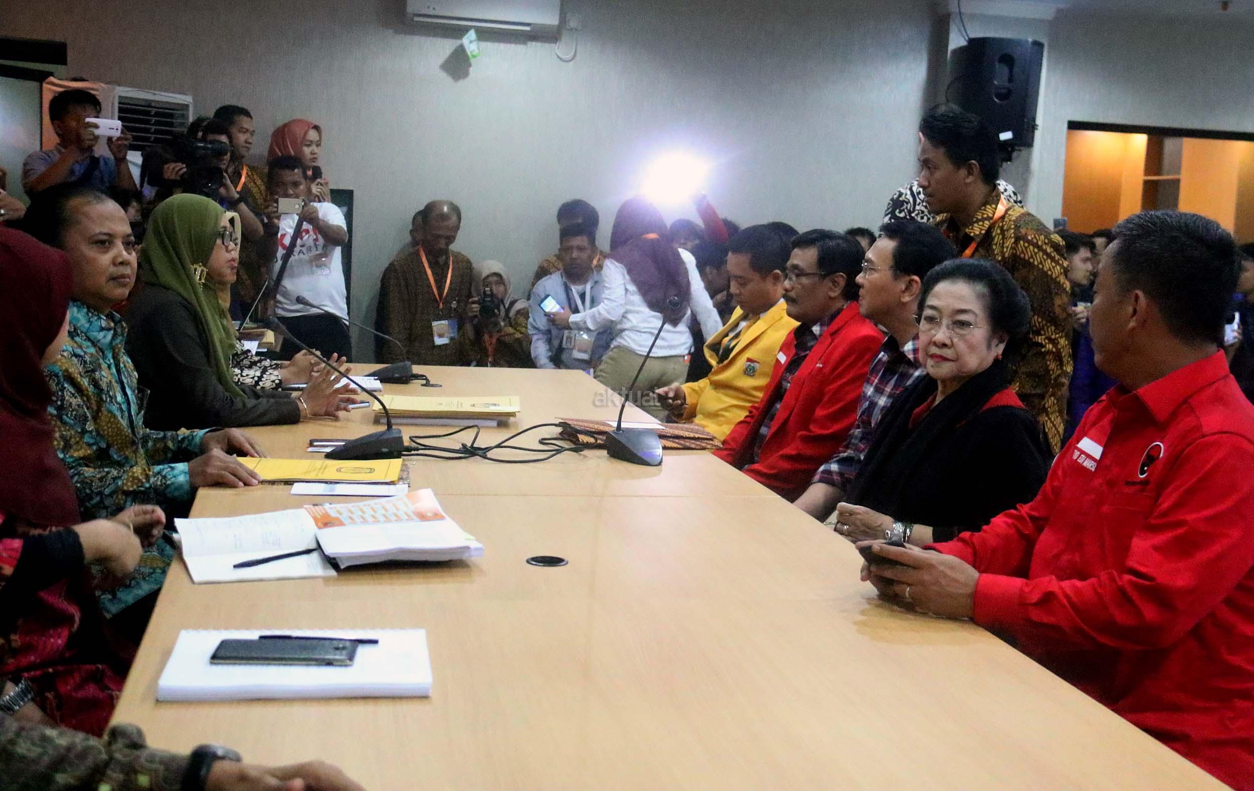 Basuki Tjahaja Purnama (Ahok)-Djarot Saiful Hidayat didampingi Ketum PDIP Megawati Soekarnoputri mengikuti proses pendaftaran calon gubernur dan wakil gubernur pada Pilkada DKI 2017, di KPUD DKI Jakarta, Rabu (21/9/2016). Pasangan Ahok dan Djarot resmi mendaftar ke KPU DKI Jakarta dengan diusung oleh Partai Demokrasi Indonesia Perjuangan (PDIP), Golkar, Nasdem dan Hanura.