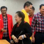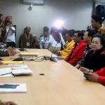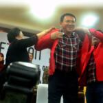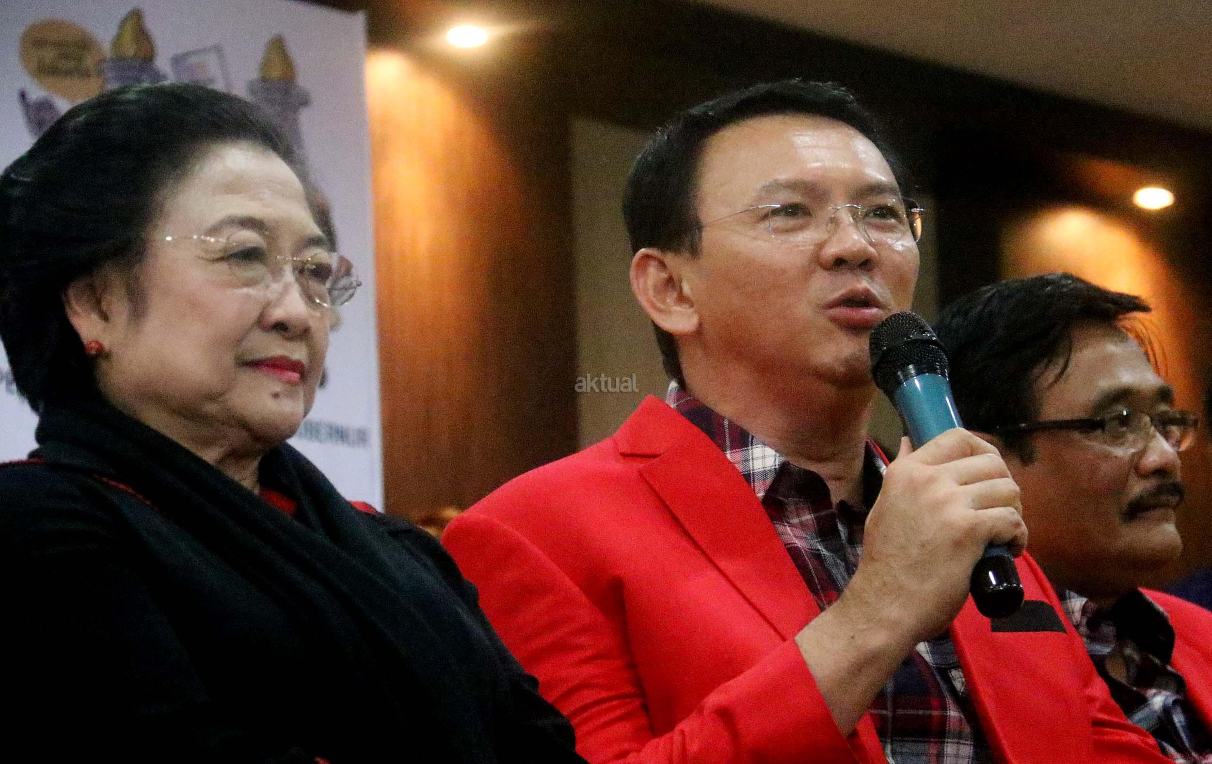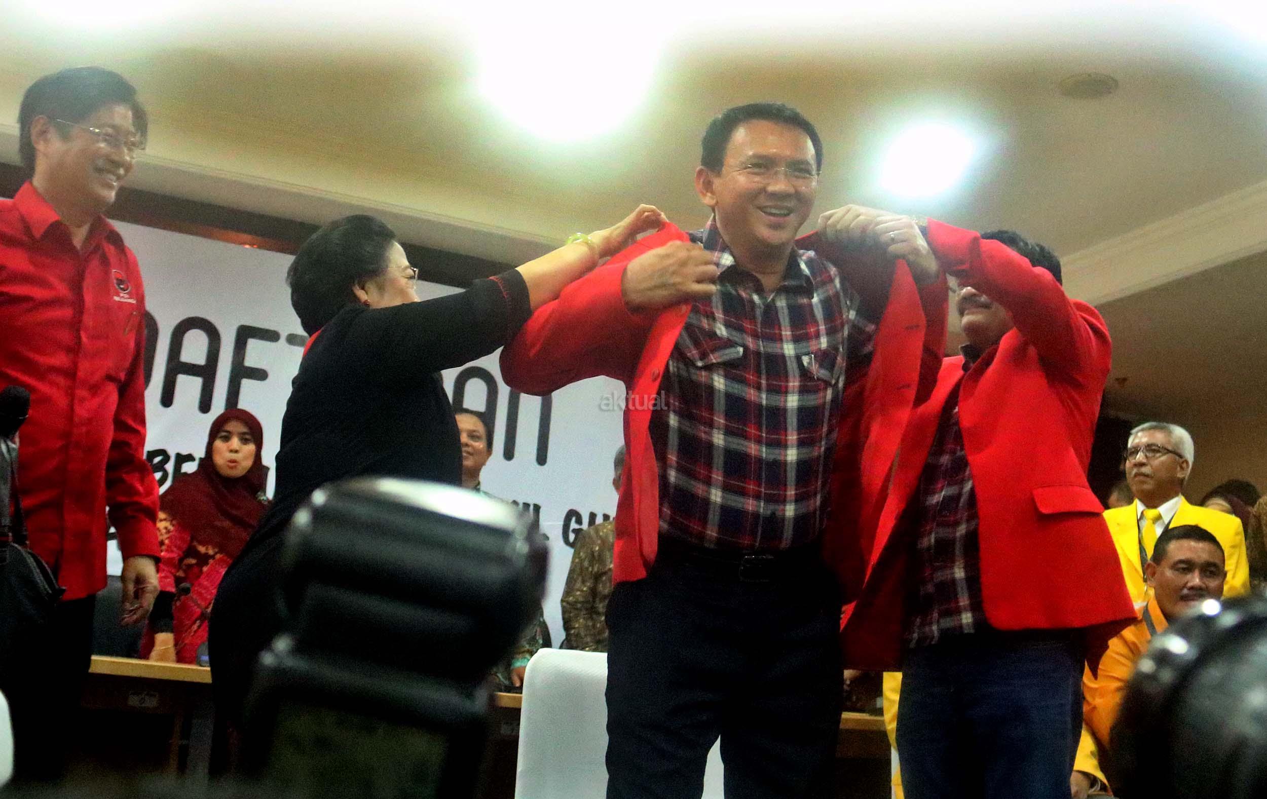 Ketua Umum PDIP Megawati Soekarnoputri bersama Calon Wakil Gubernur DKI Jakarta Petahana Djarot Saiful Hidayat mengenakan jas partai kepada Calon gubernur DKI Jakarta Petahana Basuki Tjahaja Purnama (Ahok) saat melakukan pendaftaran di Kantor KPUD DKI Jakarta, Salemba, Rabu (21/9/2016). Pasangan Ahok dan Djarot resmi mendaftar ke KPU DKI Jakarta dengan diusung oleh Partai Demokrasi Indonesia Perjuangan (PDIP), Golkar, Nasdem dan Hanura.