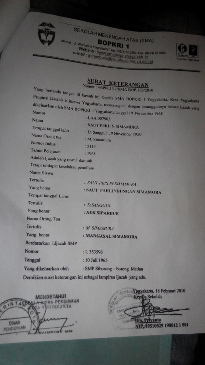 Surat Keterangan SMA BOPKRI 1 DI Yogyakarta, Ist