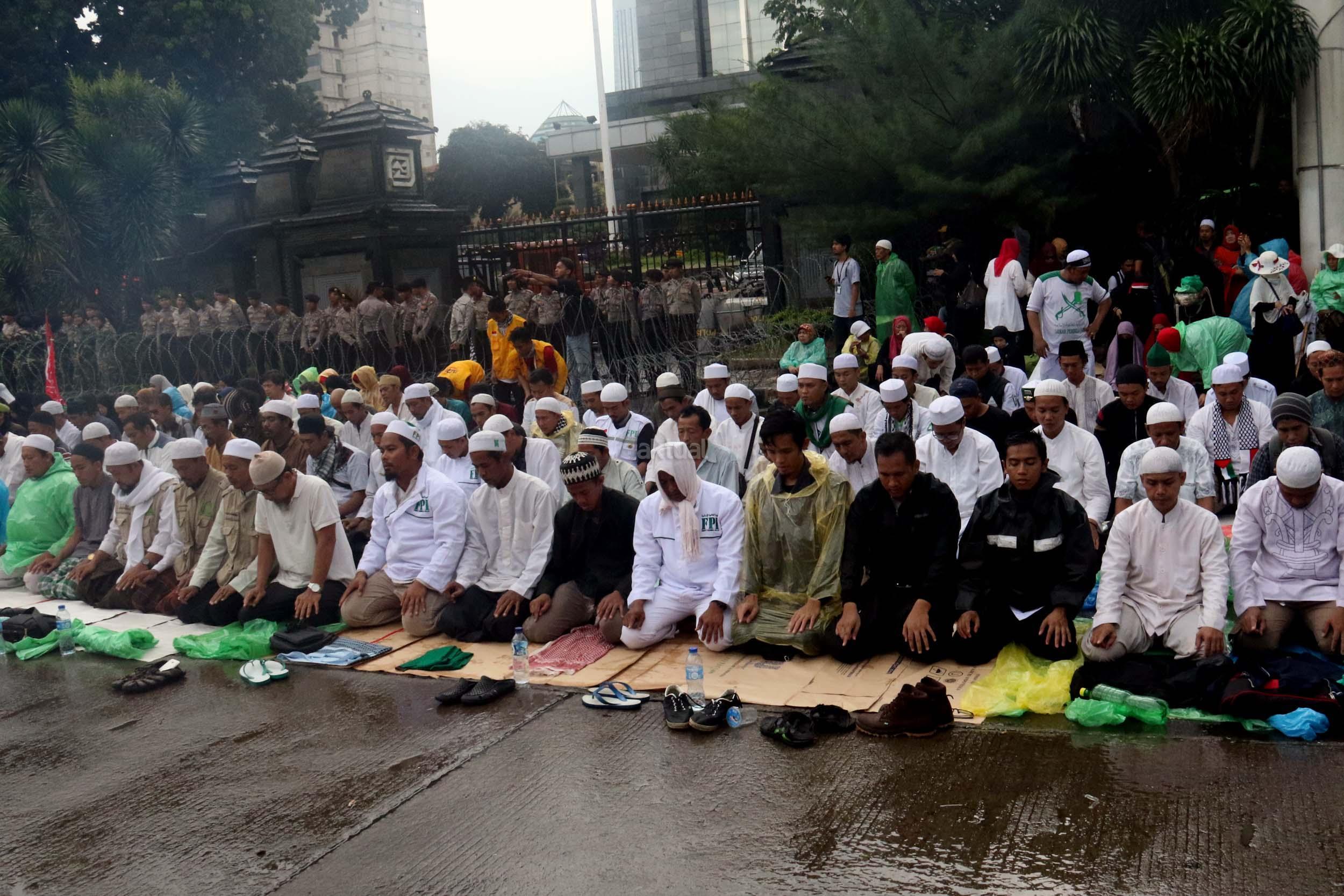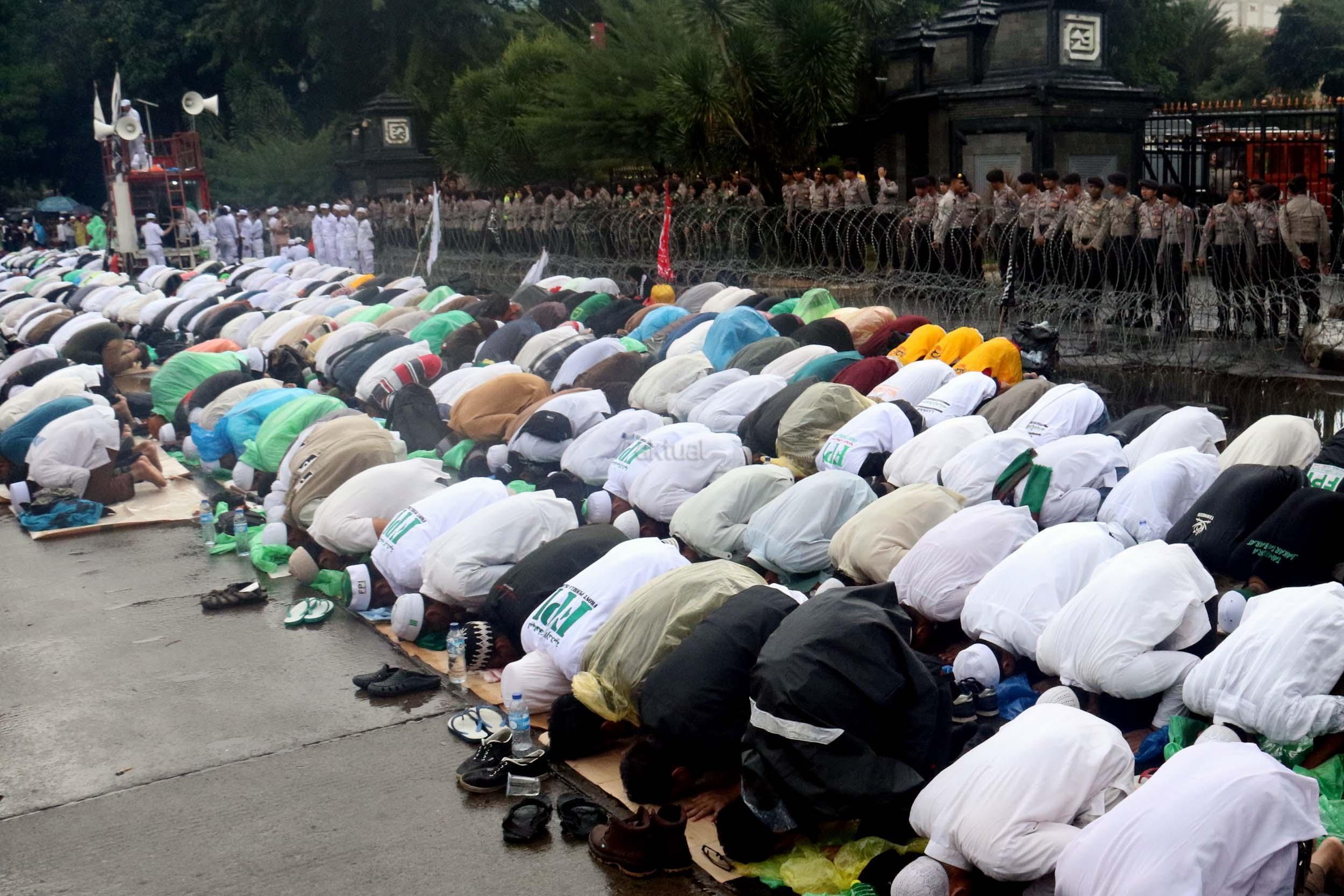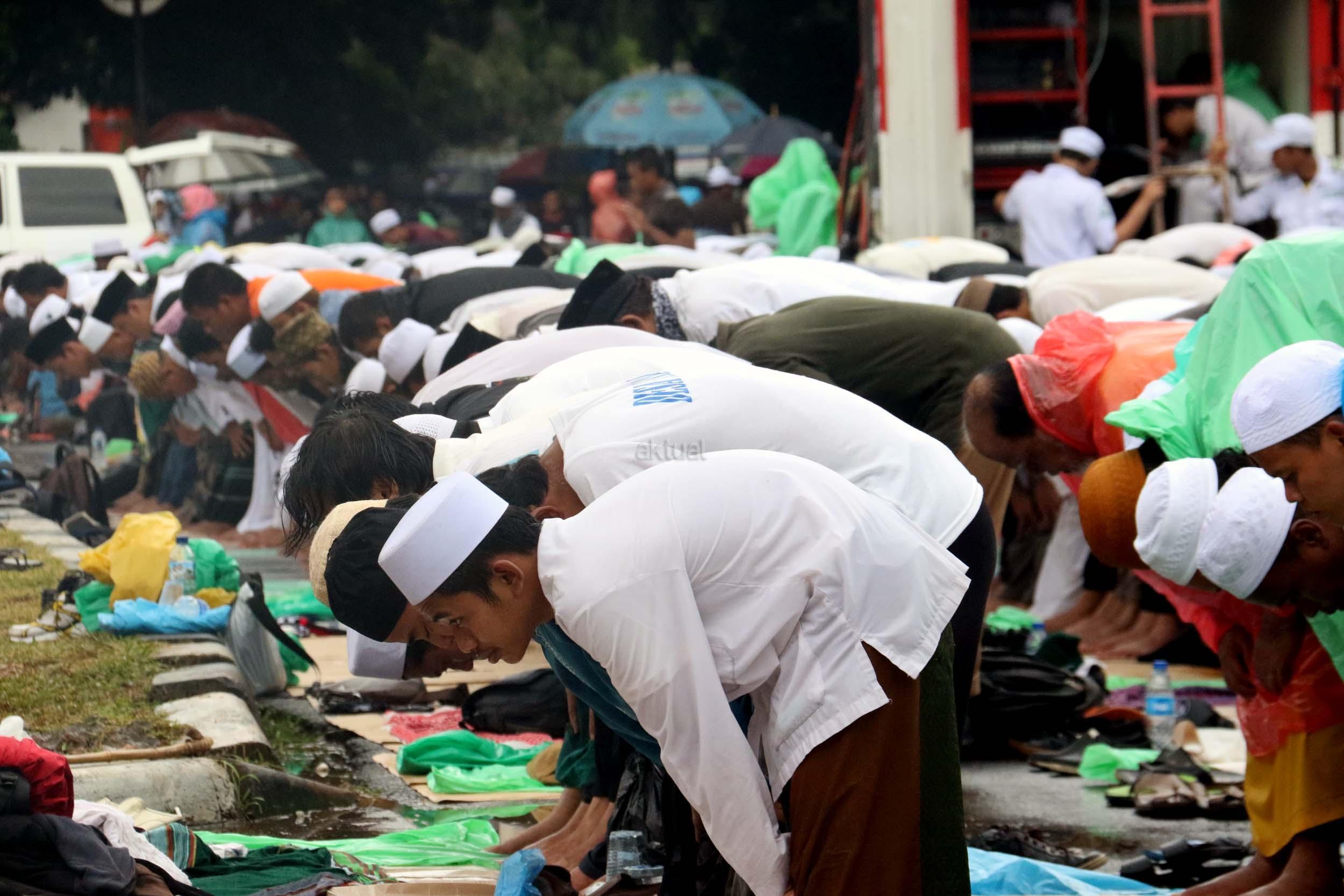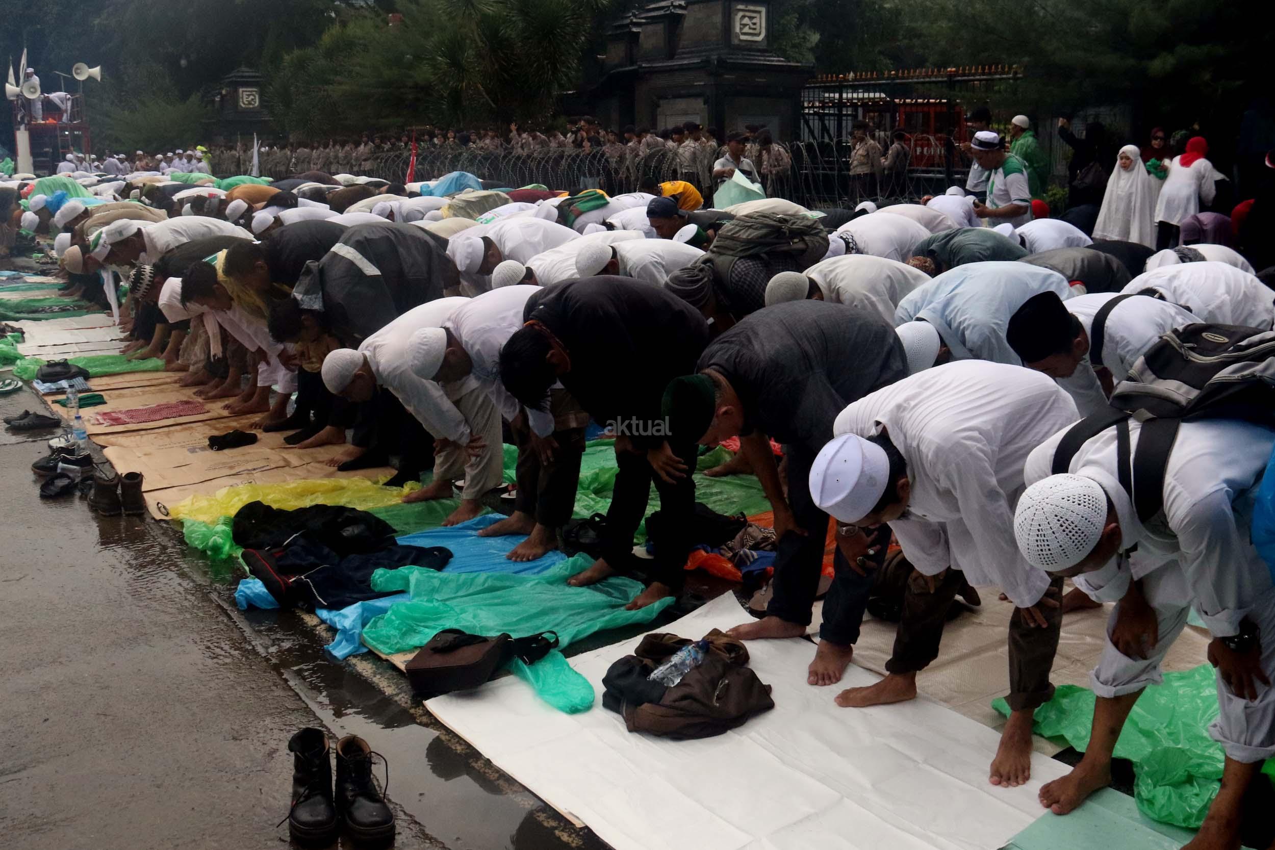 Diguyur Hujan, Massa Aksi Gelar Salat Dzuhur di Depan Polda Metro