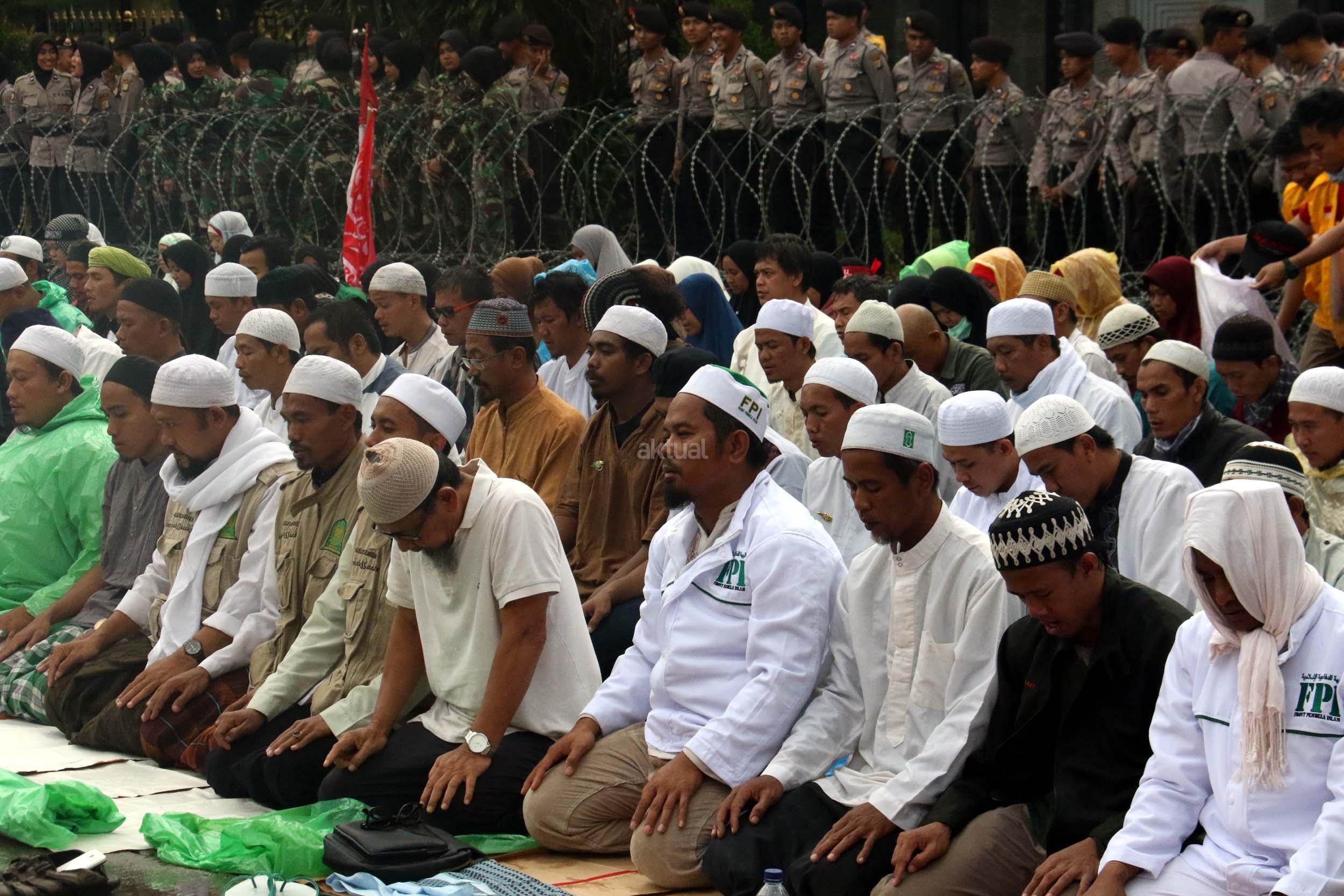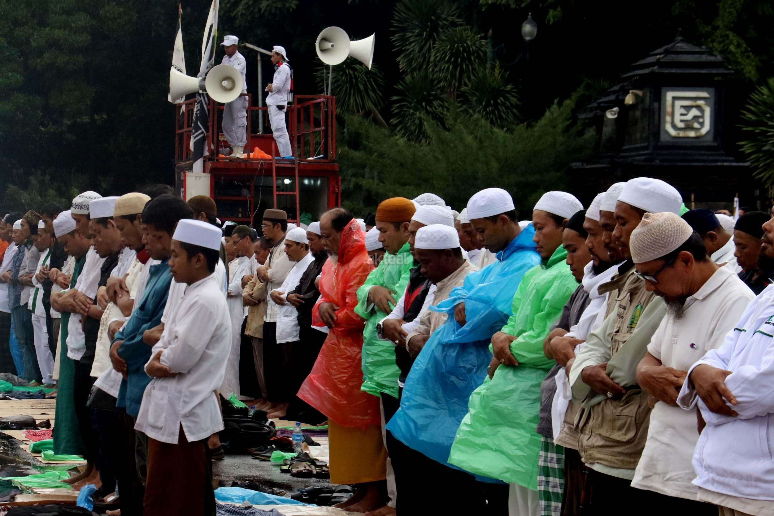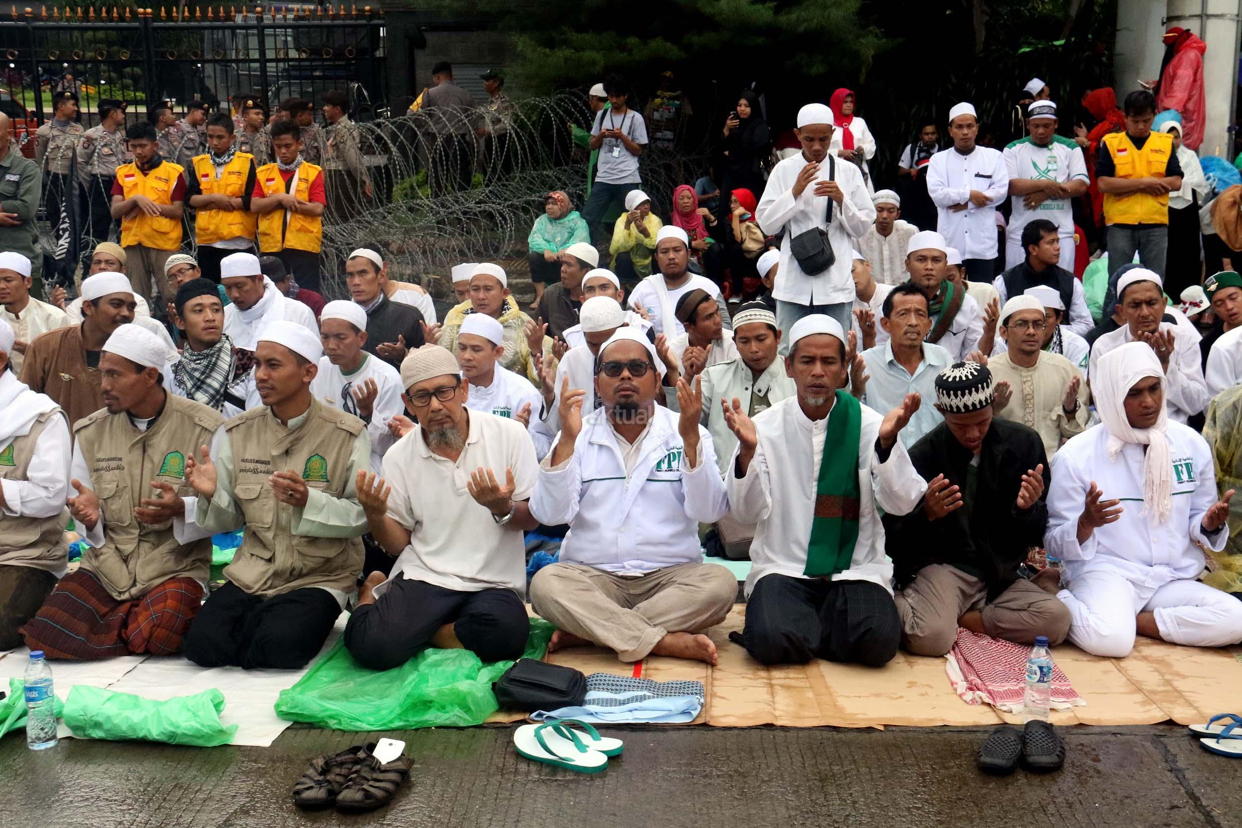 Diguyur Hujan, Massa Aksi Gelar Salat Dzuhur di Depan Polda Metro
