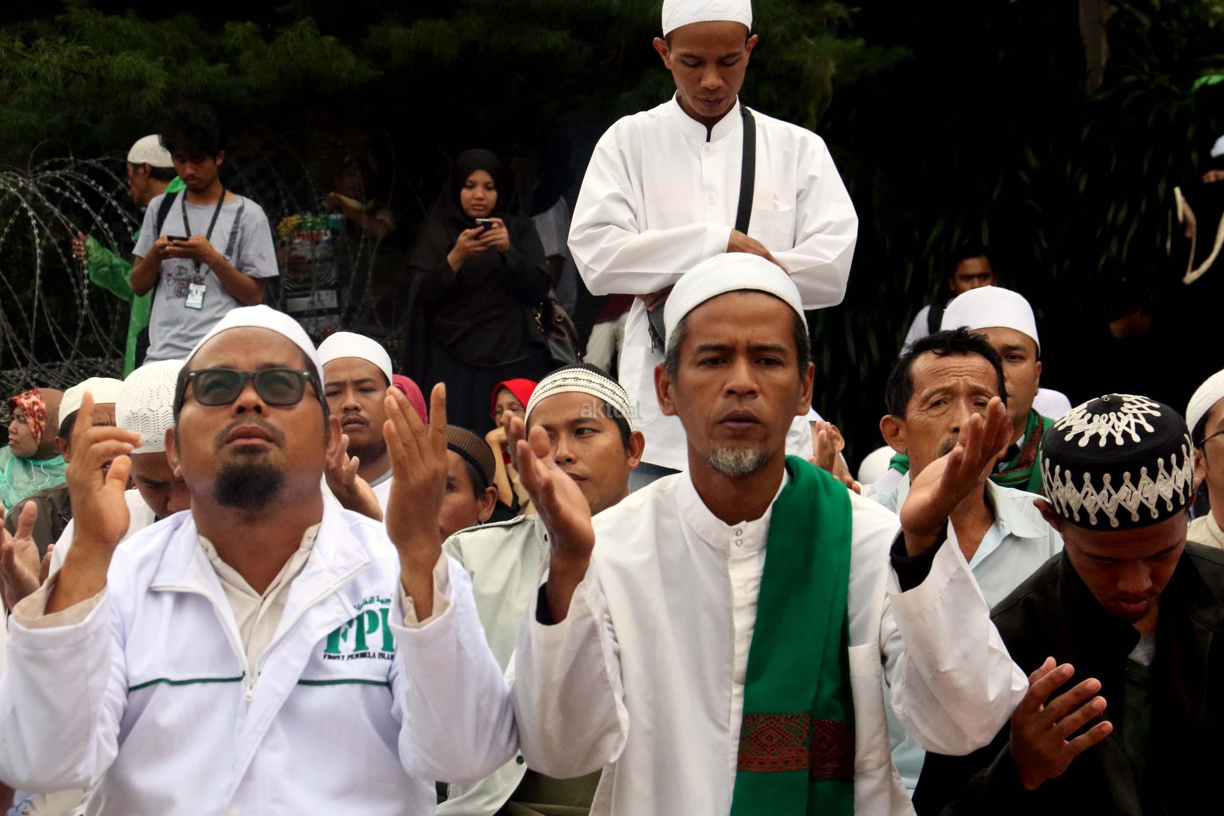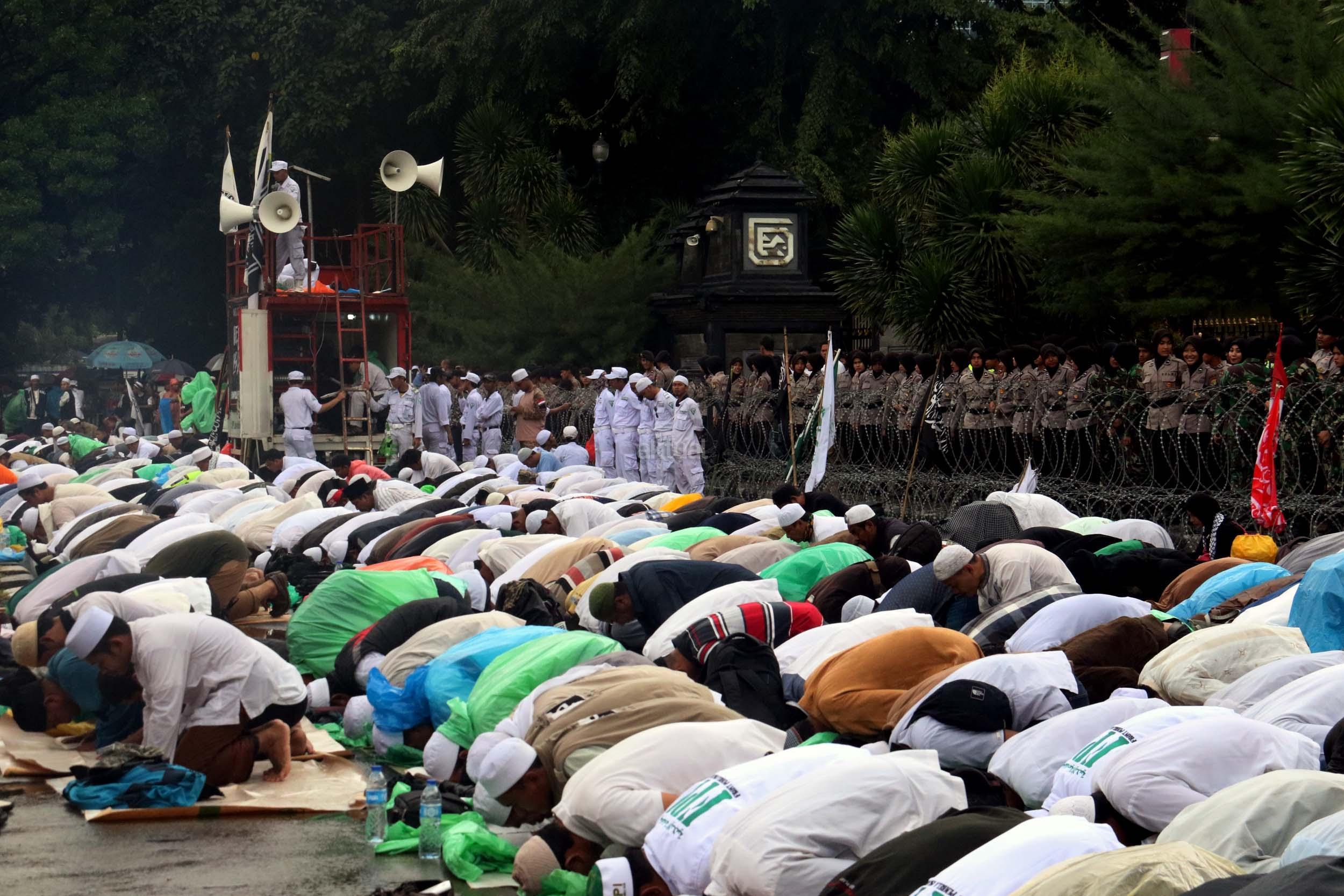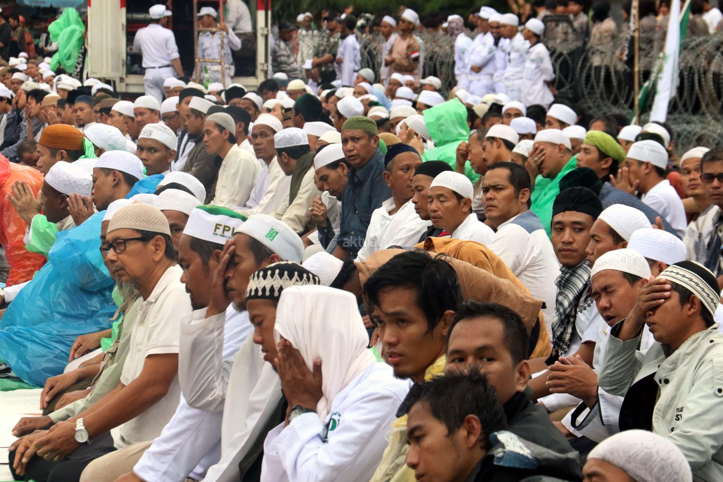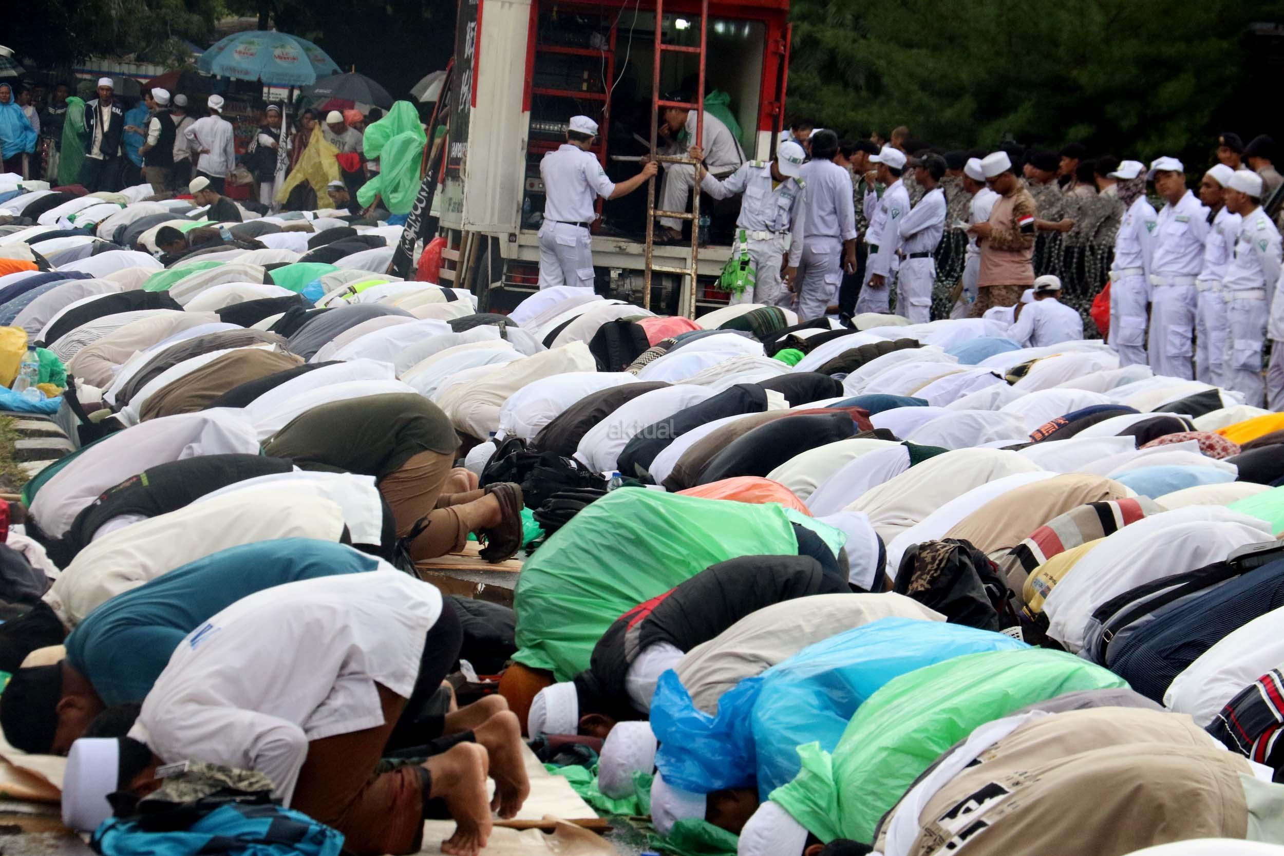 Diguyur Hujan, Massa Aksi Gelar Salat Dzuhur di Depan Polda Metro