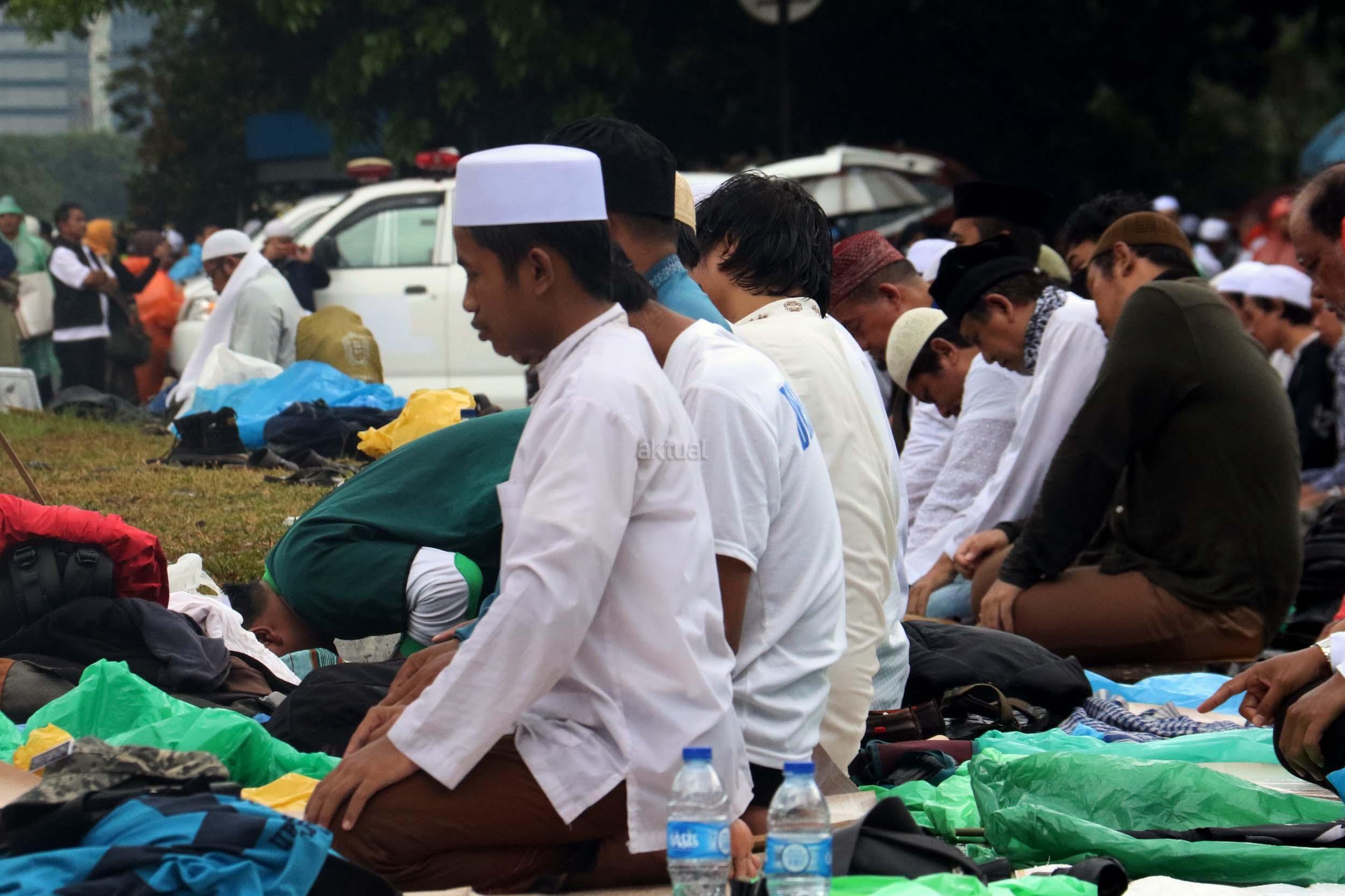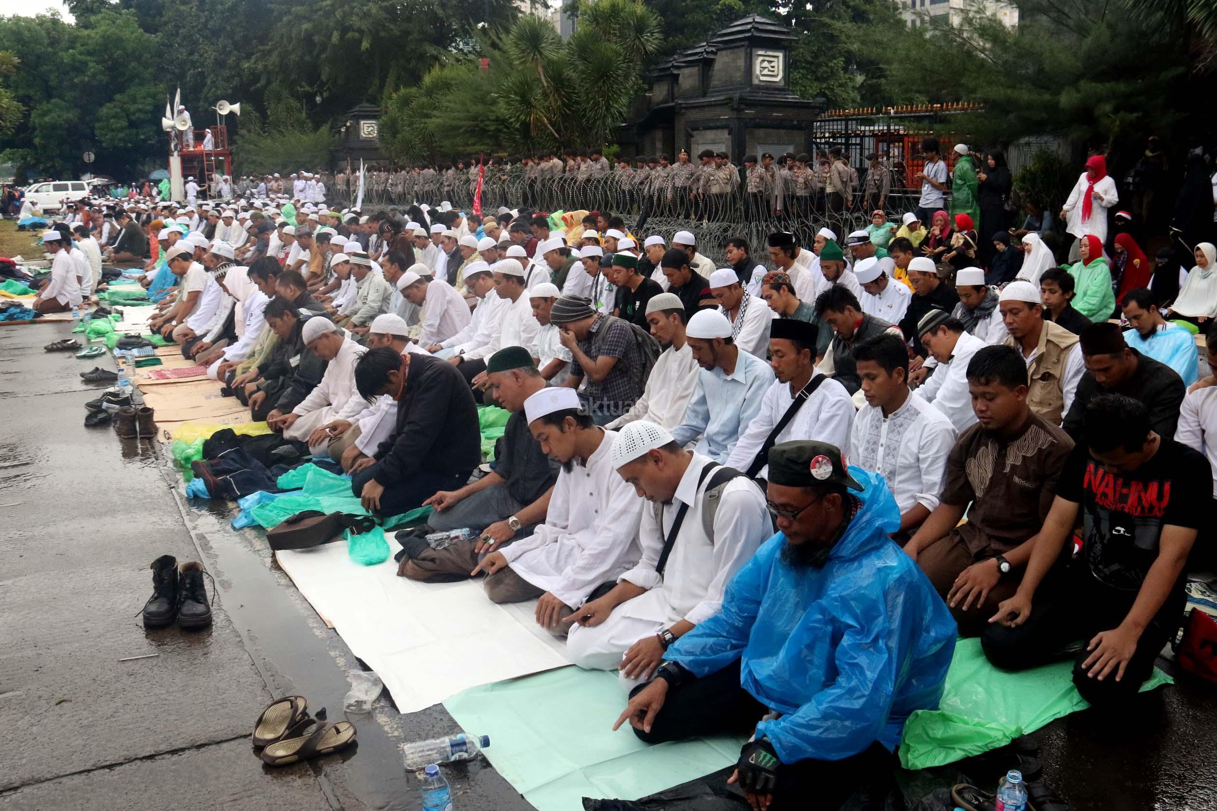 Memasuki waktu Salat Dzuhur, ratusan umat muslim yang menggelar aksi demonstrasi melaksanakan salat berjamaah di Jalan Jenderal Sudirman, di depan Mapolda Metro Jaya, Jakarta, Rabu (01/1/2017). Polda Metro Jaya memanggil imam besar FPI Habib Rizieq Shihab, Sekretaris Jenderal FPI Munarman, dan Ketua Gerakan Nasional Pengawal Fatwa Majelis Ulama Indonesia (GNPF-MUI) Bachtiar Nasir untuk dimintai keterangannya terkait kasus pemufakatan makar yang menjerat Sri Bintang Pamungkas. AKTUAL/Munzir