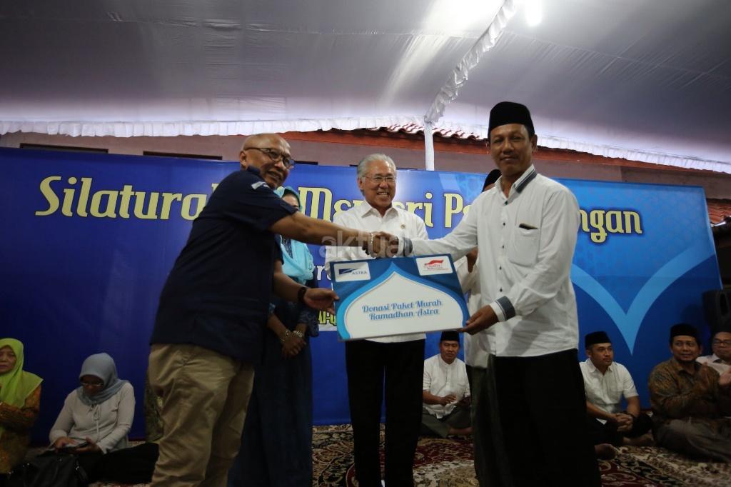 Menteri Perdagangan RI Enggartiasto Lukita menyaksikan penyerahan secara simbolis penyerahan hasil donasi Pasar Murah Ramadhan Astra oleh Chief of Corporate Communications, Social Responsibility & Security PT Astra International Tbk Pongki Pamungkas kepada Pengasuh Pondok Pesantren Al Qur'annyy Az-Zayadiyy Gus Mad di Solo, Jawa Tengah, Minggu (18/6). AKTUAL/ASTRA