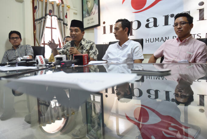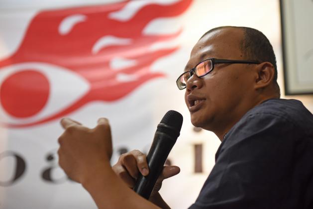 Peneliti ELSAM Wahyudi Djafar (kiri), Direktur Eksekutif Lingkar Madani (LIMA) Indonesia Ray Rangkuti (kedua kiri), Direktur Imparsial Al Araf (kedua kanan) dan Direktur program Transparency International Indonesia Ilham yang tergabung dalam Koalisi Masyarakat Sipil memberikan keterangan terkait dinamika pergantian Kapolri di Jakarta, Minggu (19/6). Koalisi Masyarakat Sipil berharap DPR segera melakukan 'fit and proper test' sebelum masa reses terhadap calon Kapolri Komjen Pol Tito Karnavian yang diajukan presiden. ANTARA FOTO/Wahyu Putro A/foc/16.