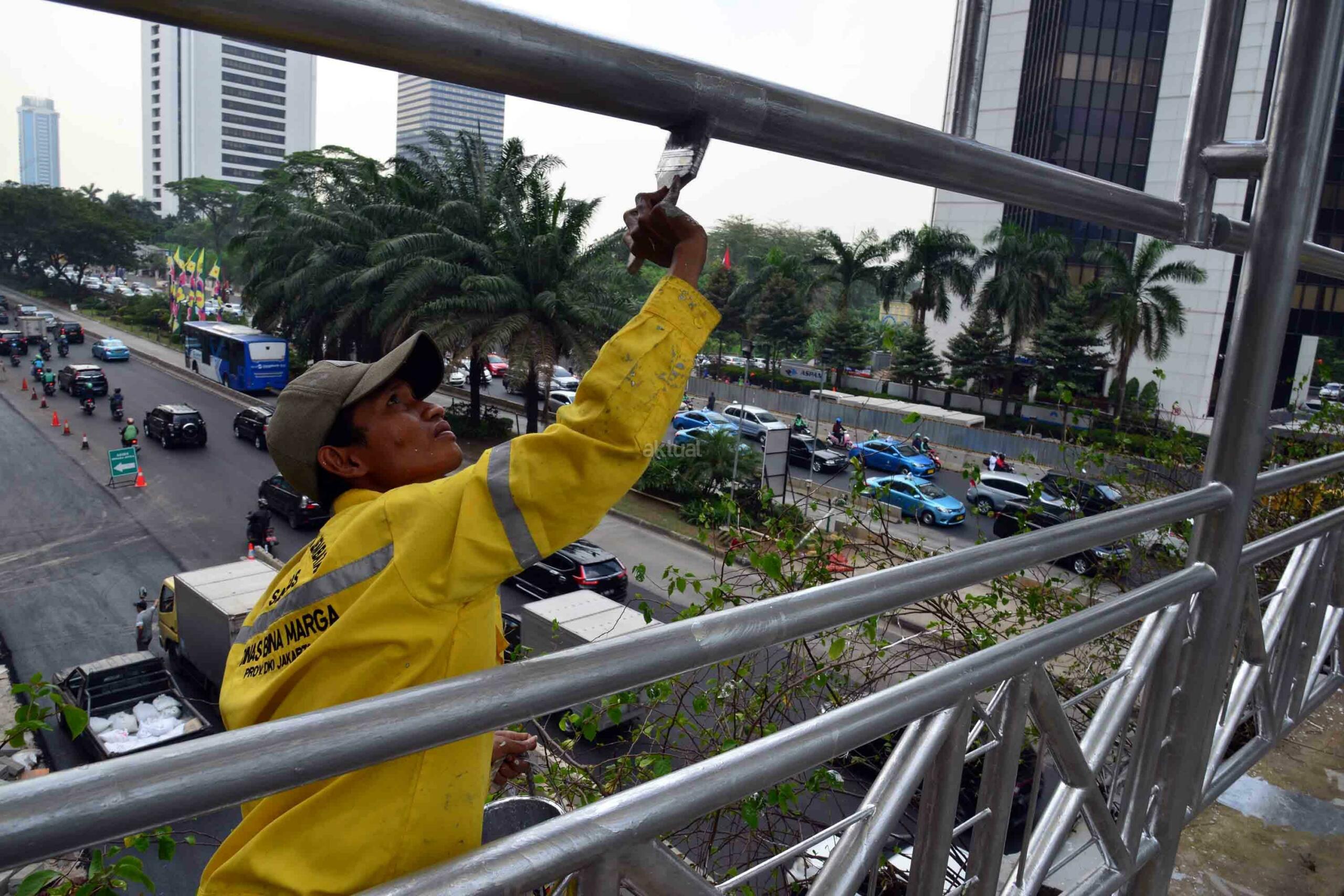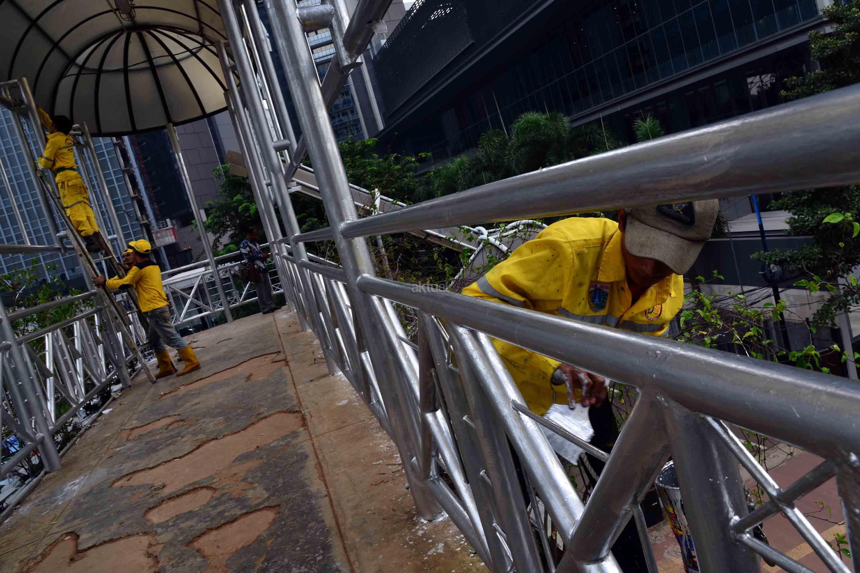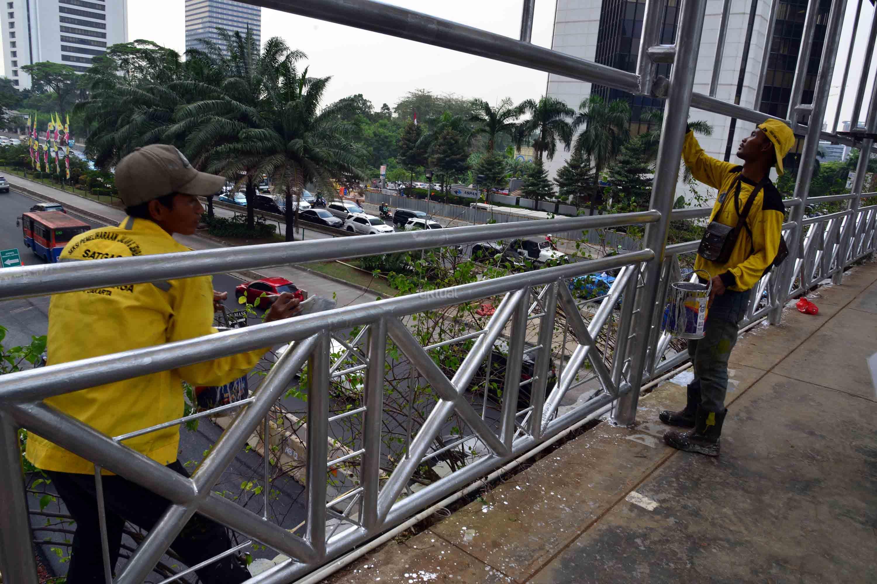 Petugas Dinas Bina Marga DKI tengah mempercantik JPO di kawasan Sudirman, Jakarta, Sabtu (7/72018). Pekerjaan tersebut dilakukan dalam rangka menyambut perhelatan Asian Games 2018. AKTUAL/Tino Oktaviano