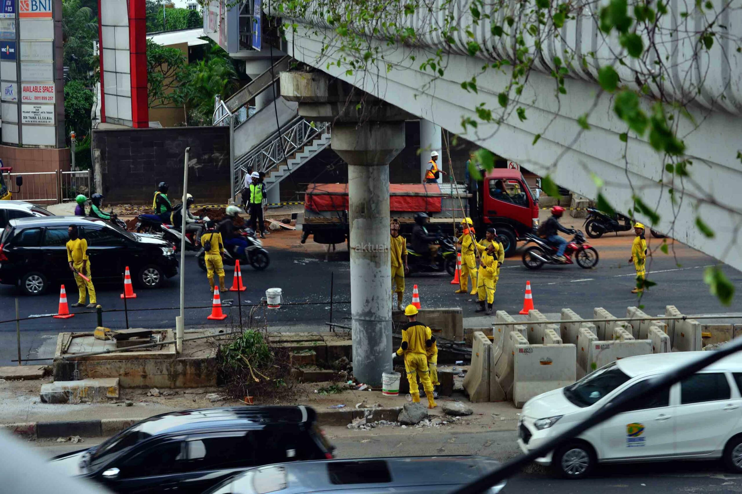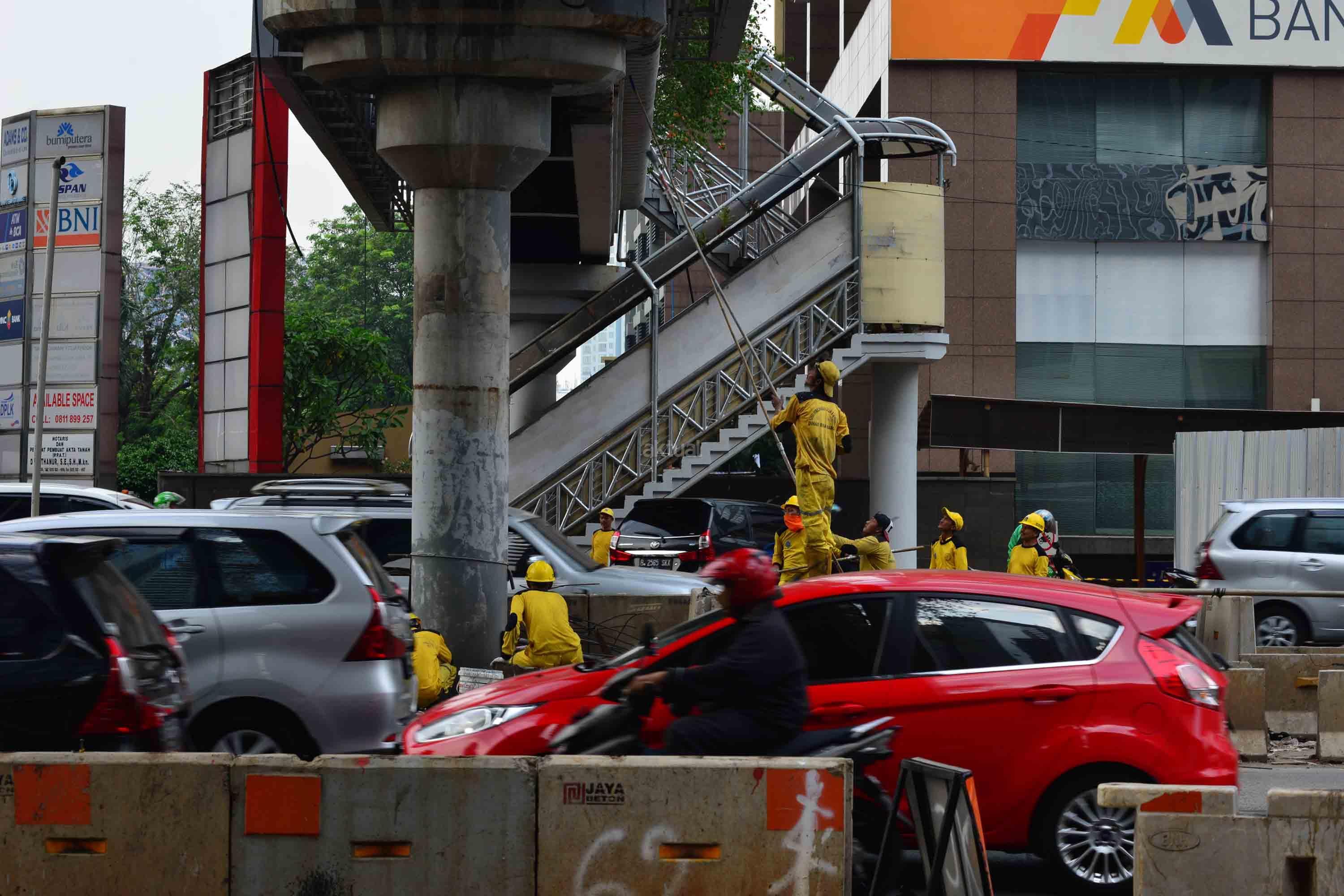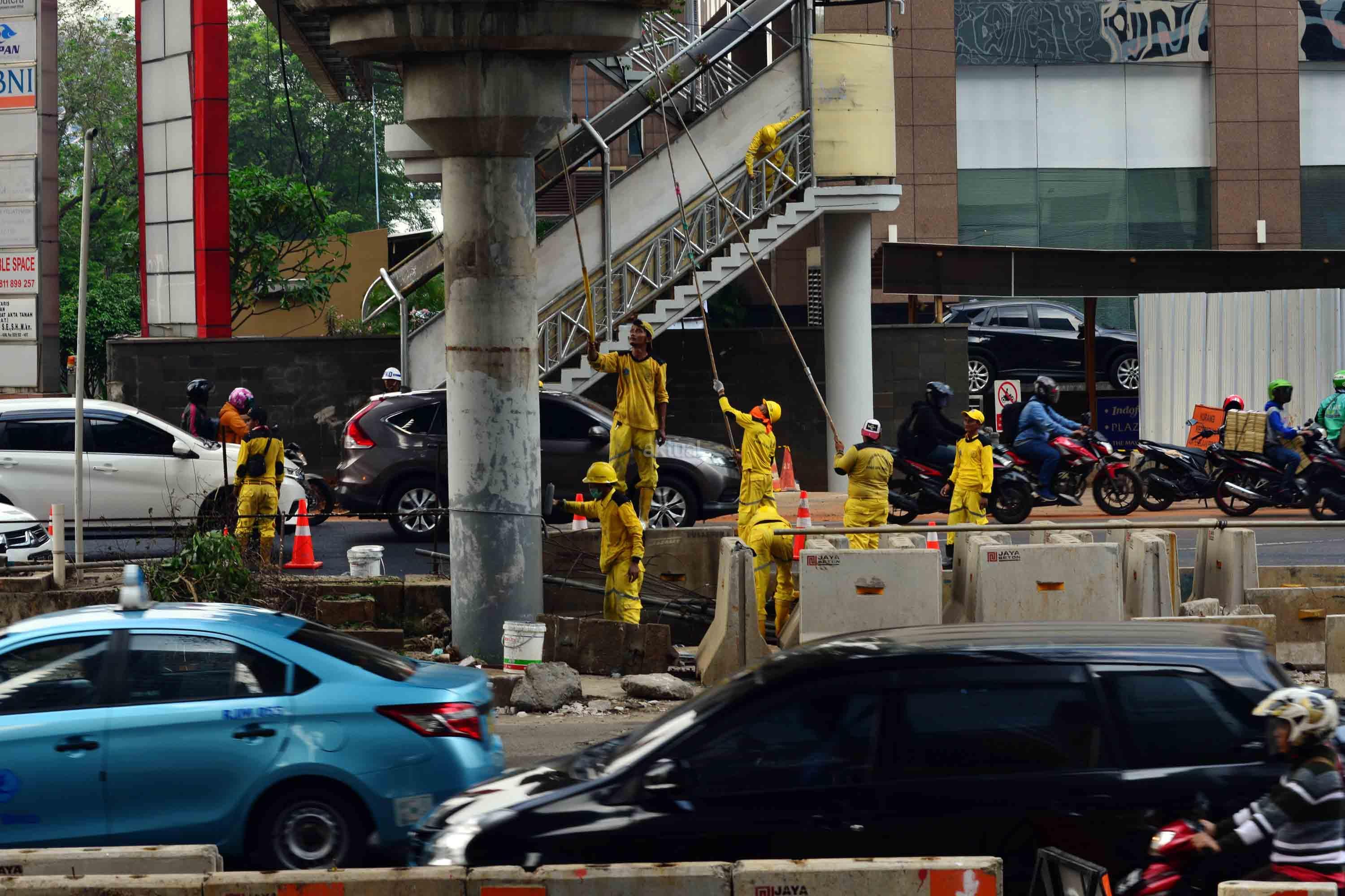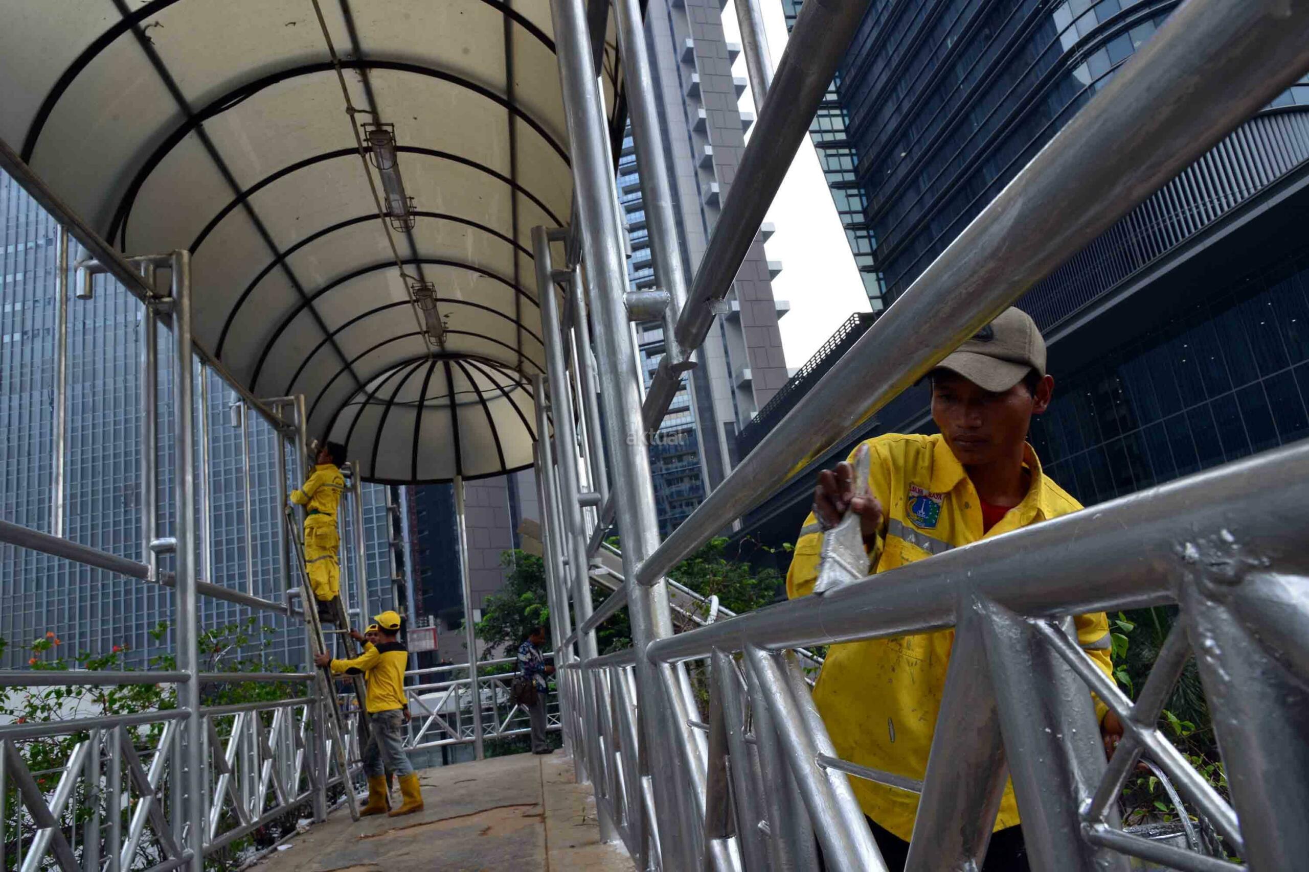 Petugas Dinas Bina Marga DKI tengah mempercantik JPO di kawasan Sudirman, Jakarta, Sabtu (7/72018). Pekerjaan tersebut dilakukan dalam rangka menyambut perhelatan Asian Games 2018. AKTUAL/Tino Oktaviano