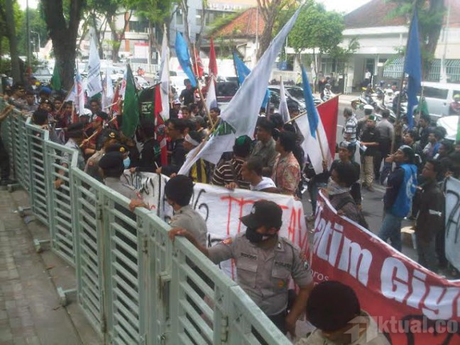 Surabaya, Aktual.co — Puluhan mahasiswa dari berbagai kampus di Jawa Timur menggelar aksi protes kebijakan kenaikan Bahan Bakar Minyak (BBM), di depan kantor Perwakilan SKK Migas Jawa Bali dan Nusa Tenggara, di Jalan Panglima Sudirman, Surabaya, Kamis (27/11).