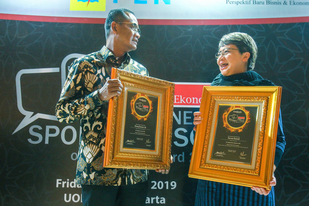 Direktur Komunikasi Lippo Group Danang Kemayan Jati (kiri) dan Corporate Secretary PT Intiland Development Tbk Theresia Rustandi menerima penghargaan Indonesia Spokesperson of The Year Award 2019, Jakarta, Jumat (15/3). AKTUAL/Dok Lippo Group