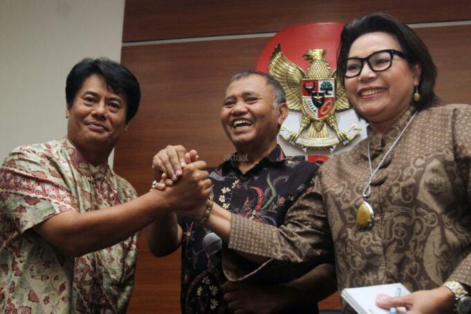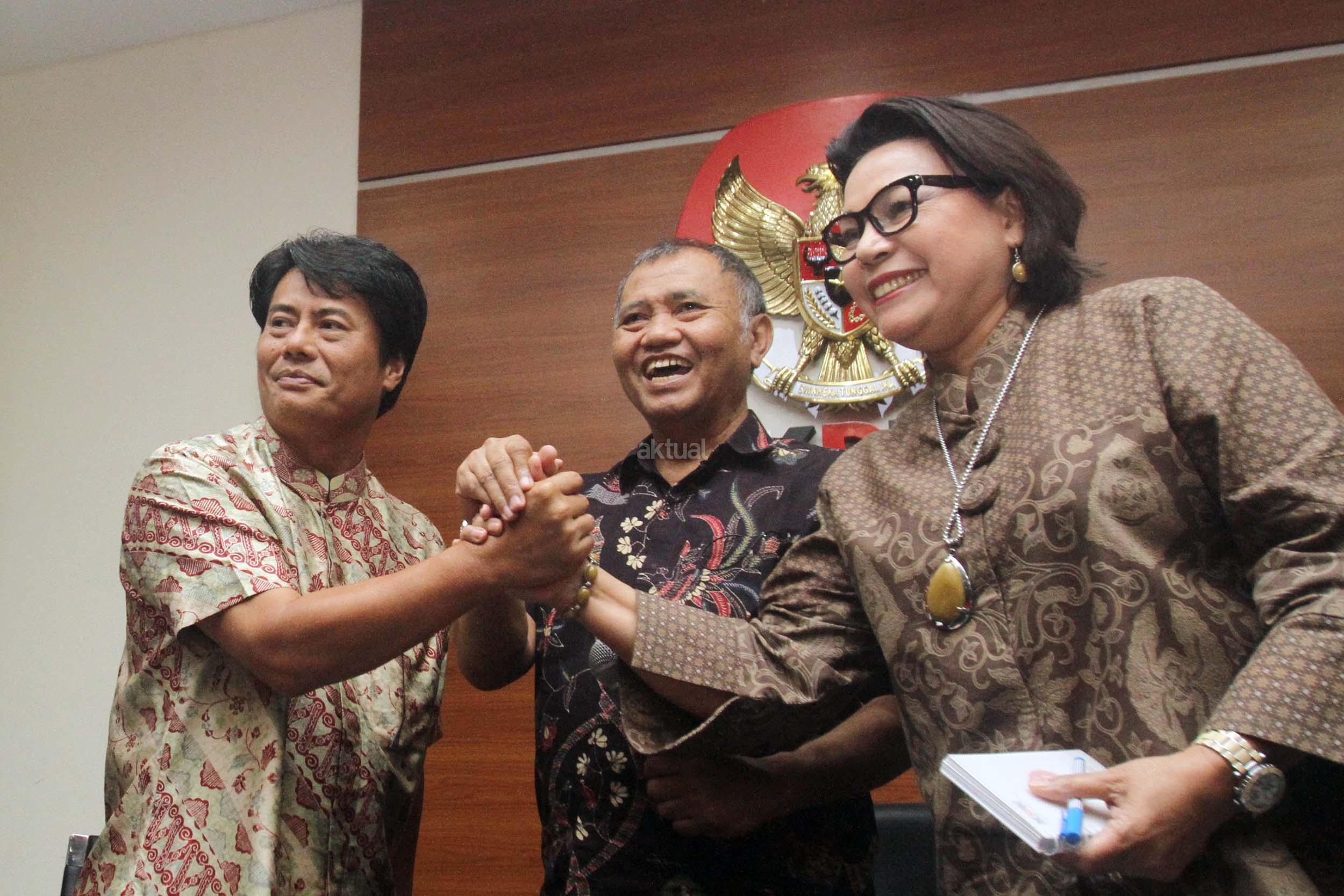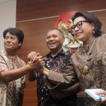 Ketua KPK Agus Rahardjo (tengah), bersama Pimpinan KPK Basaria Panjaitan (kanan), mendampingi Direktur Utama (Dirut) PT Pertamina (Persero) Elia Massa Manik (kiri), bersalaman usai memberikan keterangan persnya di Gedung KPK, Jakarta, Senin (20/3/2017). Kedatangan Dirut baru Pertamina ke KPK, selain untuk mengenalkan diri juga meminta pendampingan KPK ditiap-tiap proyek-proyek Pertamina. AKTUAL/Munzir