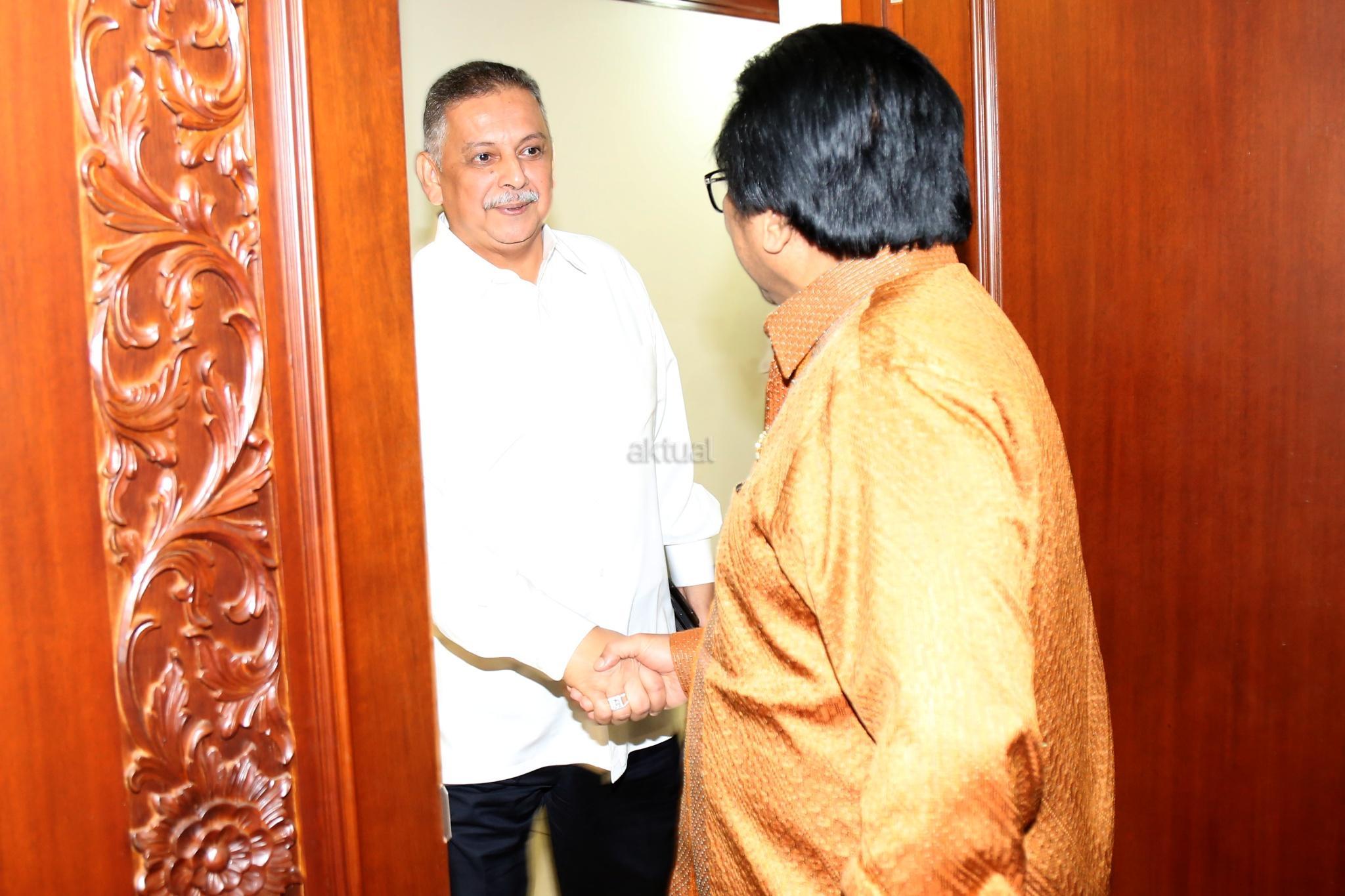 Ketua DPD Oesman Sapta (kiri) berbincang dengan Direktur Utama Perusahaan Listrik Negara ( PLN) Sofyan Basir saat melakukan pertemuan di kompleks Parlemen, Senayan, Jakarta, Senin (19/6). Pertemuan tersebut meminta penjelasan PLN terkait tarif listrik tidak pernah naik sejak 2015 dan pencabutan subsidi listrik oleh Pemerintah bagi yang tidak berhak. AKTUAL/Tino Oktaviano