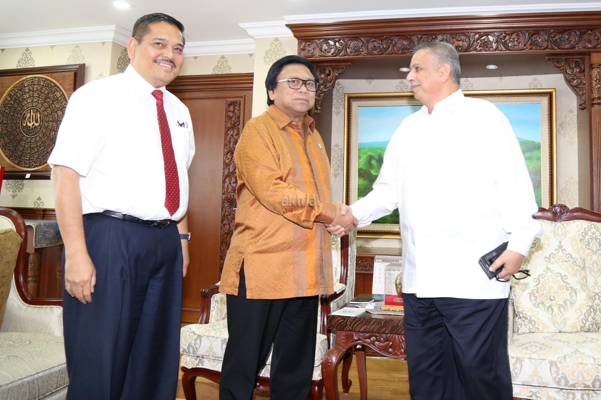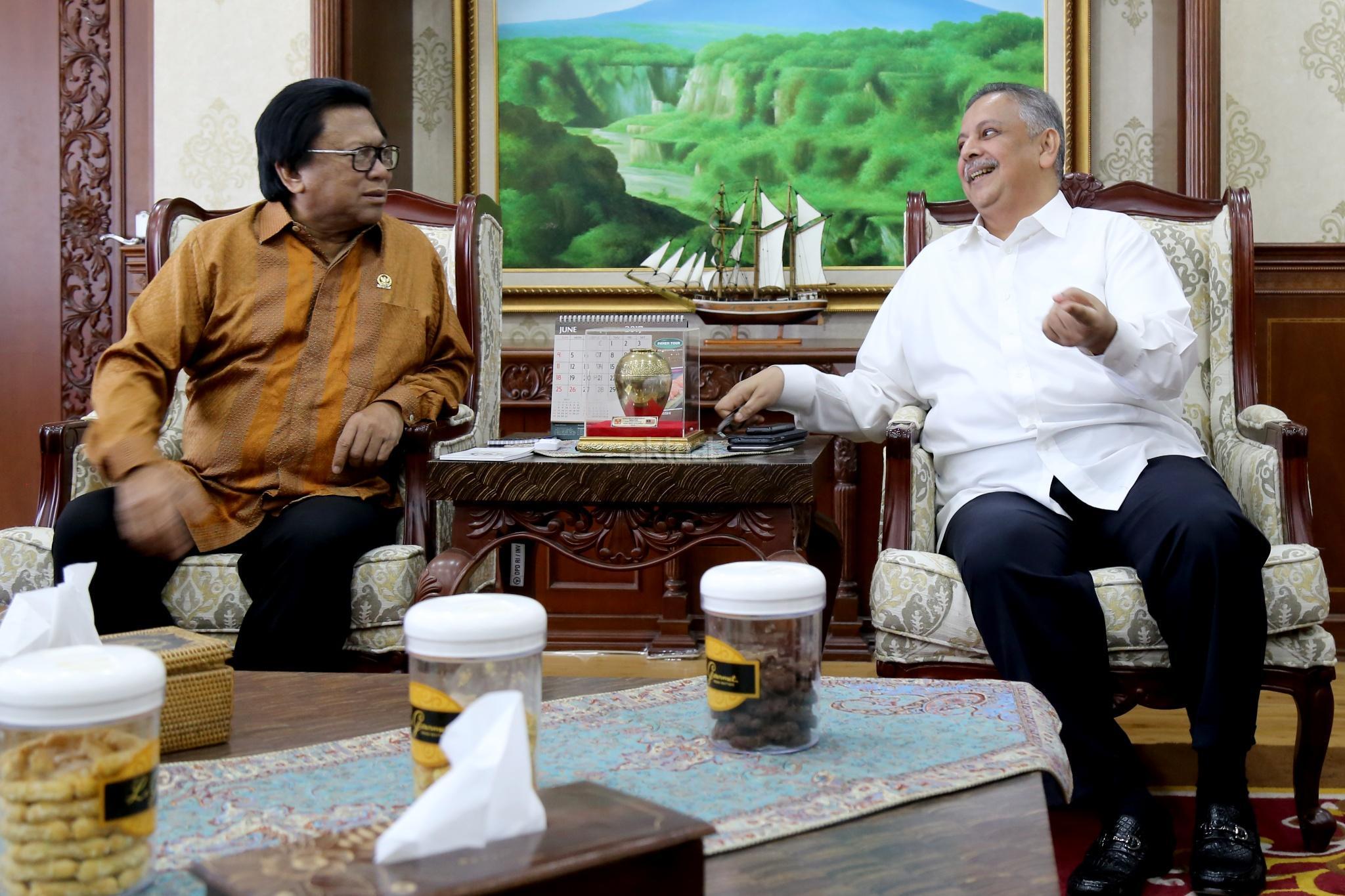 Ketua DPD Oesma Sapta menerima Direktur Utama Perusahaan Listrik Negara ( PLN) Sofyan Basir di kompleks Parlemen, Senayan, Jakarta, Senin (19/6). Pertemuan tersebut meminta penjelasan PLN terkait tarif listrik tidak pernah naik sejak 2015 dan pencabutan subsidi listrik oleh Pemerintah bagi yang tidak berhak. AKTUAL/Tino Oktaviano