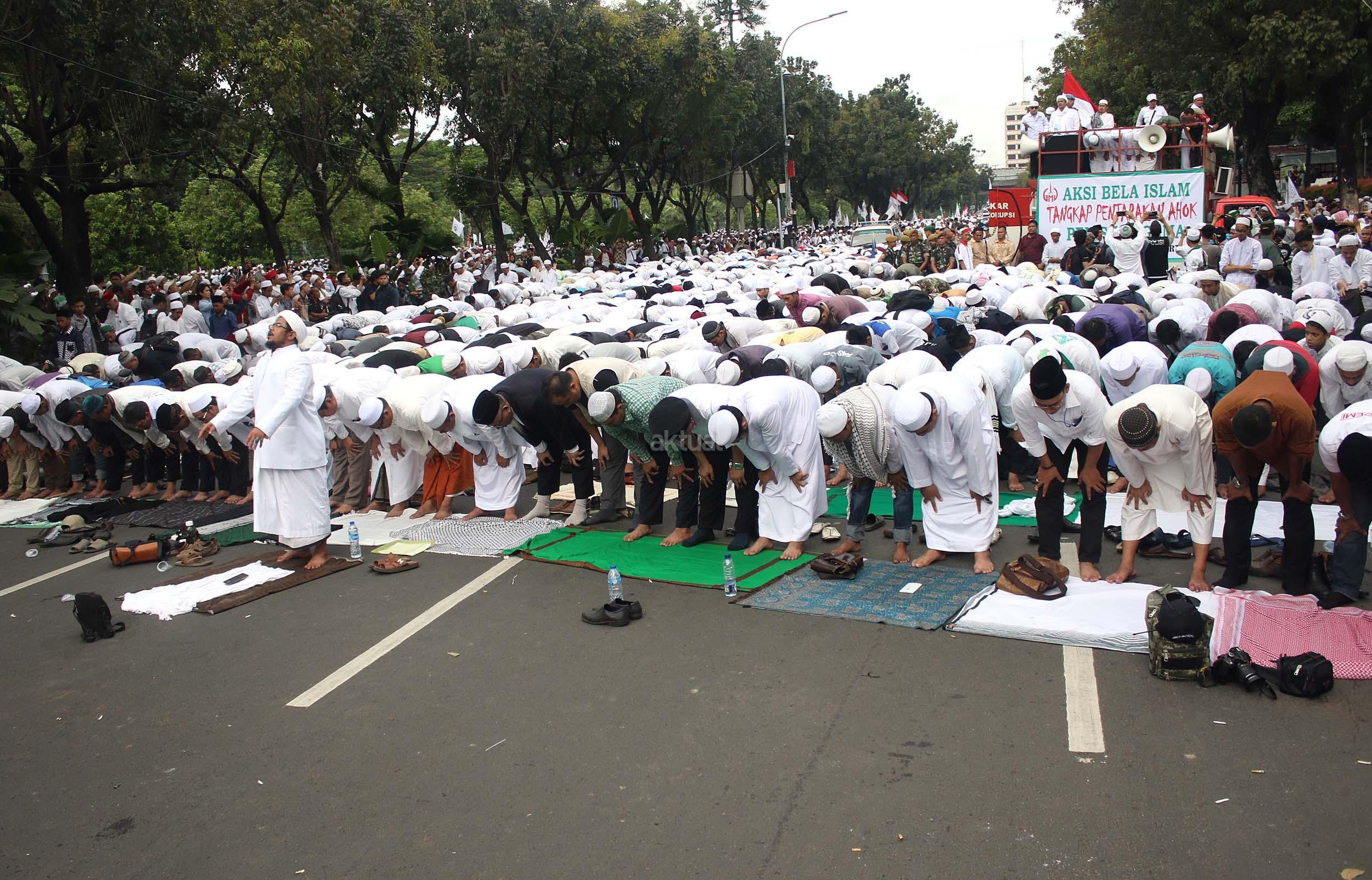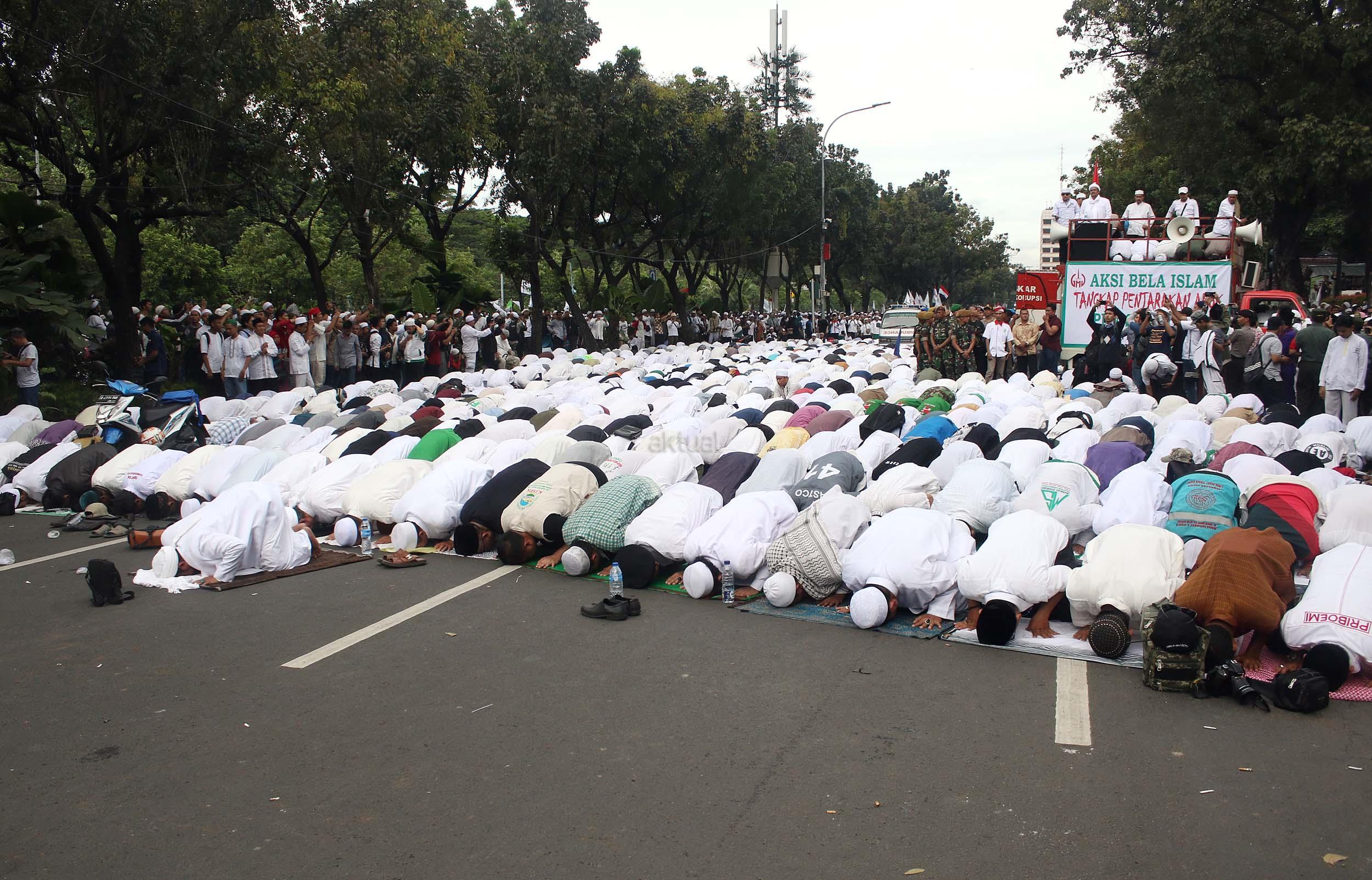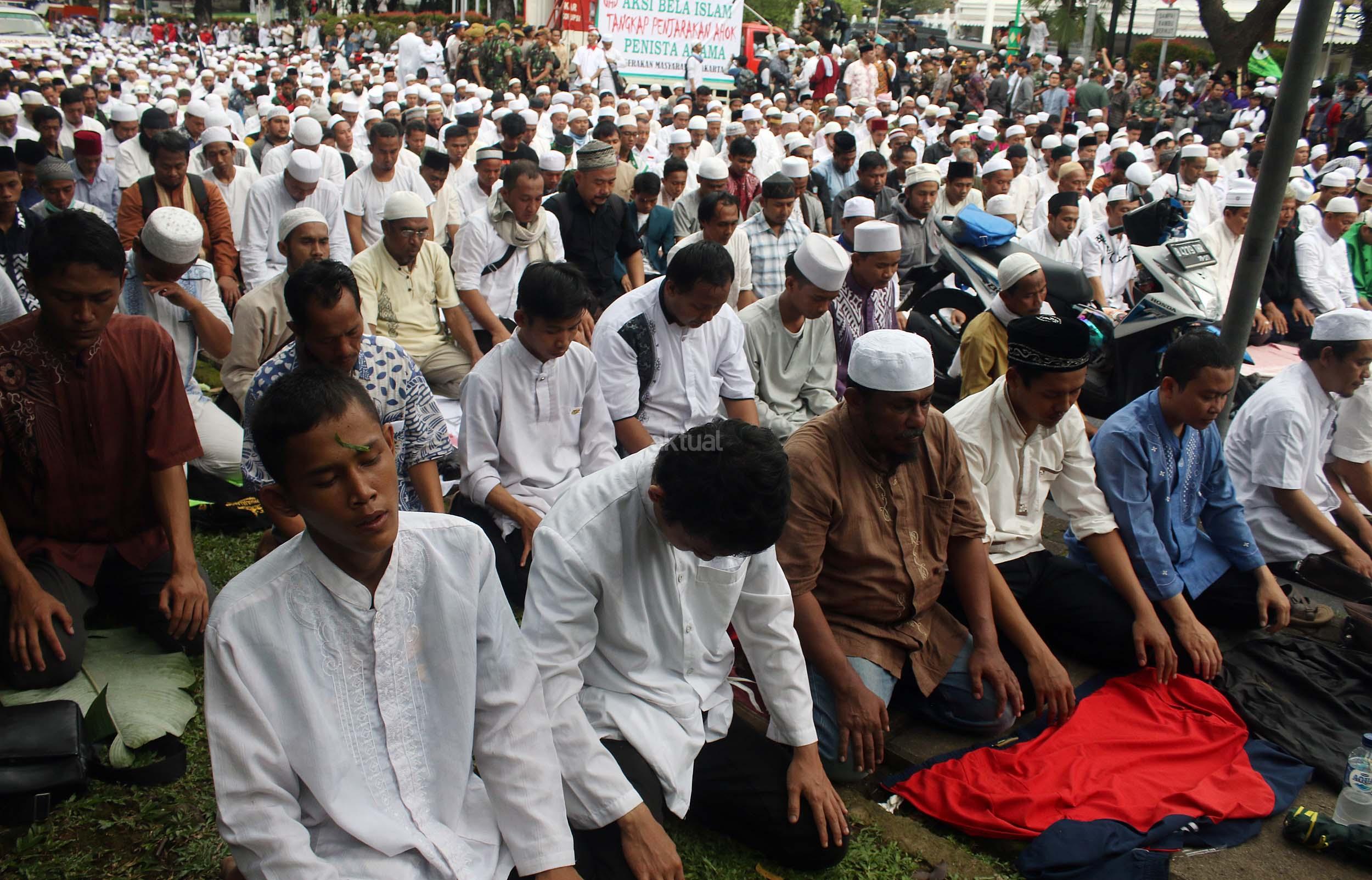 Ribuan massa umat Islam gabungan dari beberapa ormas melaksanakan salat saat berunjuk rasa di depan gedung Balai Kota Jakarta, Jumat (14/10/2016). Mereka mengecam ucapan Gubernur DKI Basuki Tjahaja Purnama yang dianggap telah melecehkan agama.