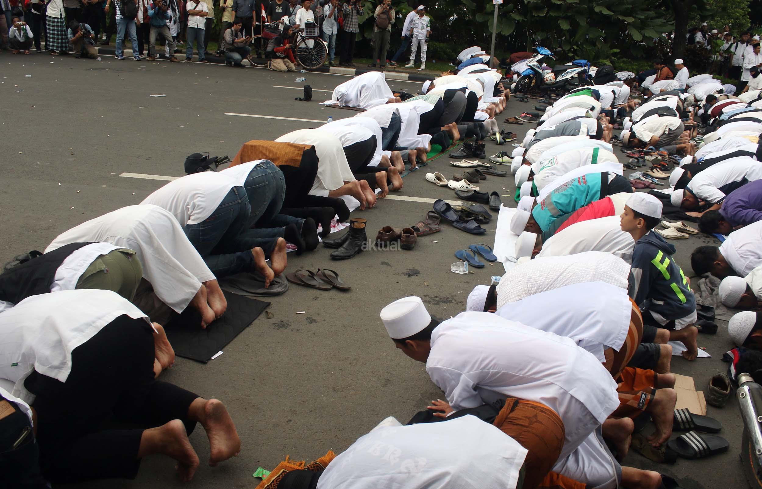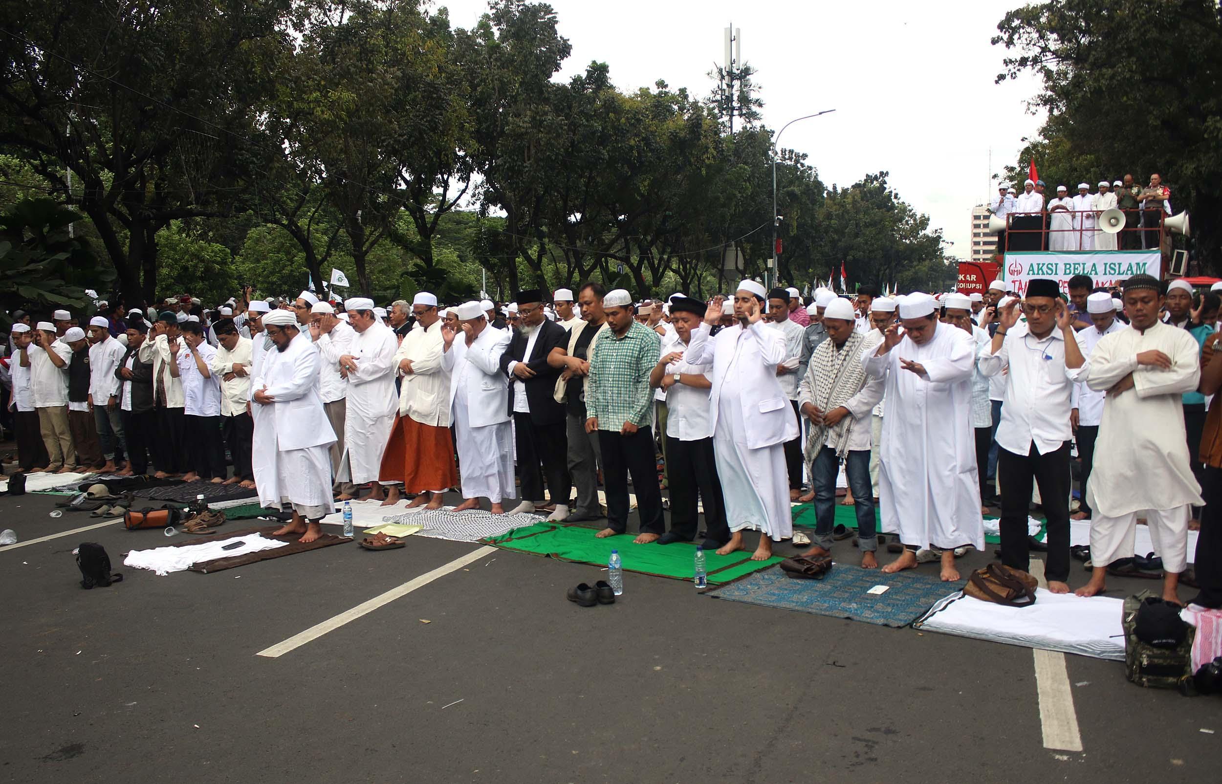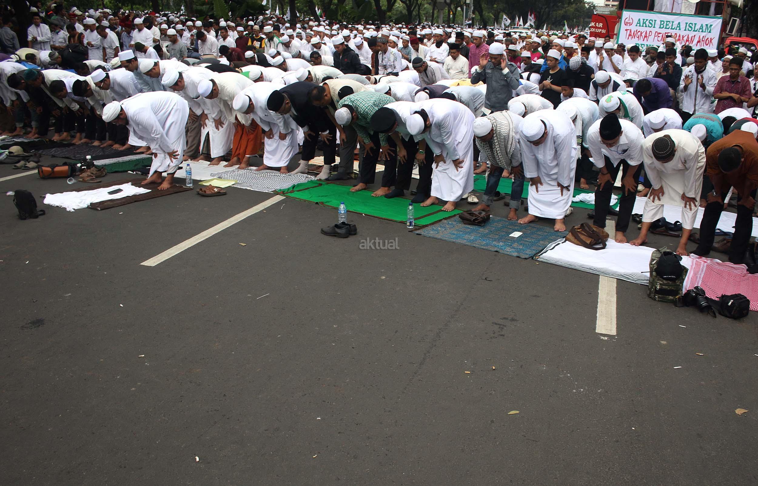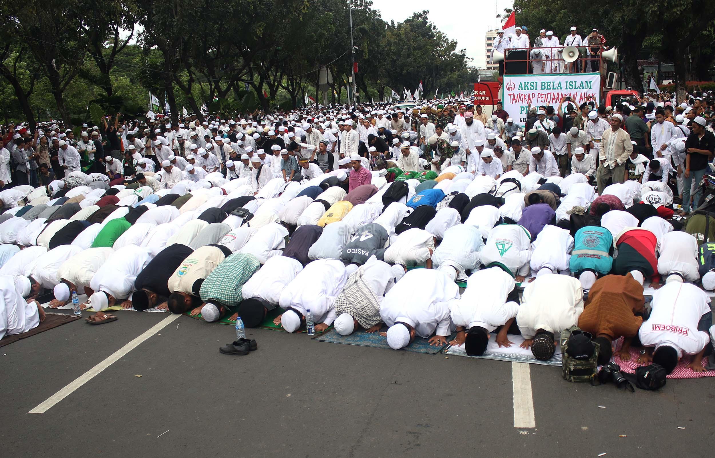 Ribuan massa umat Islam gabungan dari beberapa ormas melaksanakan salat saat berunjuk rasa di depan gedung Balai Kota Jakarta, Jumat (14/10/2016). Mereka mengecam ucapan Gubernur DKI Basuki Tjahaja Purnama yang dianggap telah melecehkan agama.
