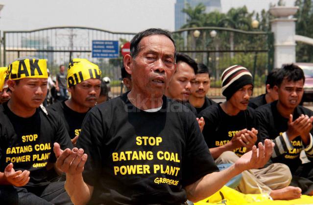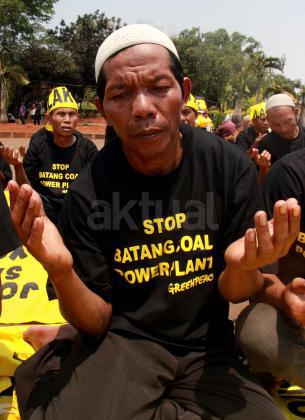 Usai sholat dzuhur berjam'ah para warga Batang bersama agar pembangunan PLTU Batang tidak jadi dilaksanakan,Jakarta, Senin (5/10/2015). Dalam aksinya warga Batang meminta Presiden Joko Widodo membatalkan pembangunan PLTU di Kabupaten Batang, Jawa Tengah karena dinilai akan menghancurkan kawasan konservasi laut, lahan pertanian serta mencemarkan perairan laut yang akan mengancam kehidupan masyarakat setempat.