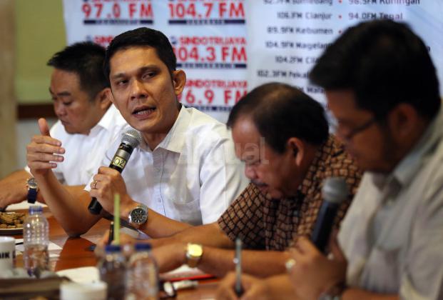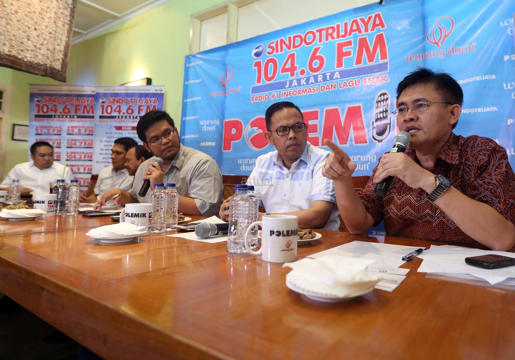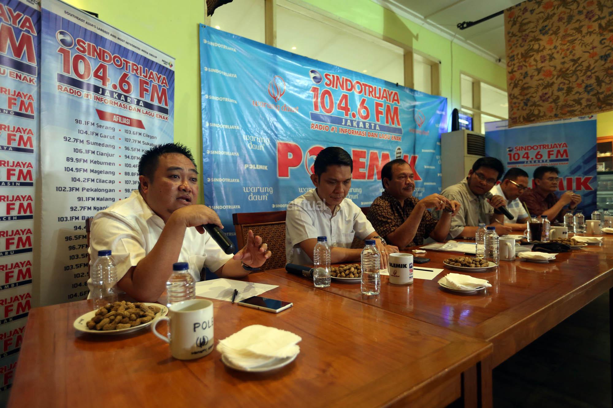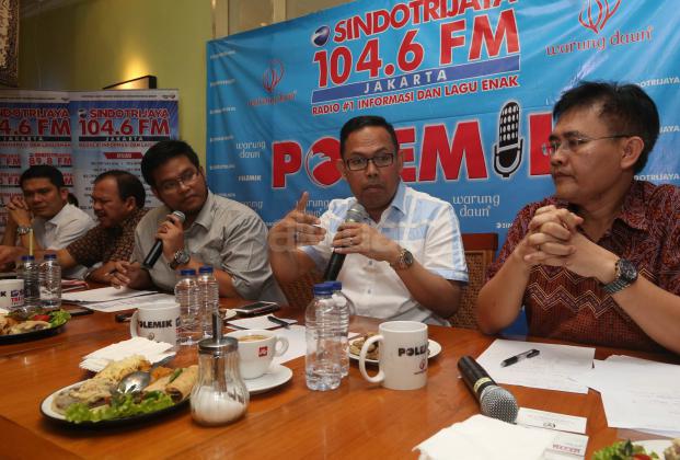 Anggota DPD Abdul Aziz (kiri), Direktur Eksekutif Walhi Abetnego Tarigan (tengah), Direktur Pengendalian Kebakaran Hutan dan Lahan Kementerian Kehutanan dan Lingkungan Hidup Raffles Brotestes Panjaitan (kanan) menjadi pembicara dalam diskusi bertajuk Asap dan Sengsara di Jakarta, Sabtu (19/9/2015). Diskusi tersebut membahas maraknya pembakaran hutan dan kabut asap yang melanda beberapa titik di wilayah Indonesia.