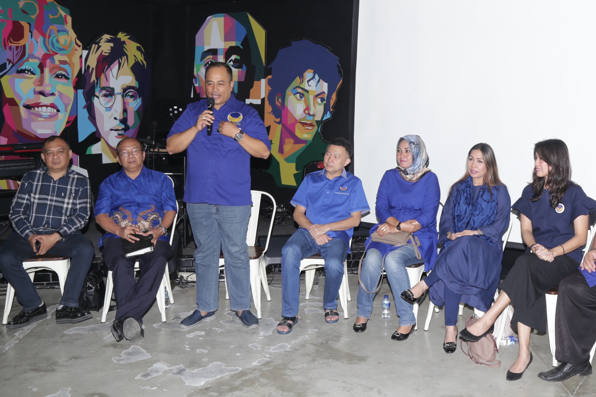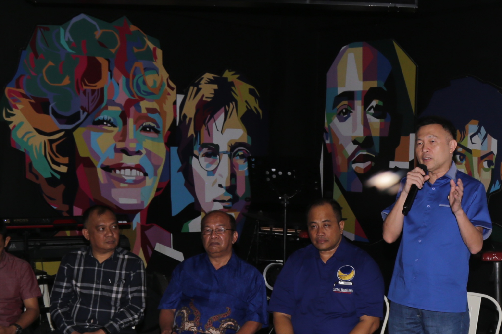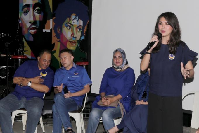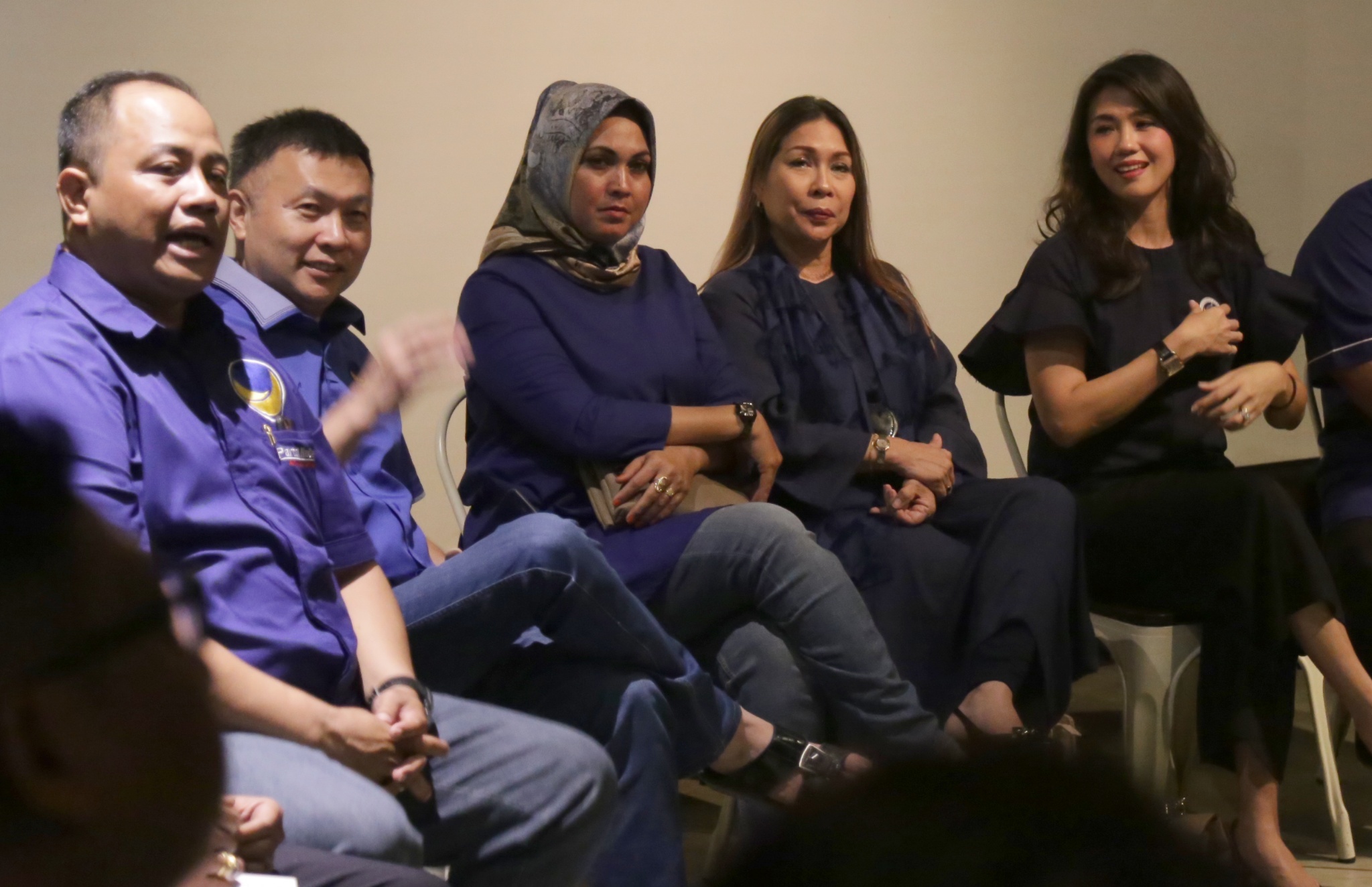 Ketua DPD Jakarta Barat Partai Nasdem Abdul Abdul Aziz (kiri), Calon Anggota DPR RI Dapil Jakarta III Karna Brata Lesmana (kedua kiri), Calon Anggota DPRD DKI Jakarta Dapil Jakarta X Joice Triatman (kanan) bersama Caleg Partai Nasdem Se DKI Jakarta menjadi pembicara diskusi bertema “Caleg Partai NasDem Siap Patahkan Ramalan Lembaga Survei” di Metro Coffee Jalan Tanjung Karang Jakarta Pusat, Minggu (30/9) malam. Sejumlah caleg Partai NasDem dari dapil Jakarta III dan caleg DPRD DKI Jakarta memaparkan ide dan gagasan untuk memenangkan pileg dan pilpres 2019. AKTUAL/Tino Oktaviano