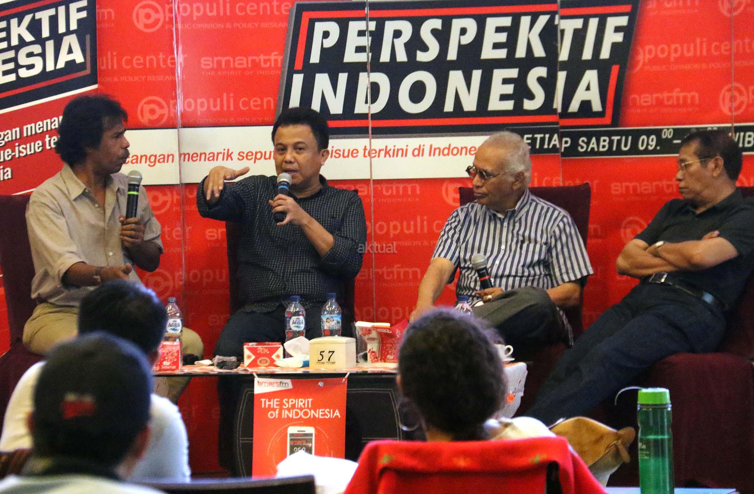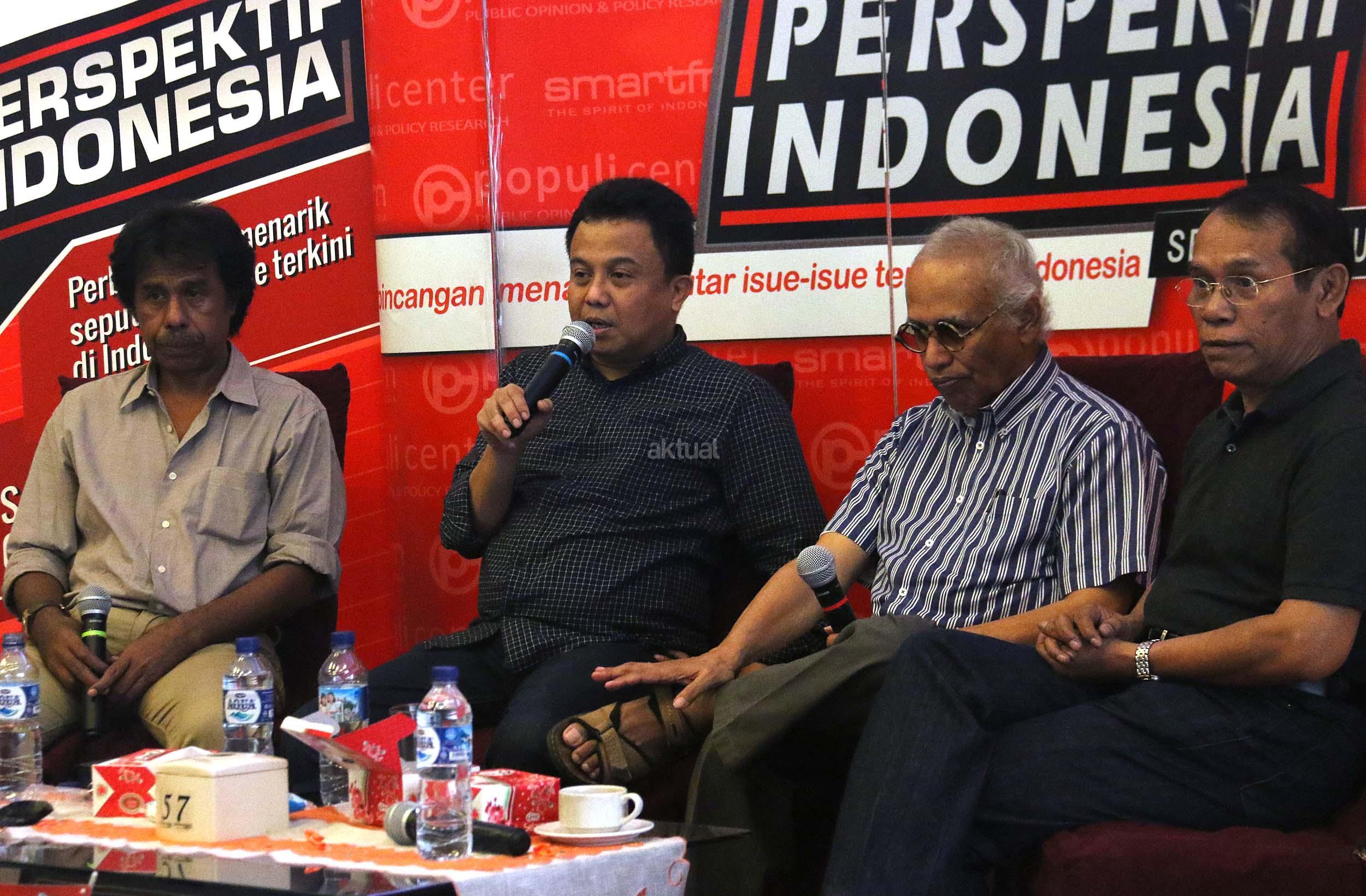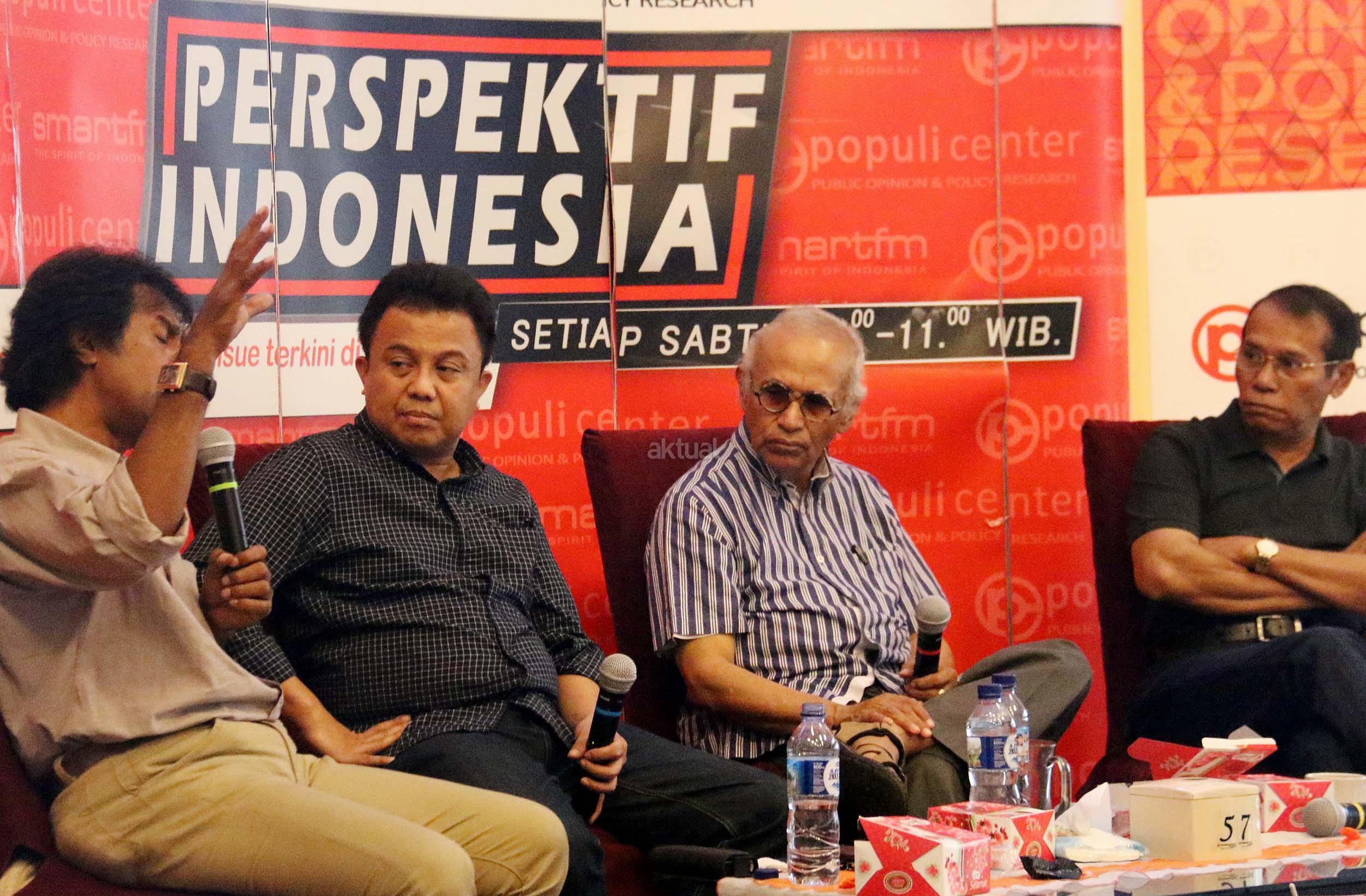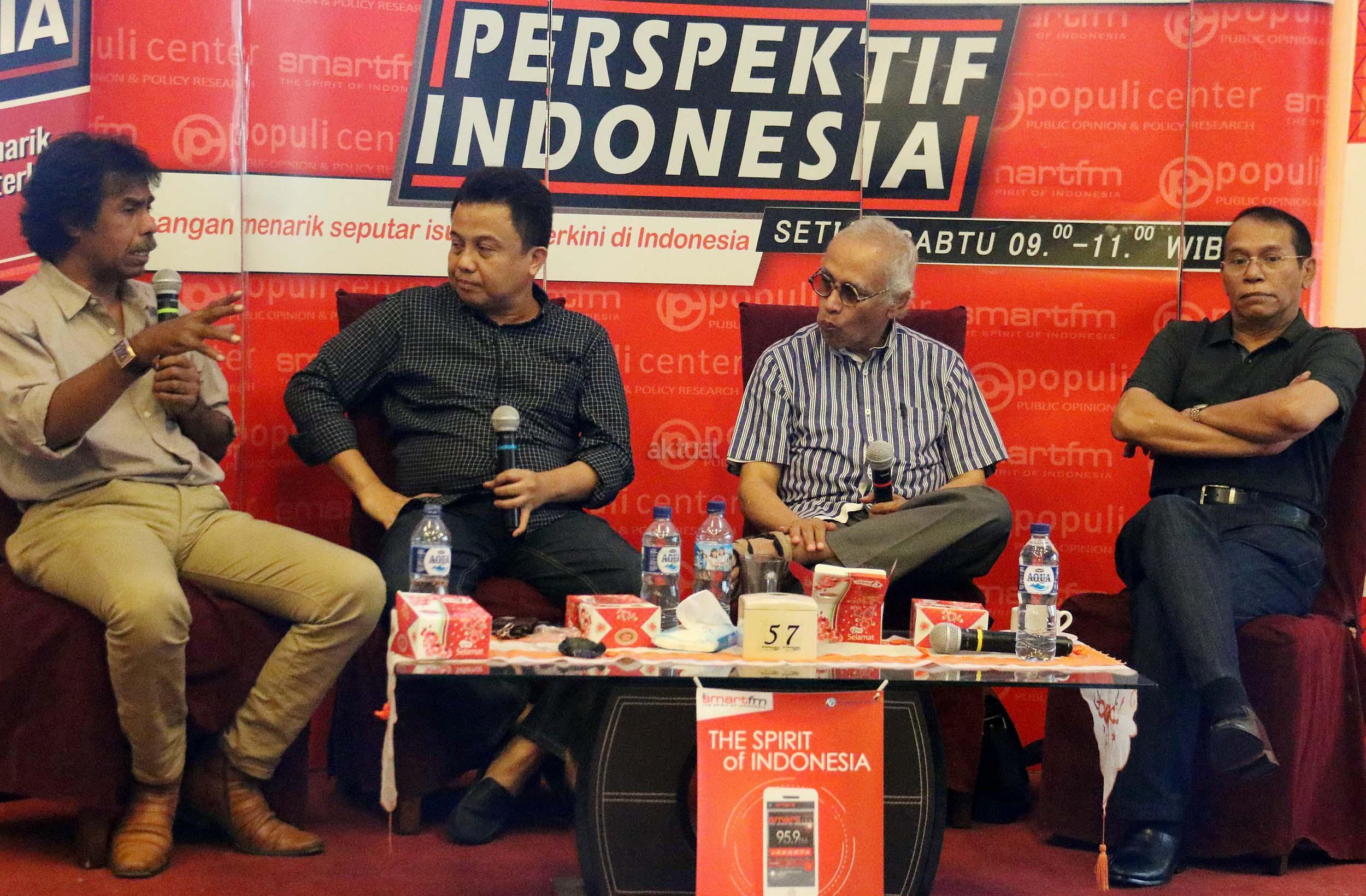 Kiri-kanan ; Ahli Hukum Tata Negara Margarito Kamis, Host Ichan Loulembah, Guru Besar Universitas Pertahanan Salim Said, Ahli Politi Islam Fachry Ali, dalam diskusi Perspektif Indonesia di Jakarta, Sabtu (5/11/2016). Diskusi yang diselenggarakan Populi Center mengambil tema “Setelah Demo 411”.
