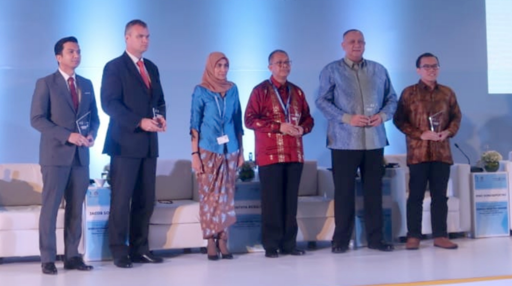 Dari kiri-kanan: Moderator Timothy Marbun, Director Co-financing Operations, Asian Development Bank Jacob Sorensen, Direktur Eksekutif LPEI Sinthya Roesly, Deputi Gubernur Bank Indonesia Dr. Sugeng, CEO Standard Chartered Bank Indonesia Ltd Donny Donosepoetro, Co-Founder & President Bukalapak Fajrin Rasyid saat Diskusi Panel pertama “Global E-Commerce in Emerging Markets: Growth, Challenges, and Opportunities”. AKTUAL/IST