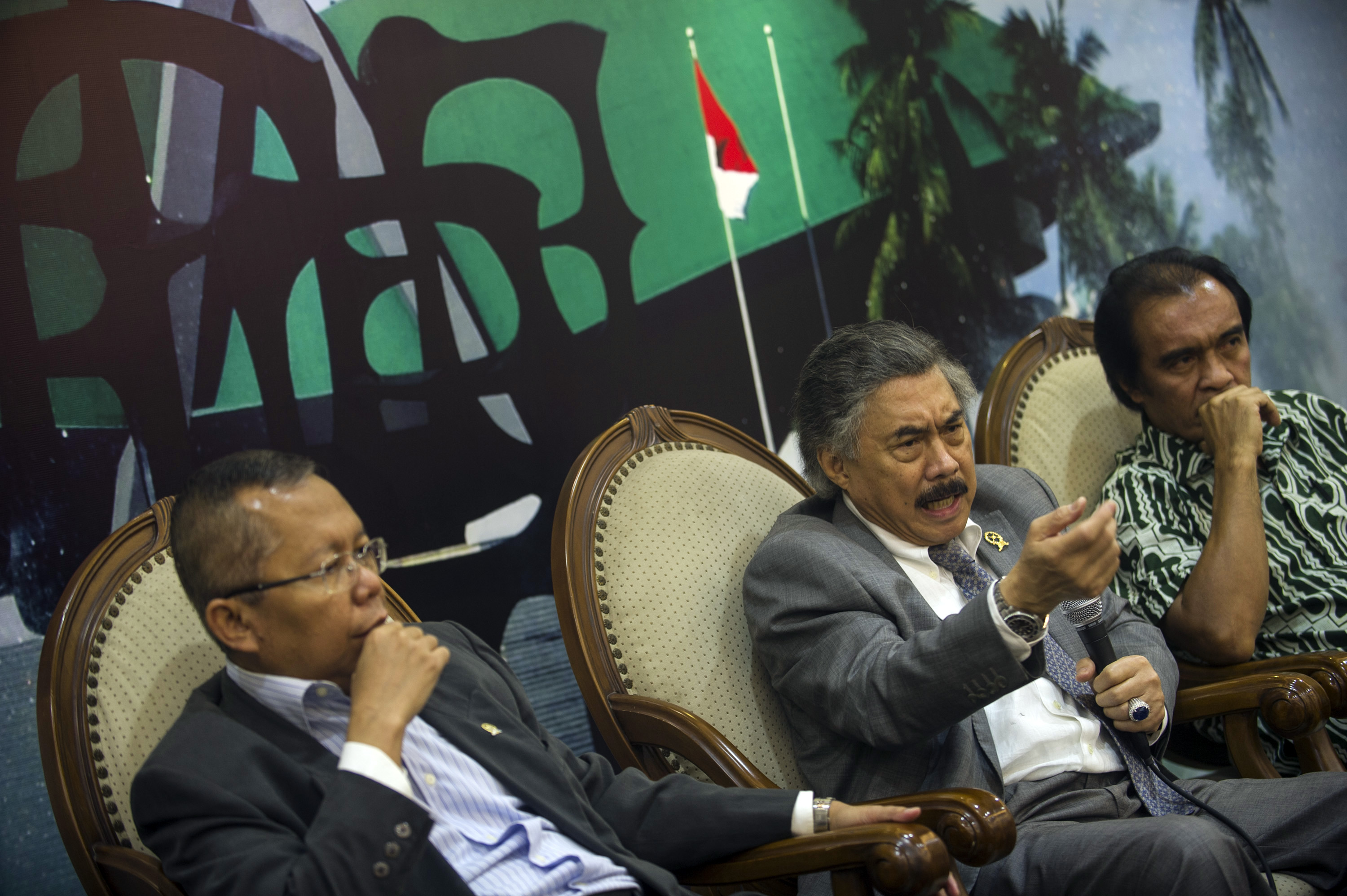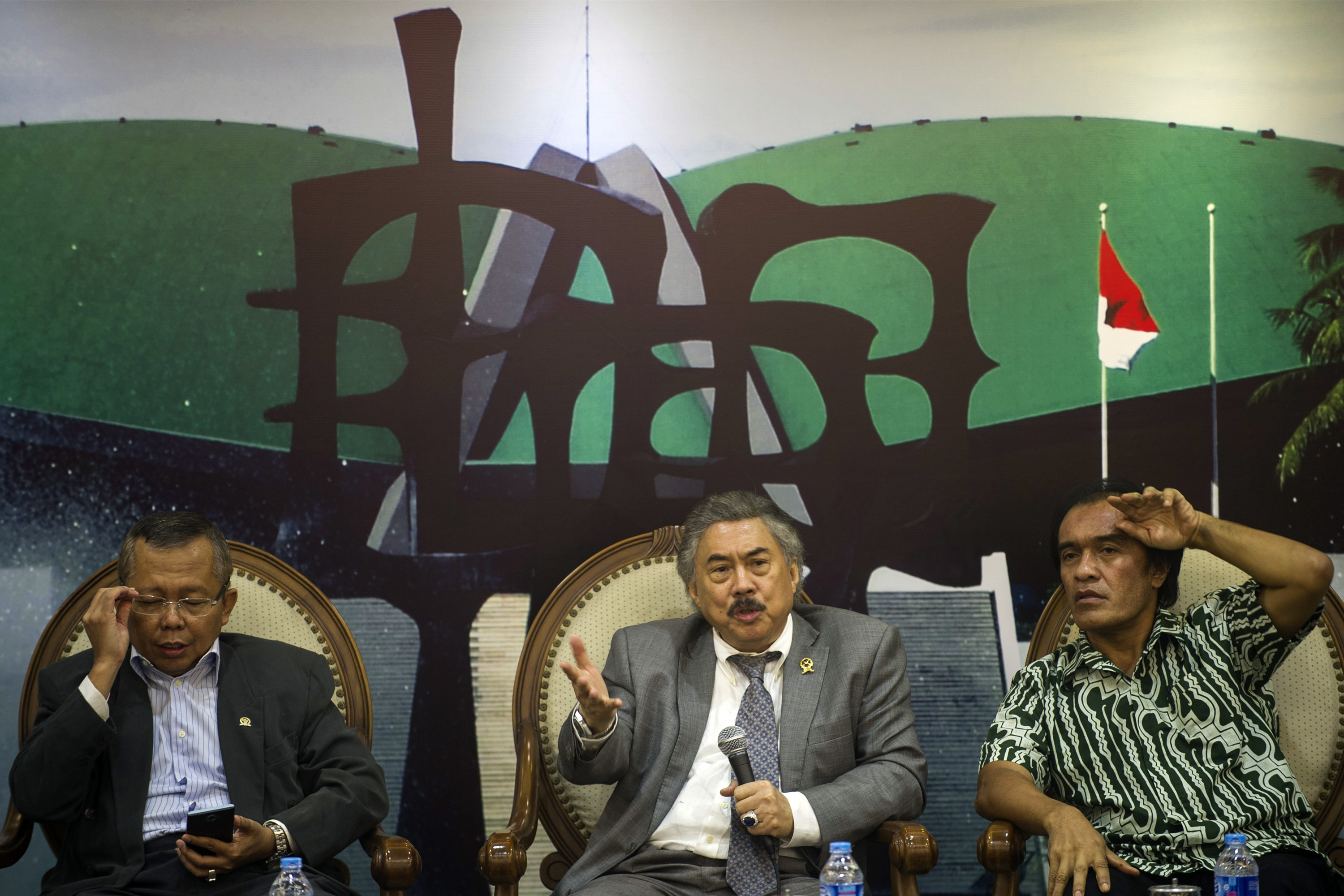 Hakim Agung Gayus Lumbun (tengah), Anggota Komisi III DPR Arsul Sani (kiri) dan Komisioner Ombudsman Laode Ida (kanan) menjadi pembicara dalam diskusi Dialektika Demokrasi di Kompleks Parlemen, Senayan, Jakarta, Kamis (26/5). Diskusi tersebut mengambil tema Lembaga Peradilan di Pusaran Korupsi. ANTARA FOTO/Sigid Kurniawan/nz/16.