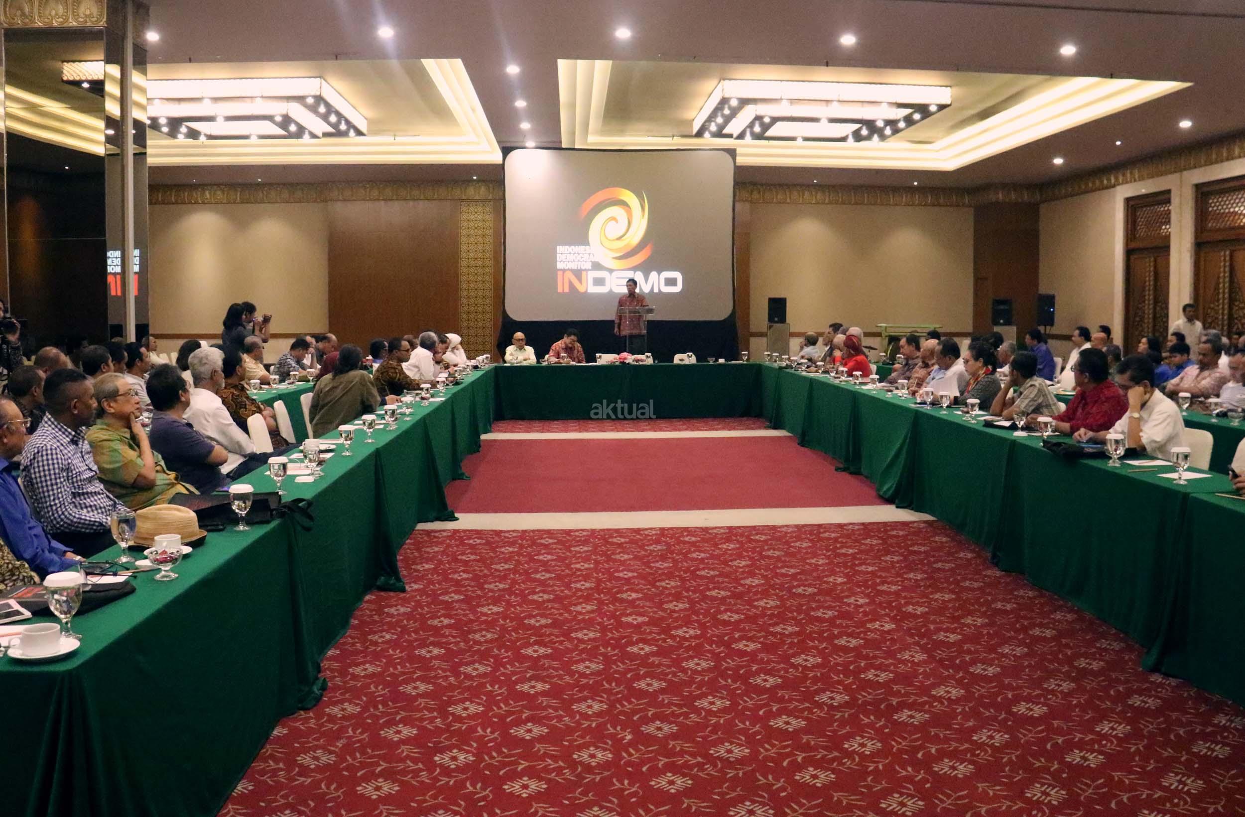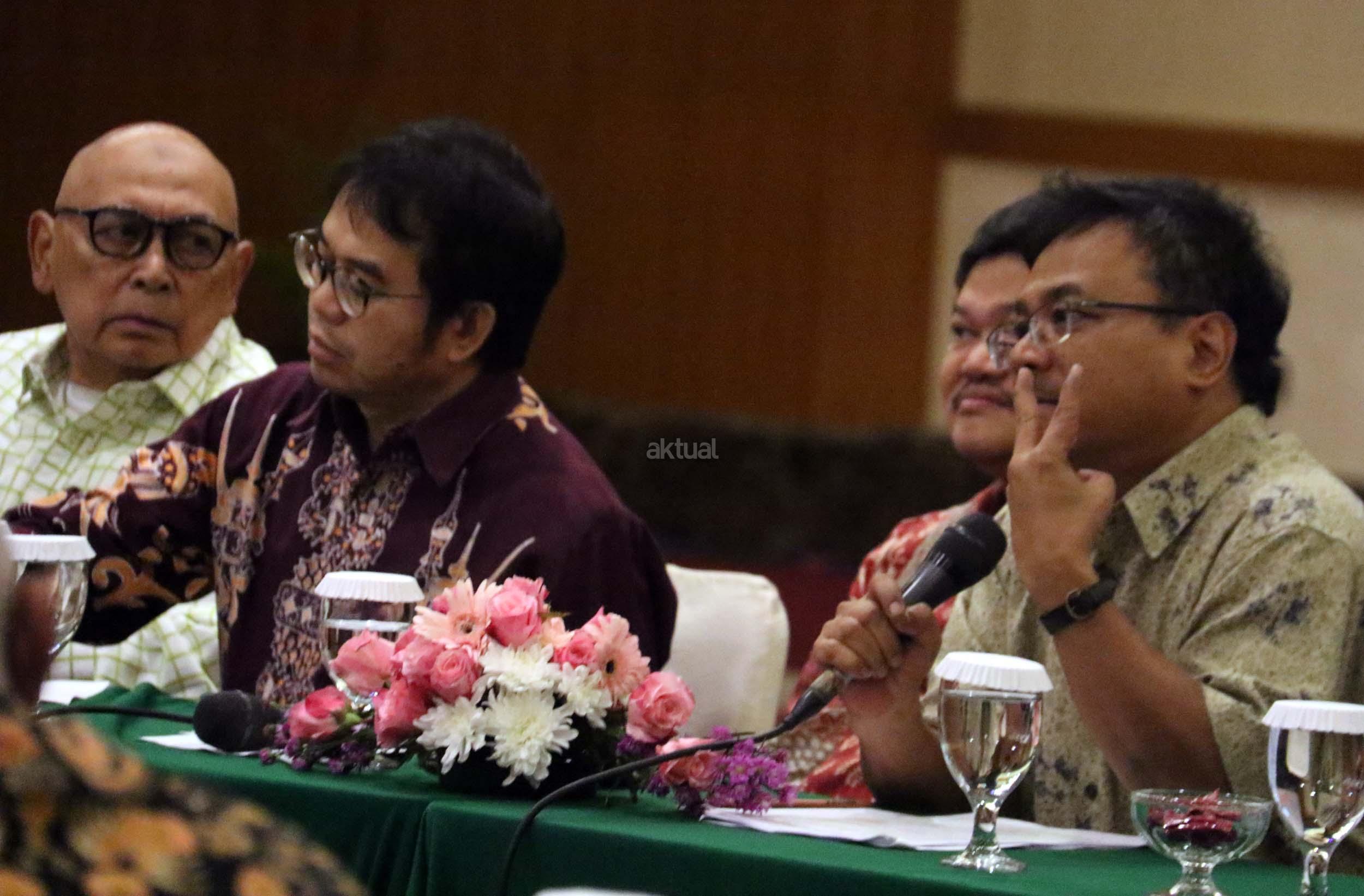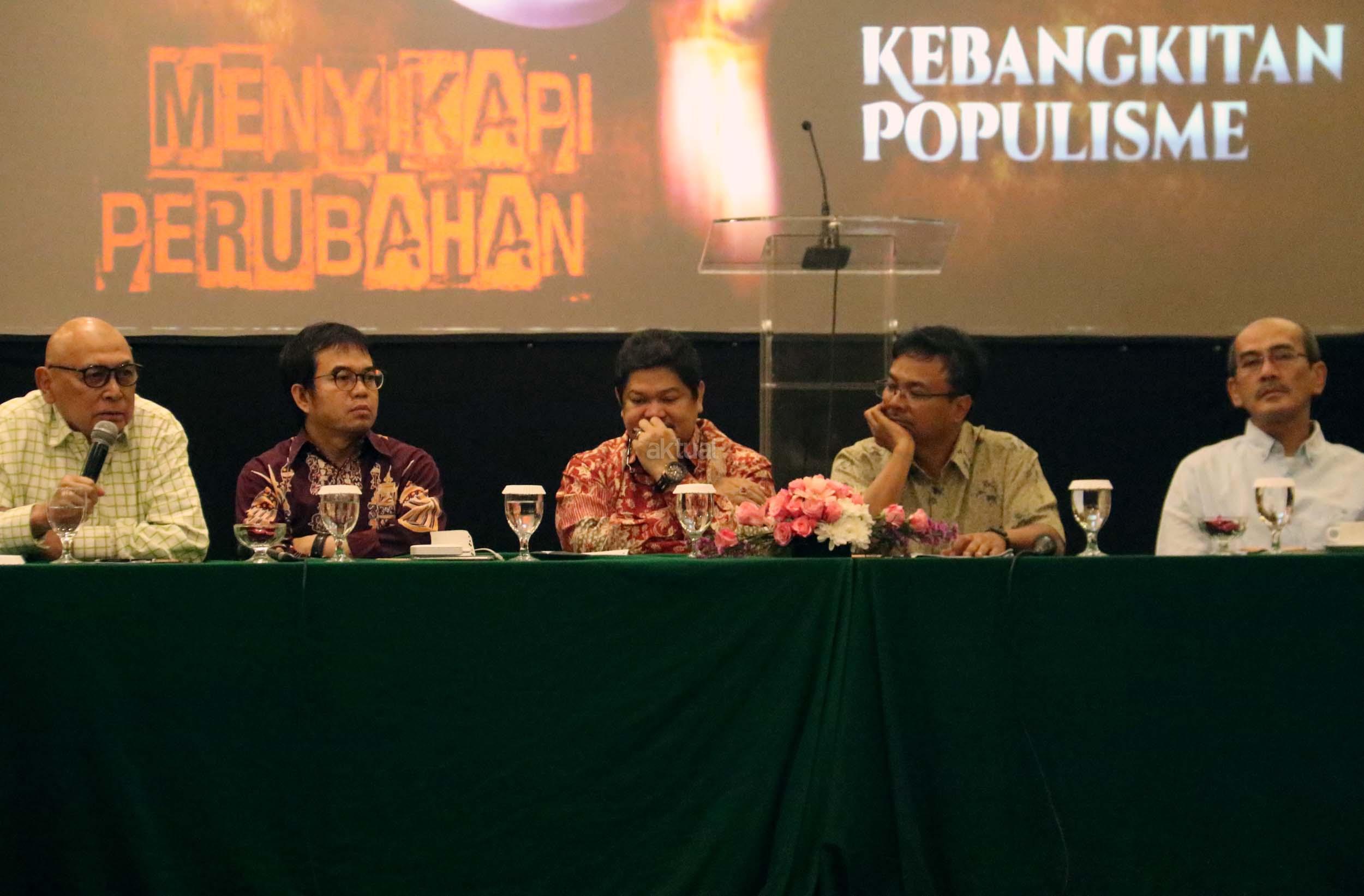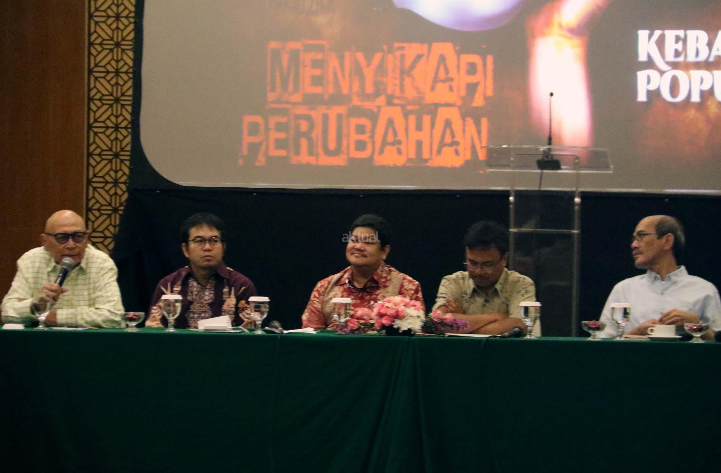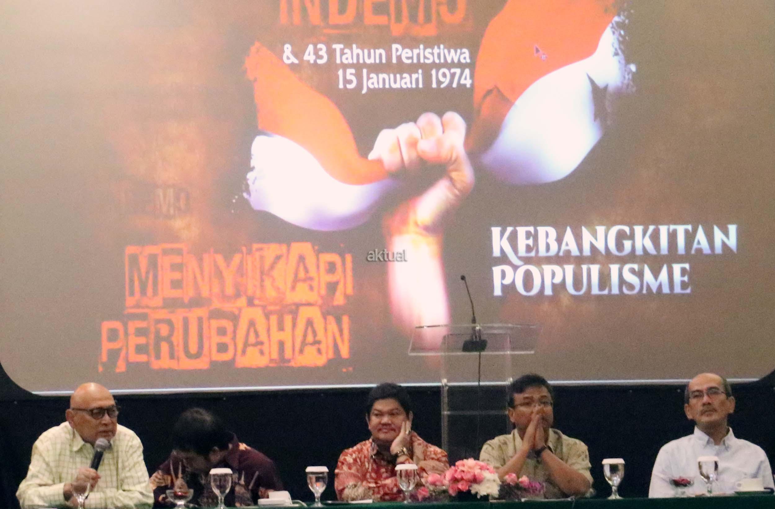 Kiri-kanan ; Direktur Soeripto Centre *Soeripto JS*, Dir. Reform Institute Yudi Latif, Ketua Umum Yayasan Kalimasadha Nusantara Eddy Junaidi, STF Driyarkara B. Herry Priyono, Ekonomi UI Faisal Basri saat diskusi perayaan HUT Indemo ke 17 tahun dan 43 Tahun Peristiwa 15 Januari 1974 di hotel Bidakara, Jakarta, Minggu (15/1/2017). Dalam acara HUT Indemo ke 17 tahun dan 43 Tahun Peristiwa 15 Januari 1974 yang bertemakan *Menyikapi Perubahan, Kebangkitan Populisme* dan diskusi lintas generasi.