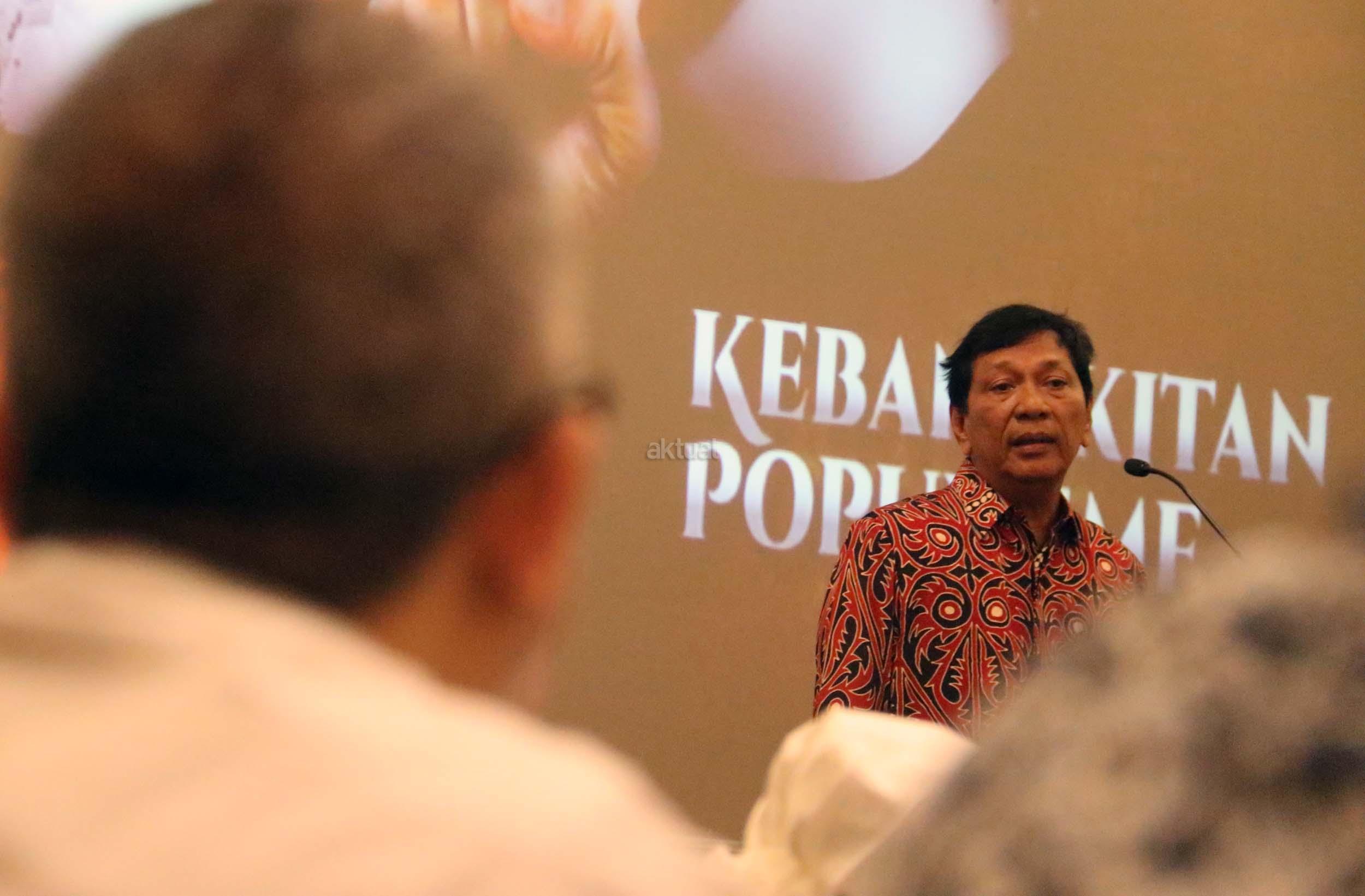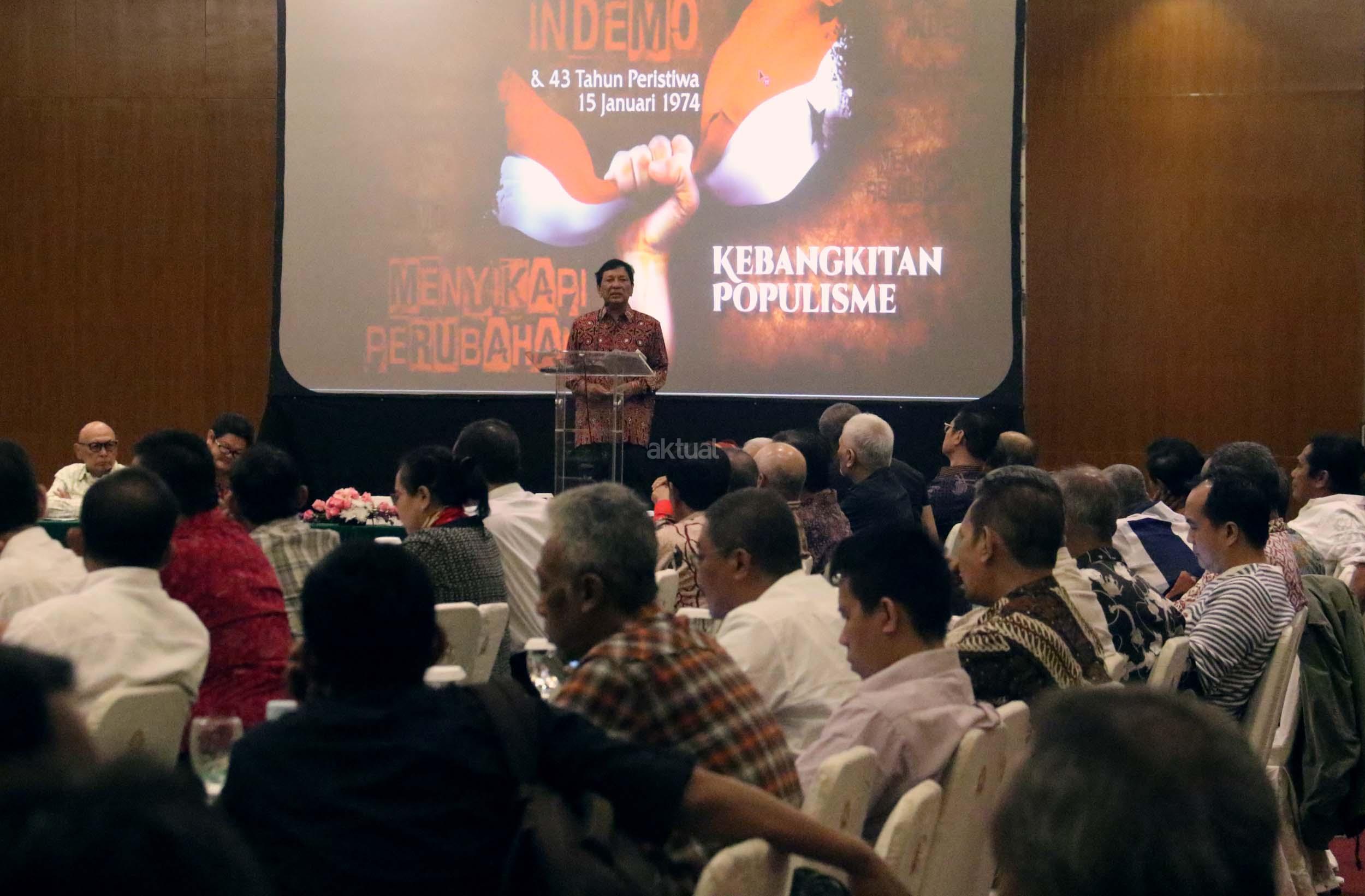 Tokoh Malari Hariman Siregar memberikan Keynotespeaker dalam acara perayaan HUT Indemo ke 17 tahun dan 43 Tahun Peristiwa 15 Januari 1974 di hotel Bidakara, Jakarta, Minggu (15/1/2017). Dalam acara HUT Indemo ke 17 tahun dan 43 Tahun Peristiwa 15 Januari 1974 yang bertemakan *Menyikapi Perubahan, Kebangkitan Populisme* dan diskusi Lintas Generasi.