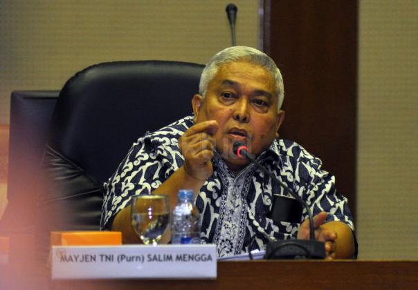 Anggota Komisi I DPR Mayjen TNI (Purn) Salim Mengga saat menjadi pembicara dalam seminar bertajuk Operasi Militer Selain Perang di Kompleks Parlemen, Senayan, Jakarta, Senin (12/10/2015). Diskusi yang diselenggarakan Fraksi Partai Demokrat tersebut membahas mengenai peran TNI dalam masyarakat di luar perannya dalam operasi militer.