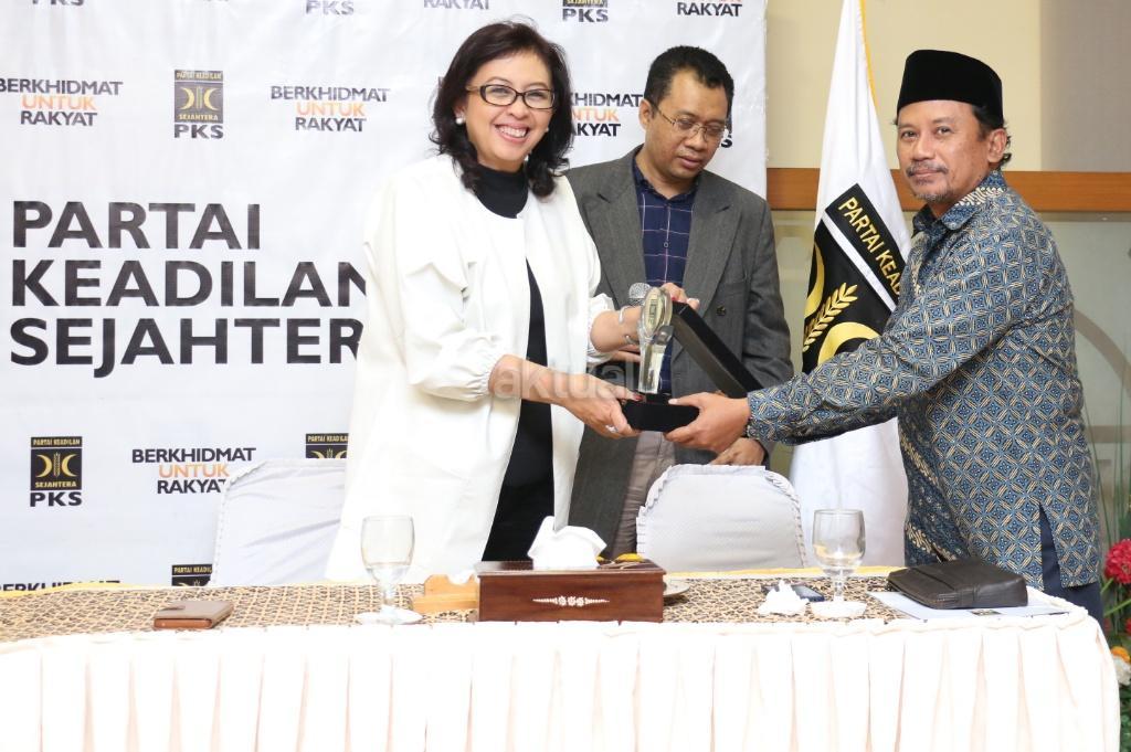 Kabid Ekuinteklh DPP PKS Memed Sosiawan memberikan cindramata kepada Direktur Pengaduan, Pengawasan dan Sanksi Administratif Kementrian Lingkungan Hidup & Kehutanan Rosa Vivien Ratnawati usai diskusi Peduli Lingkungan di DPP PKS Jalan TB Simatupang, Jakarta Selatan, Kamis (27/7) malam. AKTUAL/HO