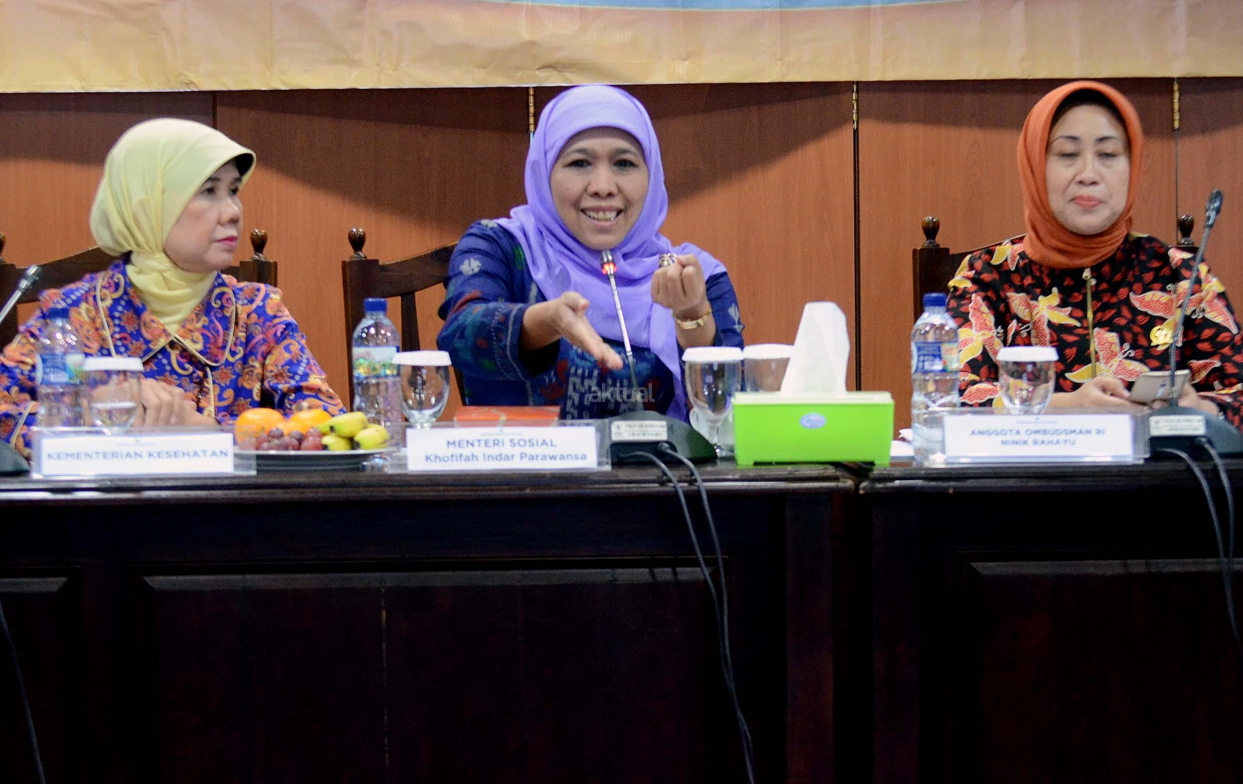 Menteri Sosial, Khofifah Indar Parawansa (tengah) bersama anggota Ombudsman, Ninik Rahayu (kanan) dan perwakilan Kementerian Kesehatan menjadi pembicara pada acara Monitoring Saran Terbuka Ombudsman RI di Jakarta, Selasa (27/9/2016). Tema “Pencegahan dan Penanganan Kekerasan Seksual Terhadap Perempuan dan Anak dalam Bingkai Pelayanan Publik”. AKTUAL/MUNZIR