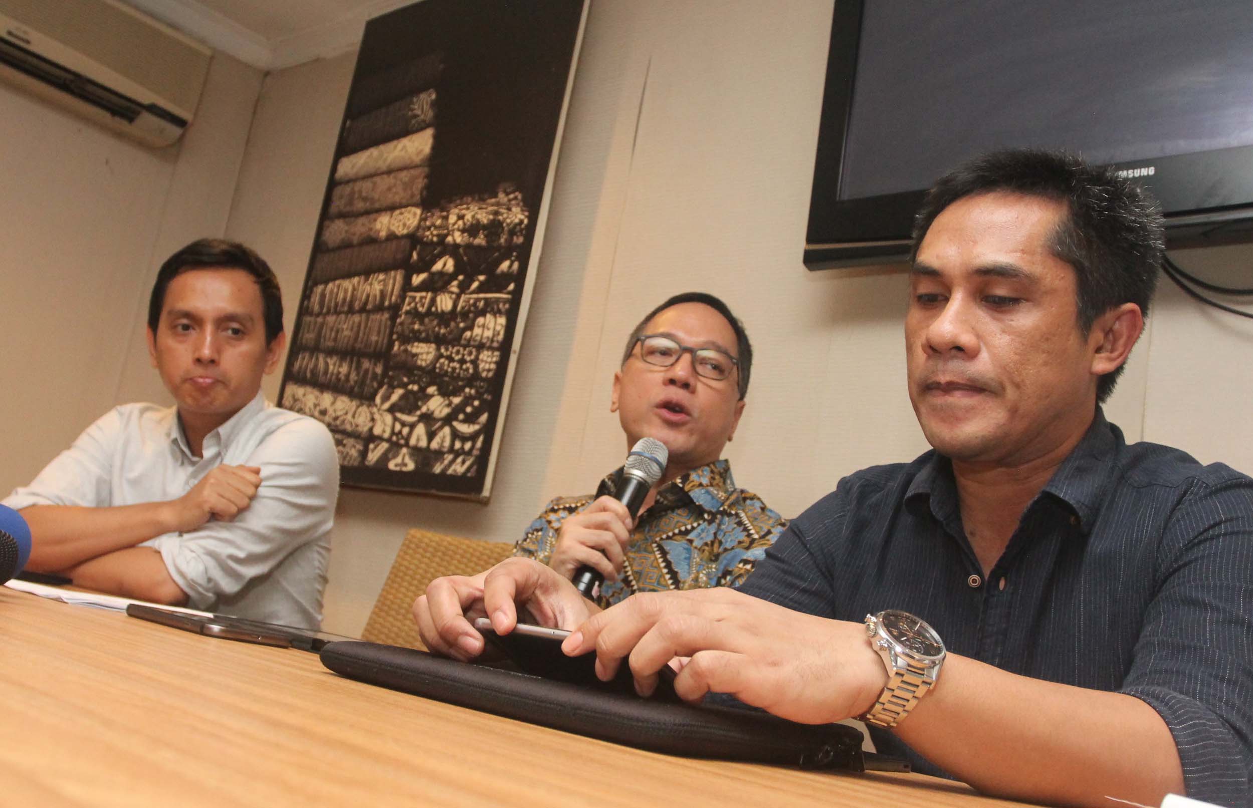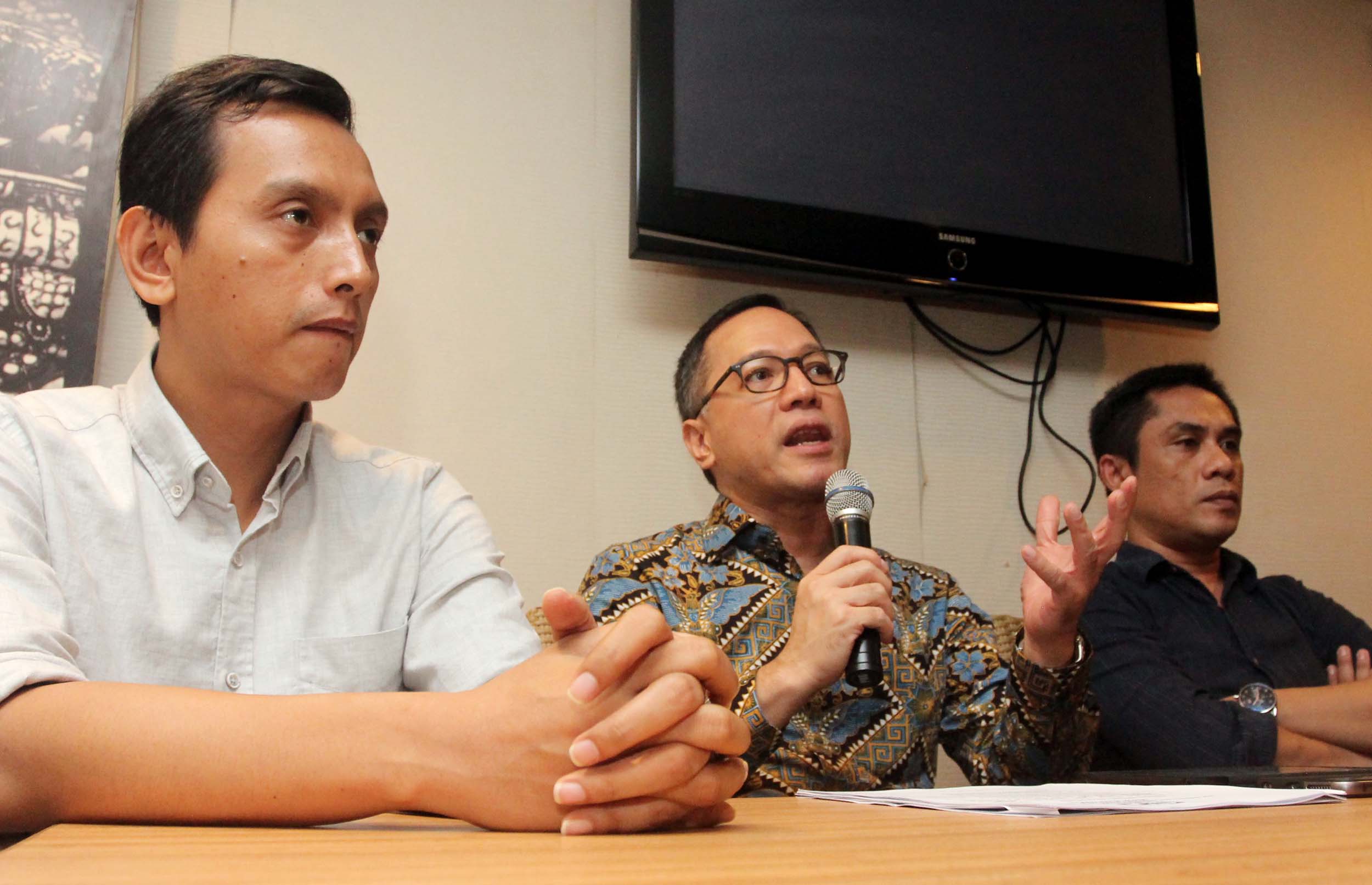 Anggota DPR Komisi I Fraksi Hanura Arief Suditomo (tengah), Analis Politik Intrans Andi Saiful Haq (kanan)dan Direktur Imparsial Al Araf (kiri), berbicara dalam diskusi "Pergantian Kepala BIN dan Membangun Intelijen Profesional", di Jakarta, Senin (5/9/2016). Mereka berpendapat pencalonan Wakapolri Komjen Polisi Budi Gunawan menggantikan Letjen (Purn) Sutiyoso, dinilai sebagai angin segar bagi BIN karena selain membuktikan TNI-Polri dapat harmonis dalam bekerja, juga akan ada perpaduan kecakapan yang saling mengisi antara Polisi dan TNI sehingga akan menjadikan BIN sebagai lembaga yang handal