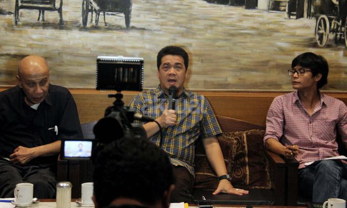 Direktur Eksekutif Sindikasi Pemilu Demokrasi (SPD) August Melasz (kanan) didampingi Wakil Ketua Komisi II DPR Ahmad Riza Patria (tengah) dan peneliti senior SPD Pipik R (kanan). Kartawidjaja berbicara dalam diskusi publik di Bakole Koffie, Menteng, Jakarta Pusat, Minggu (22/5/2016). Diskusi tersebut membahas problematika kepemiluan di Indonesia serta alternatif gagasan sistem Pemilu seiring dengan revisi undang-undang pemilu legislatif yang masih disusun di DPR.