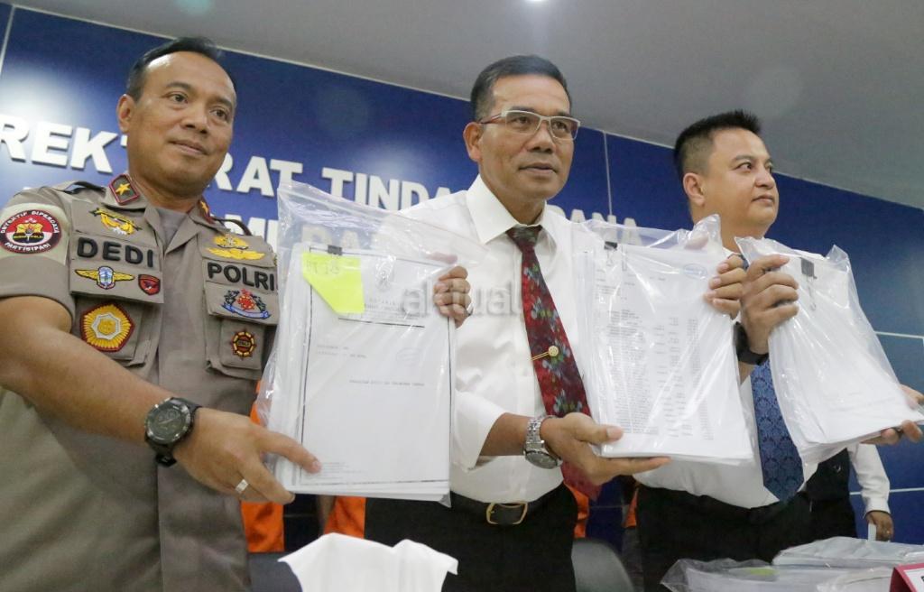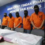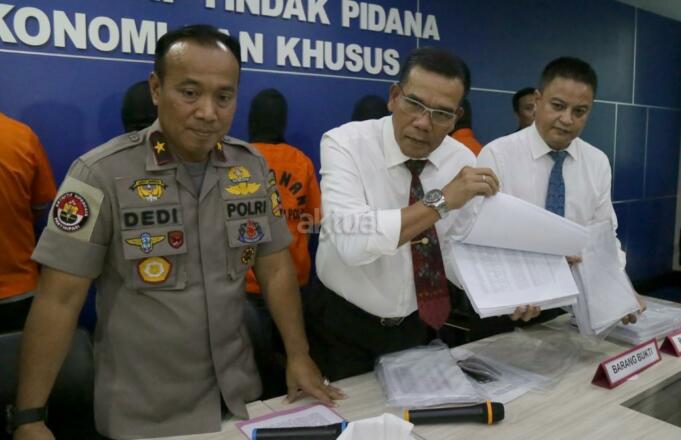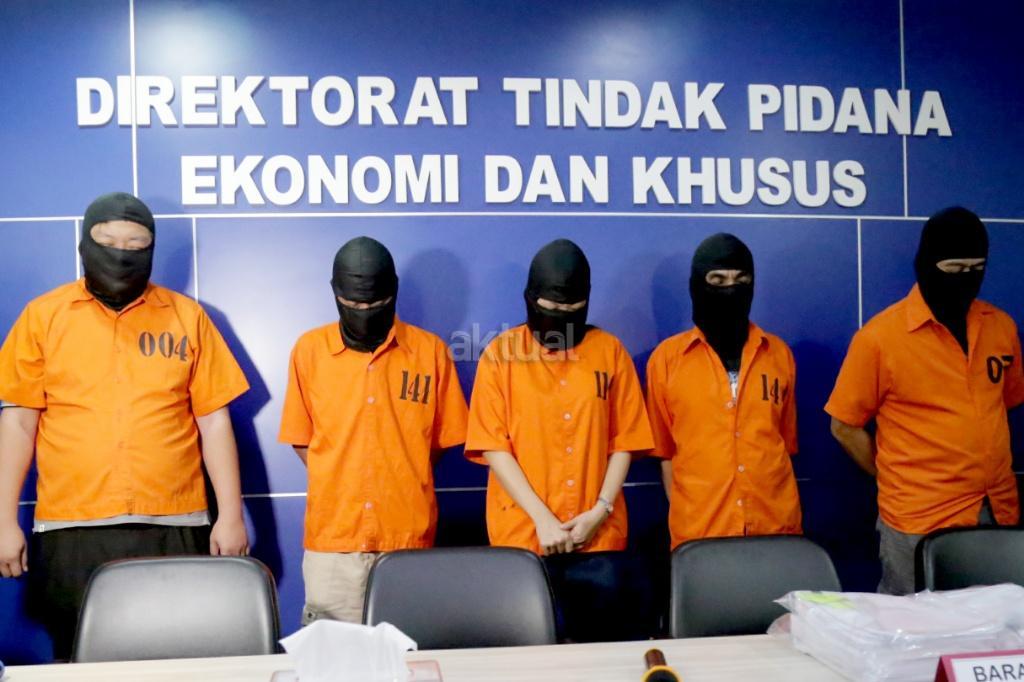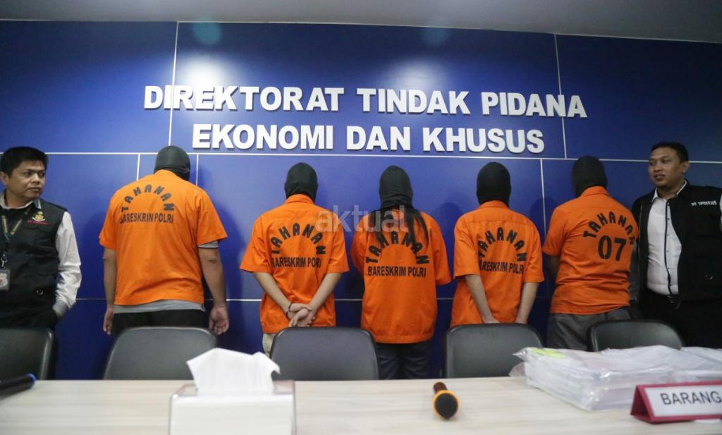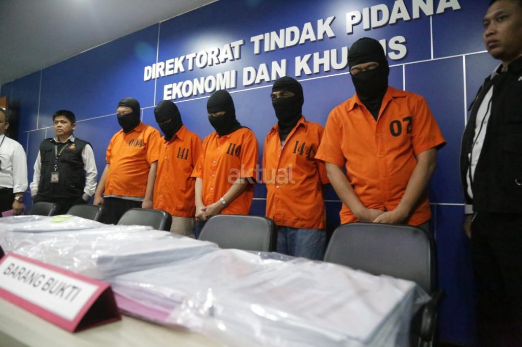 Lima tersangka pembobolan dana nasabah di Bareskrim Mabes Polri, Jakarta (24/9/2018). Direktorat Tindak Pidana dan Ekonomi Khusus (Dit Tipideksus) Bareskrim Polri mengungkap penipuan dana nasabah bank sekitar Rp 14 trilyun pada berbagai bank swasta dan plat merah dengan jumlah tersangka lima orang. AKTUAL/Tino Oktaviano