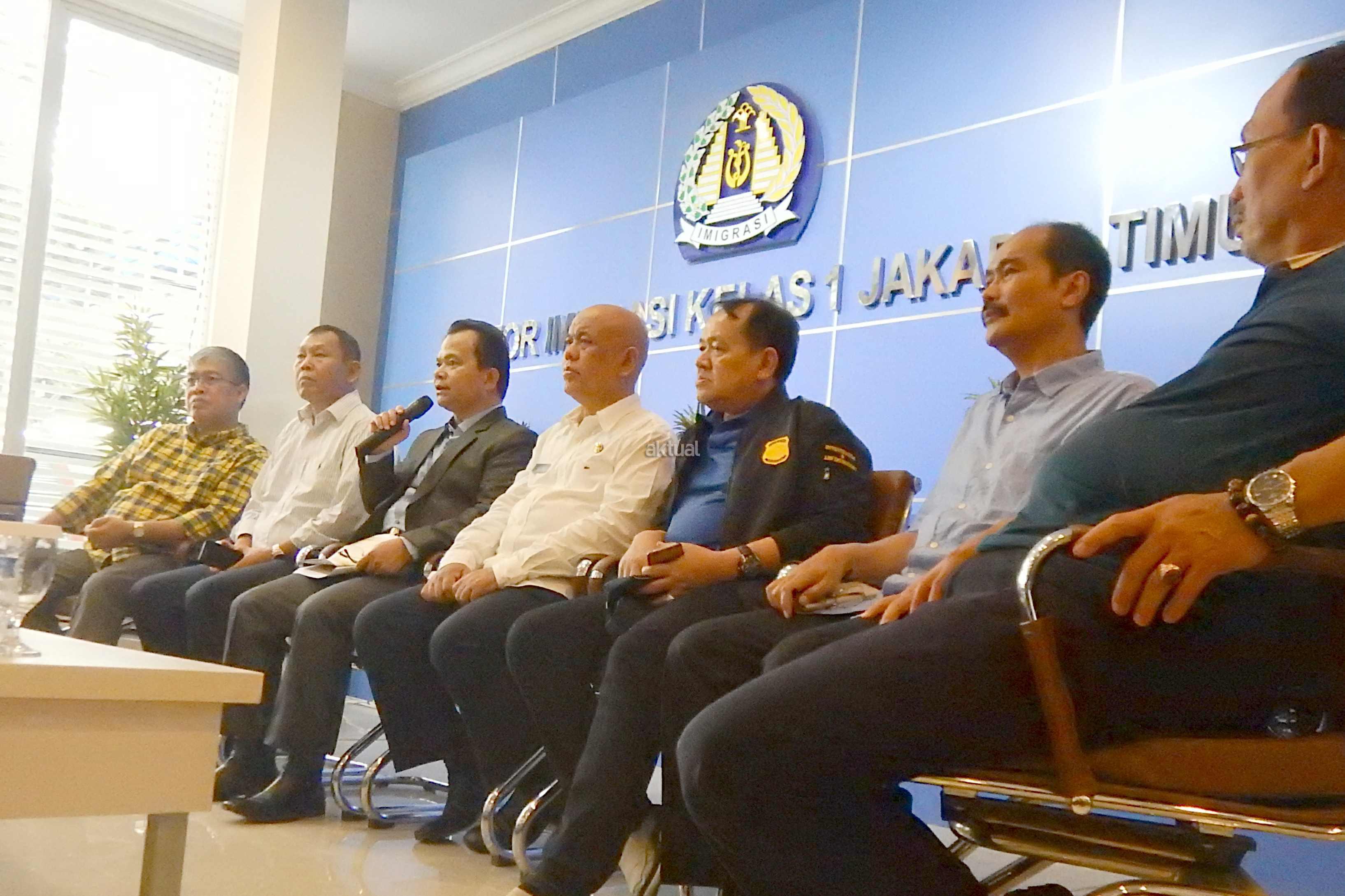 Direktur Jenderal Imigrasi, Ronny F Sompie didampingi jajarannya menyampaikan penetapan lima warga negara Tiongkok yang ditangkap di lingkungan pangkalan TNI Angkatan Udara Halim Perdanakusuma saat konferensi pers di Kantor Imigrasi Jakarta Timir, Sabtu (7/4). Ditjen Imigrasi menyatakan telah menaikkan kasus tersebut dari penyelidikan ke tahap penyidikan. Berdasarkan bukti permulaan dari lima warga negara Tiongkok tersebut, hanya empat yang memiliki izin kerja.