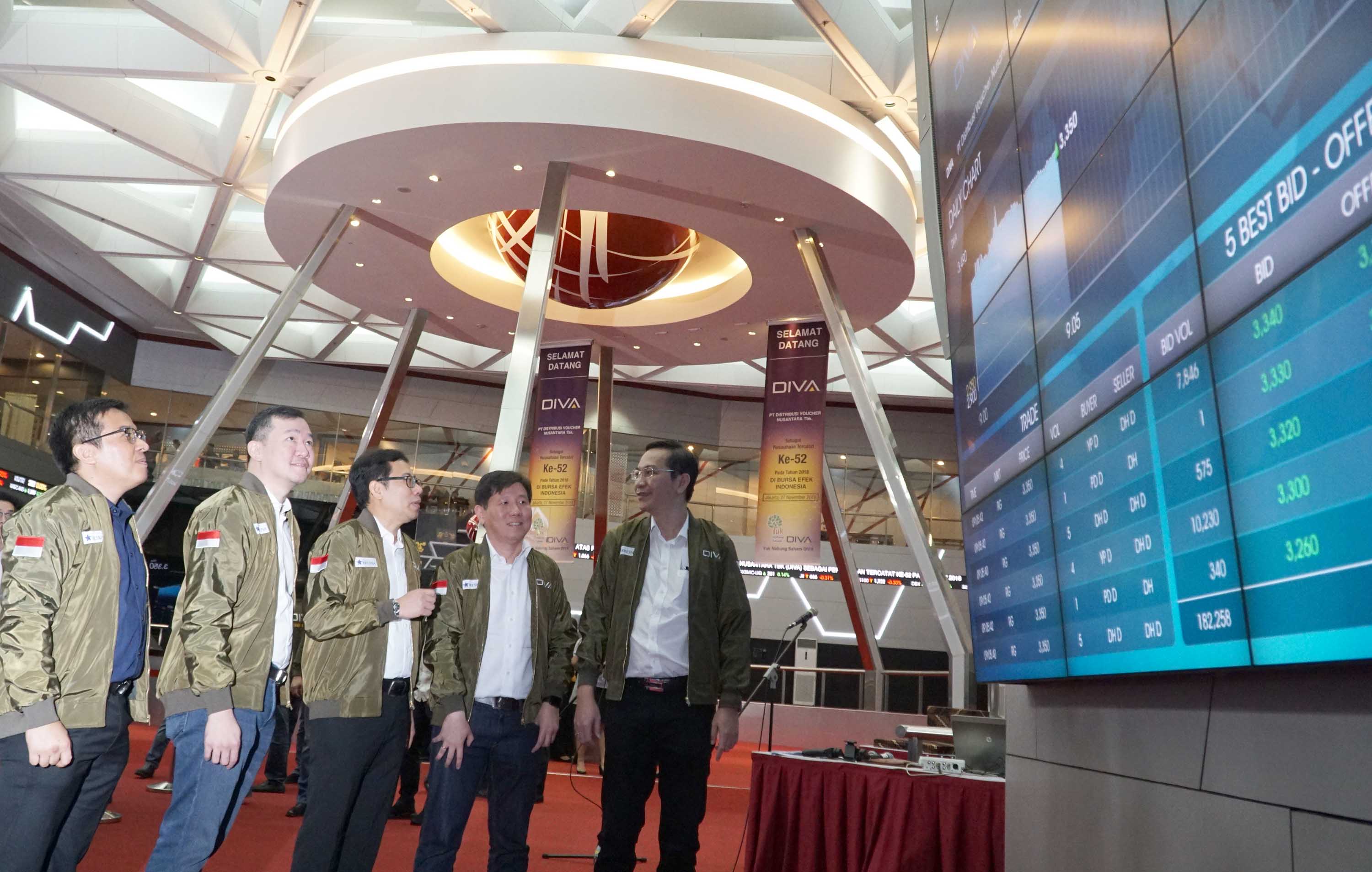 Perusahaan yang bergerak di Industri teknologi ini tercatat sebagai emiten ke 52 yang melantai di bursa. Saham DIVA dibuka resmi dan langsung melonjak ke harga Rp 3.350, meningkat 13,56% dari harga perdana. Selama penawaran awal, DIVA mengantongi kelebihan permintaan sebesar 5,6 kali lebih tinggi dari jumlah saham yang dilepas. Saat dibuka, saham perseroan ditransaksikan 64 kali dengan nilai Rp 4,32 miliar. AKTUAL/Eko S Hilman