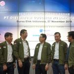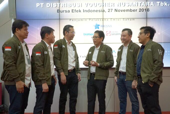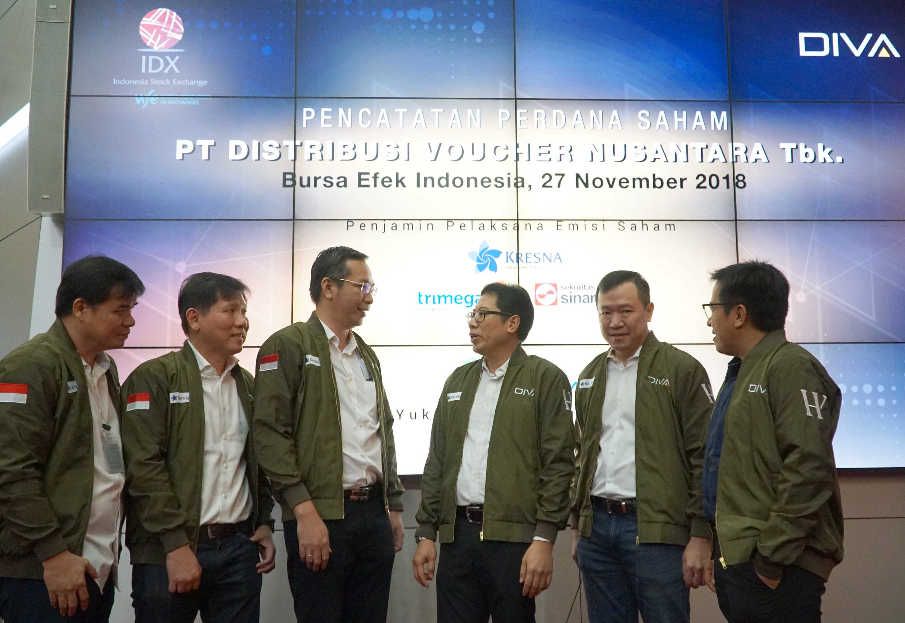 (dari kiri ke kanan) Komisaris PT Distribusi Voucher Nusantara Tbk (DIVA), Bambang Irawan, Komisaris ,Suryandy Jahja, Direktur Utama, Raymond Loho, Direktur Penilaian Perusahaan BEI, I Nyoman Yetna, Komisaris Utama DIVA, Martin Suharlie, serta Direktur TI& Manajemen Risiko BEI, Fitri Hadi berbincang disela pencatatan saham DIVA di Main Hall ,Bursa Efek Indonesia, Selasa (27/11). Perusahaan yang bergerak di Industri teknologi ini tercatat sebagai emiten ke 52 yang melantai di bursa. Saham DIVA dibuka resmi dan langsung melonjak ke harga Rp 3.350, meningkat 13,56% dari harga perdana. Selama penawaran awal, DIVA mengantongi kelebihan permintaan sebesar 5,6 kali lebih tinggi dari jumlah saham yang dilepas. Saat dibuka, saham perseroan ditransaksikan 64 kali dengan nilai Rp 4,32 miliar. AKTUAL/Eko S Hilman