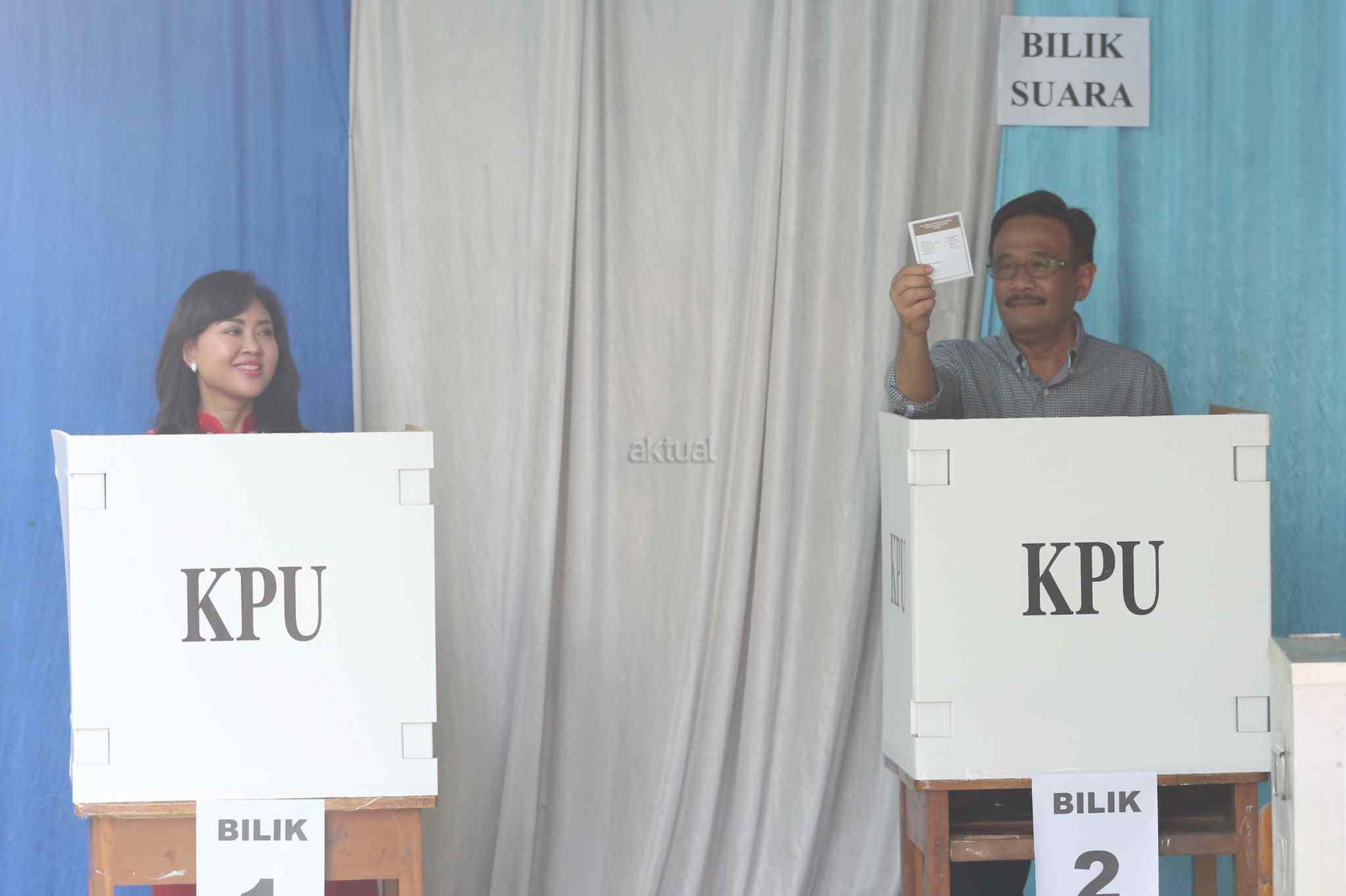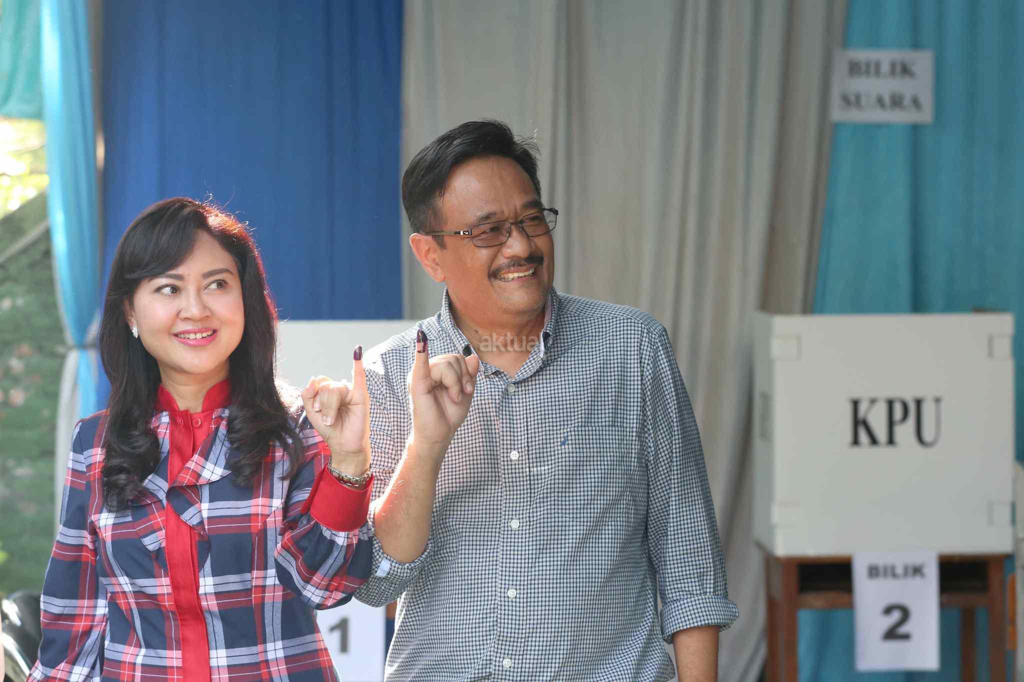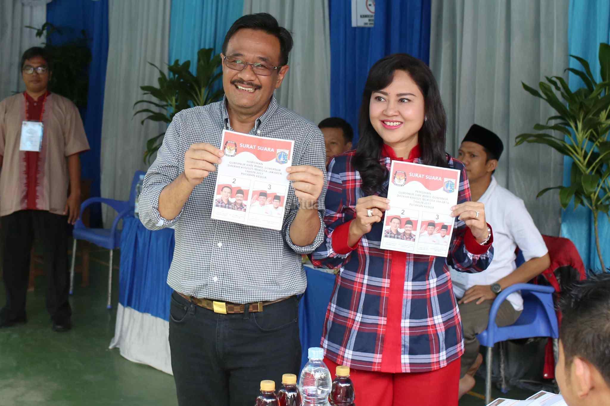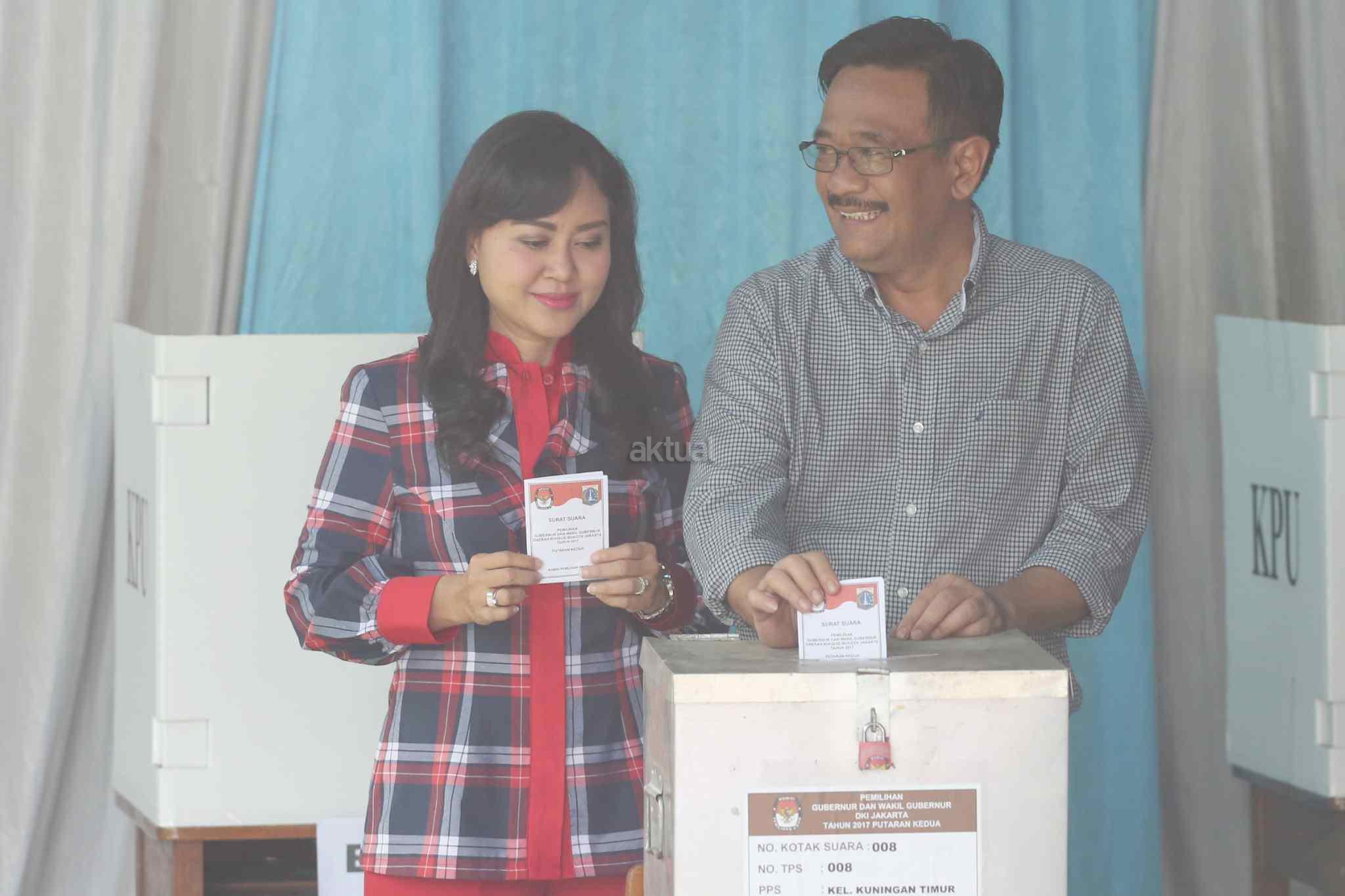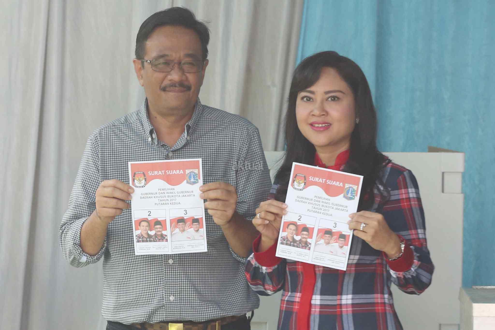 Calon Wakil Gubernur DKI Jakarta Nomor Urut Dua, Djarot Saiful Hidayat (kanan) bersama istri, Happy Farida (kiri) menggunakan hak pilih di TPS 8, Kuningan, Jakarta, Rabu (19/4). Pemilihan Gubernur DKI Jakarta putaran kedua diikuti dua pasang calon, salah satunya pasangan calon nomor urut dua Basuki Tjahaja Purnama dan Djarot Saiful Hidayat. AKTUAL/Tino Oktaviano
