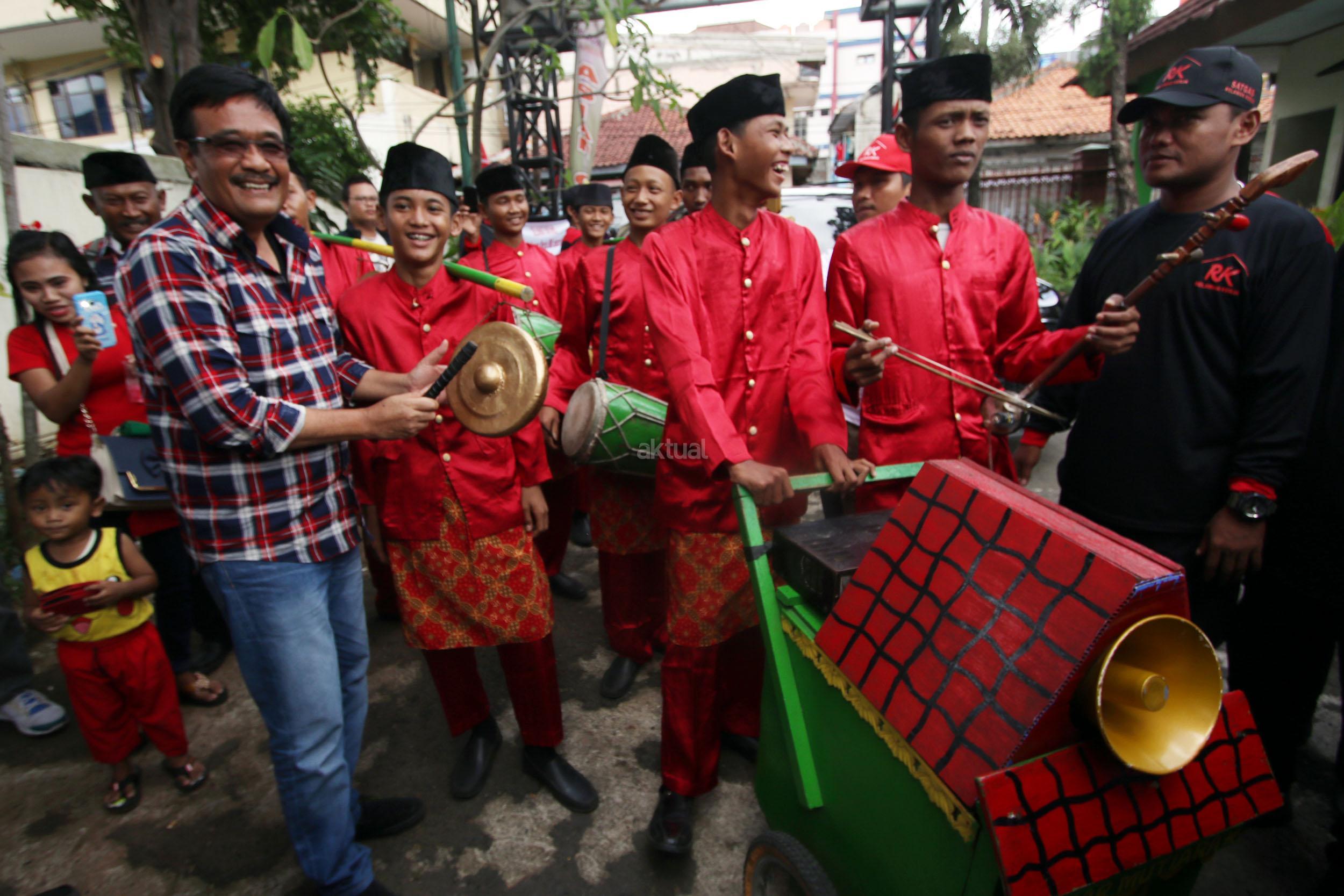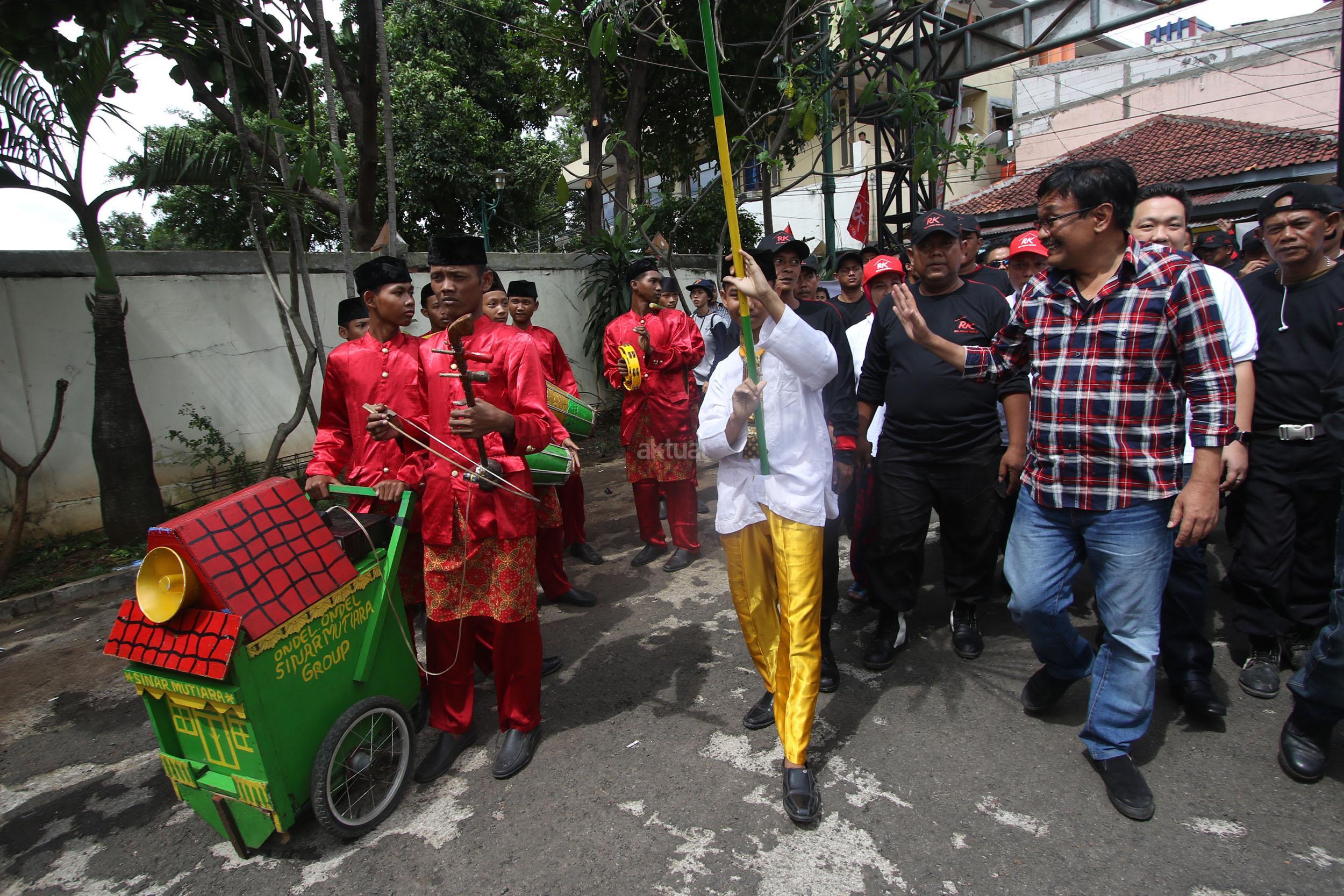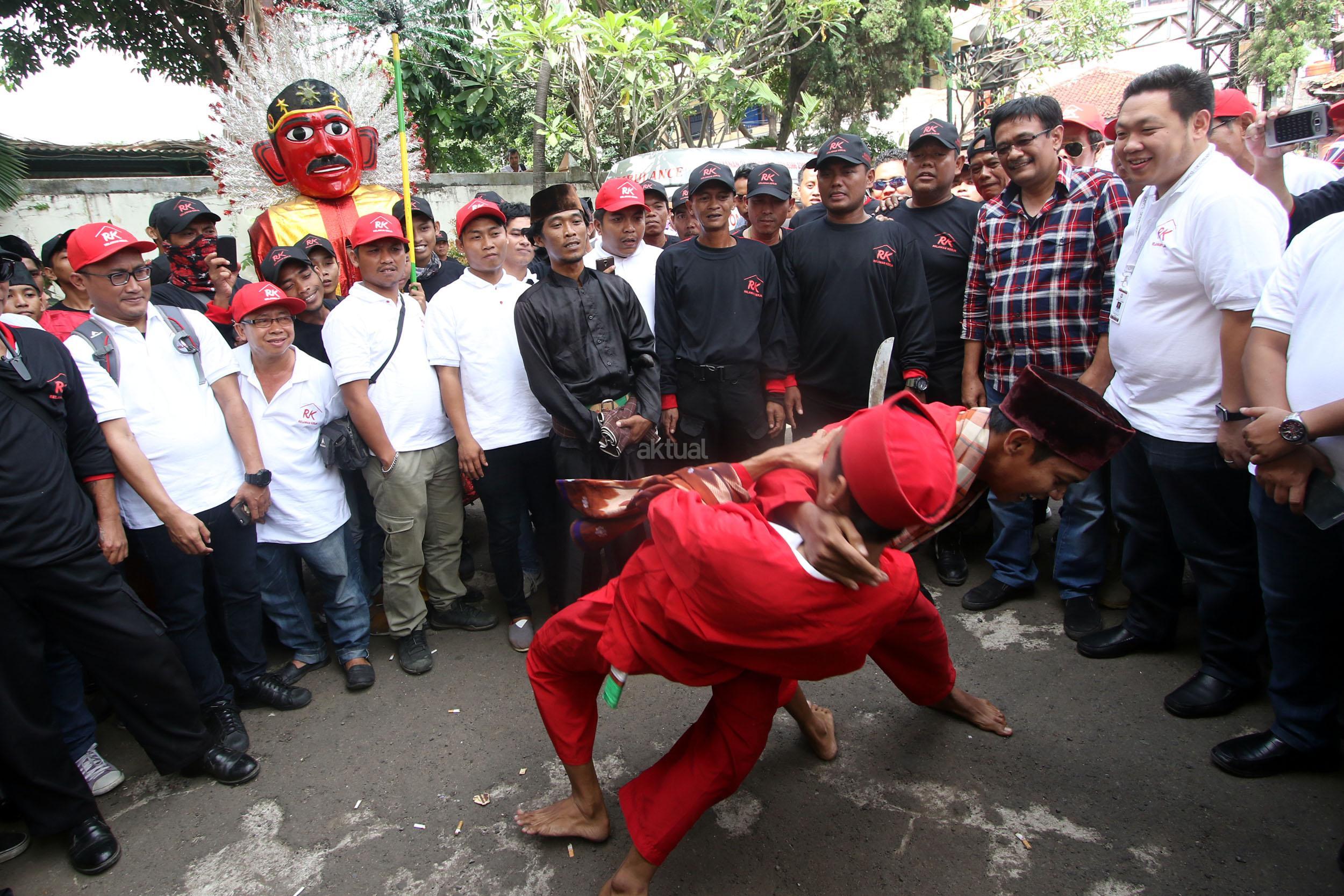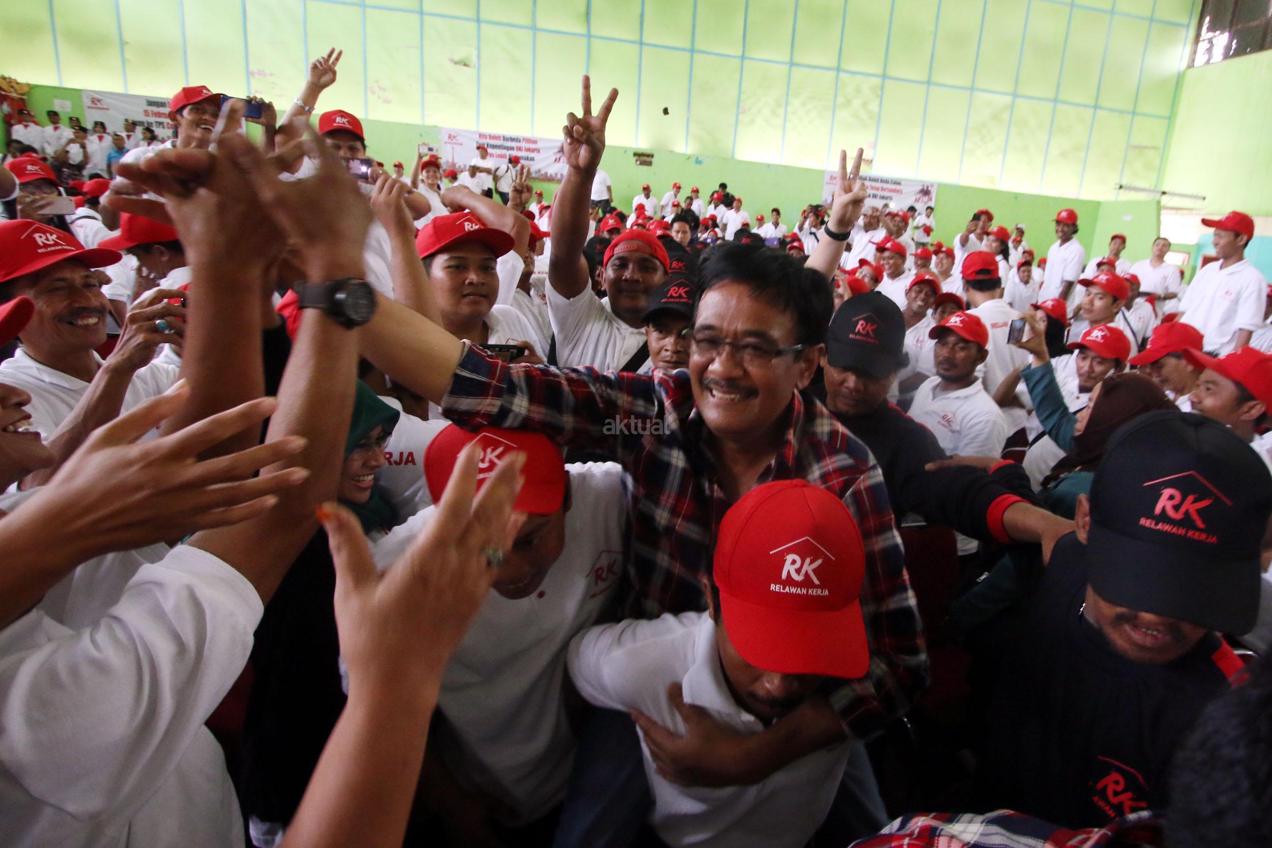 Calon Wakil Gubernur DKI Jakarta Djarot Saiful Hidayat, digendong relawan saat kampanye di GOR Kebon Jeruk, Jakarta Barat, Minggu (5/2). Djarot menghadiri acara bersama ratusan relawan saat Apel Siaga relawan Kerja untuk pemenangan Basuki-Djarot jelang pelaksanaan Pilkada 15 Februari. AKTUAL/HO