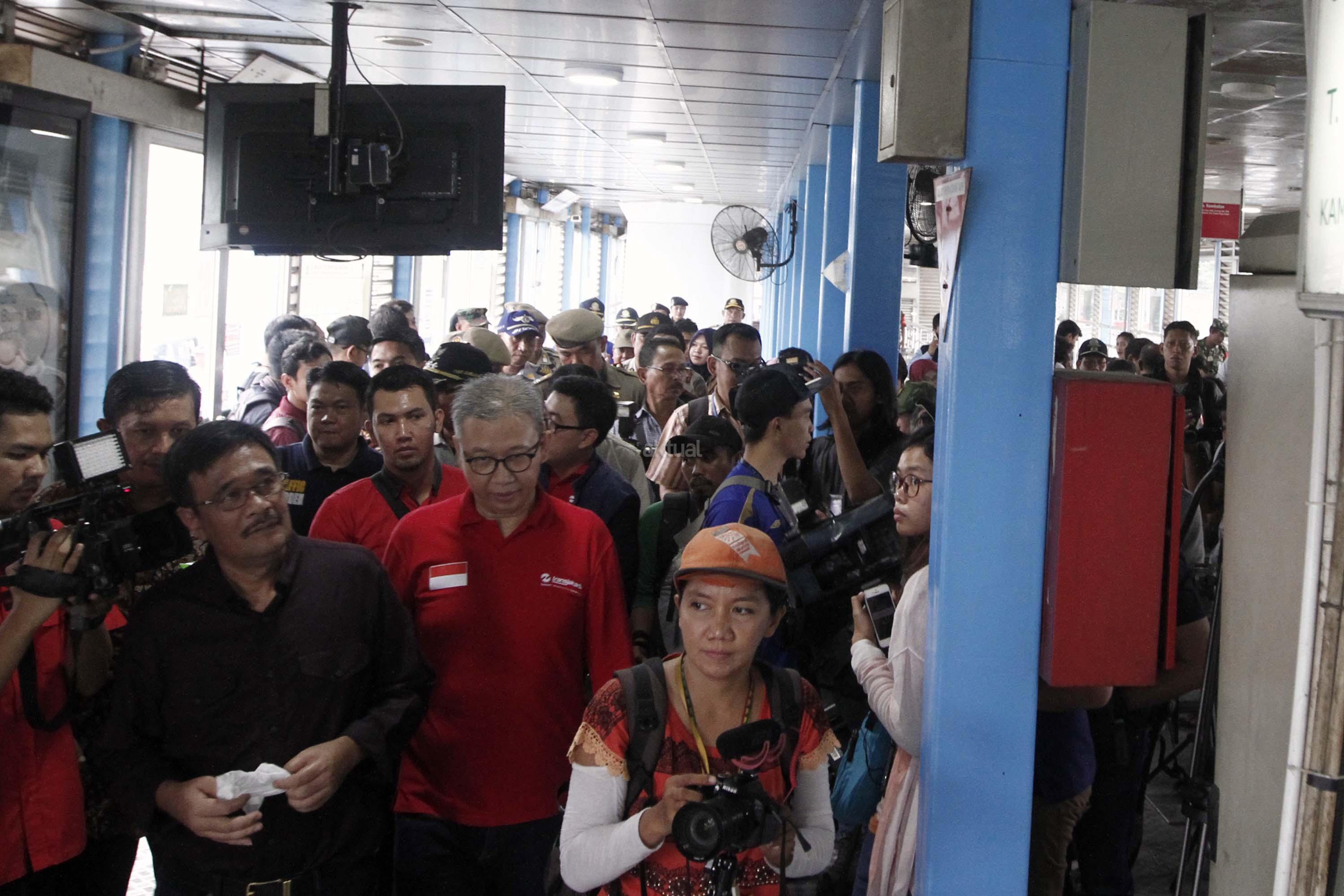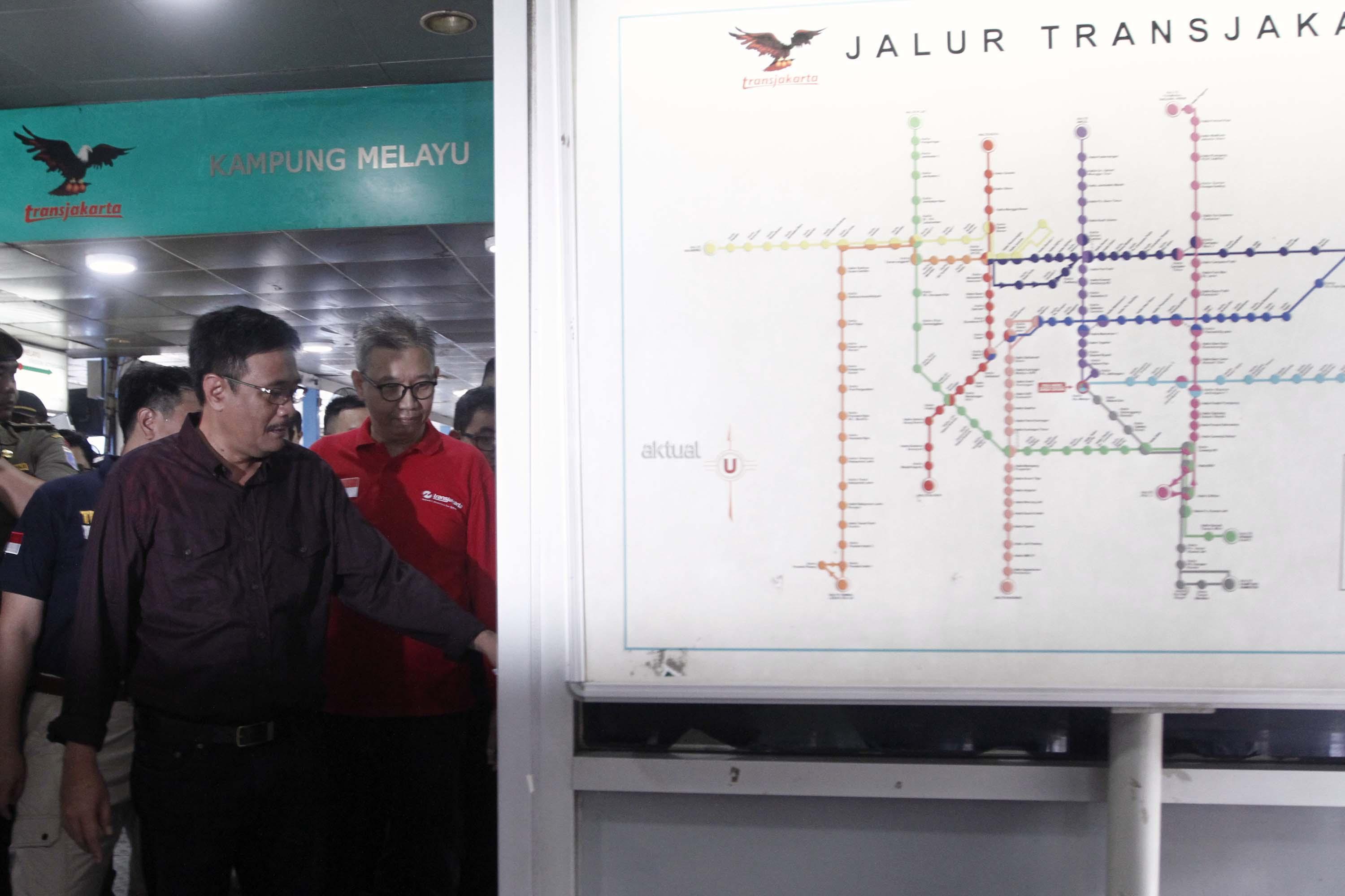 Dalam tinjauannya Djarot meminta halte-halte bus Transjakarta dipasangi “metal detector” untuk menjaga keamanan. AKTUAL/Munzir