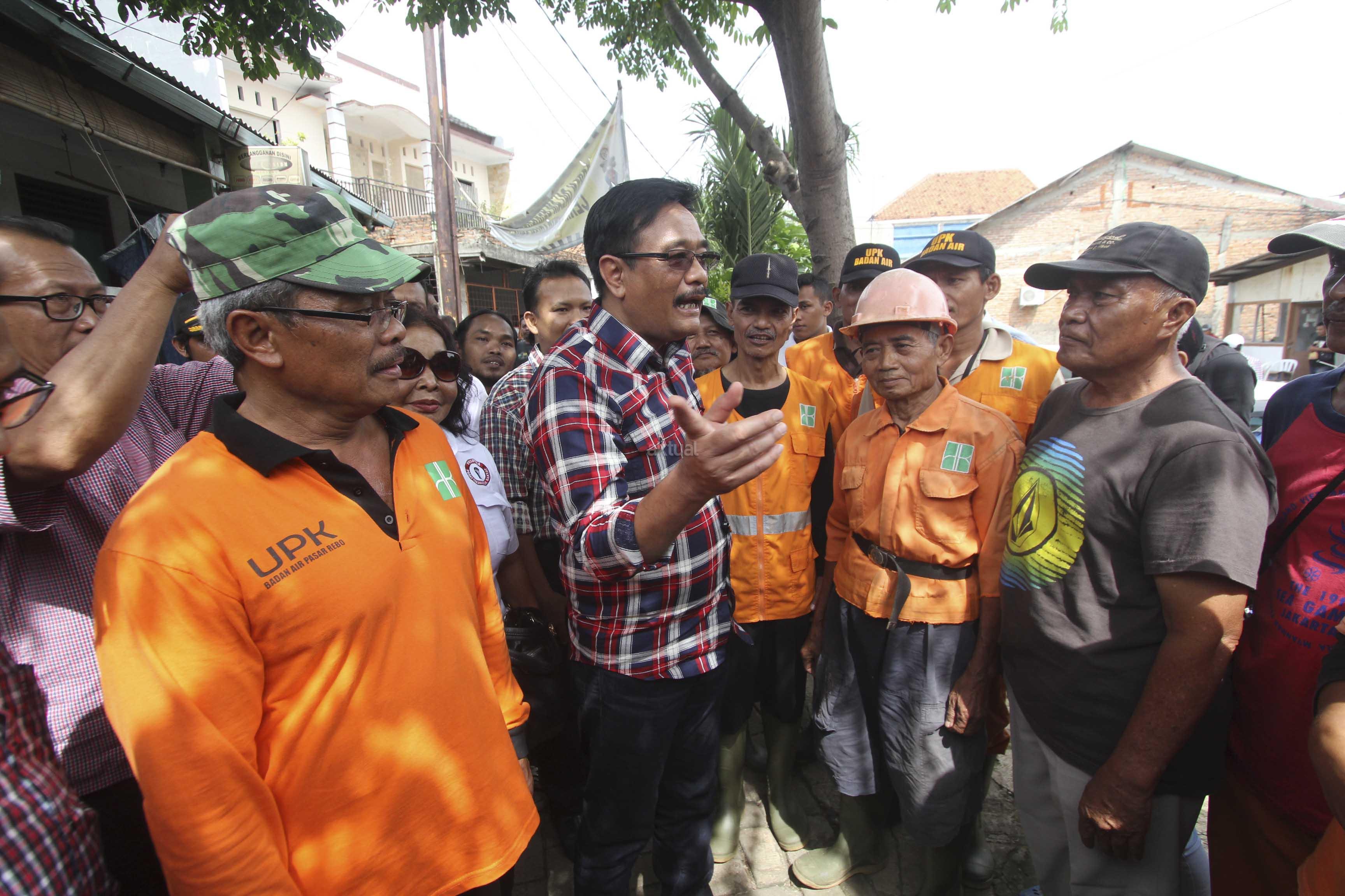 Calon Wakil Gubernur DKI Jakarta, Djarot Saiful Hidayat menyapa sejumlah pekerja Penanganan Prasarana dan Sarana Umum (PPSU) saat blusukan di Kalisari, Pasar Rebo, Jakarta Timur, Rabu (2/11/2016). Para pekerja PPSU atau “pasukan oranye” yang merupakan warga sekitar mengaku senang dapat dilibatkan dalam menjaga kebersihan lingkungan serta mendapatkan gaji dari pemprov. AKTUAL/Tino Oktaviano