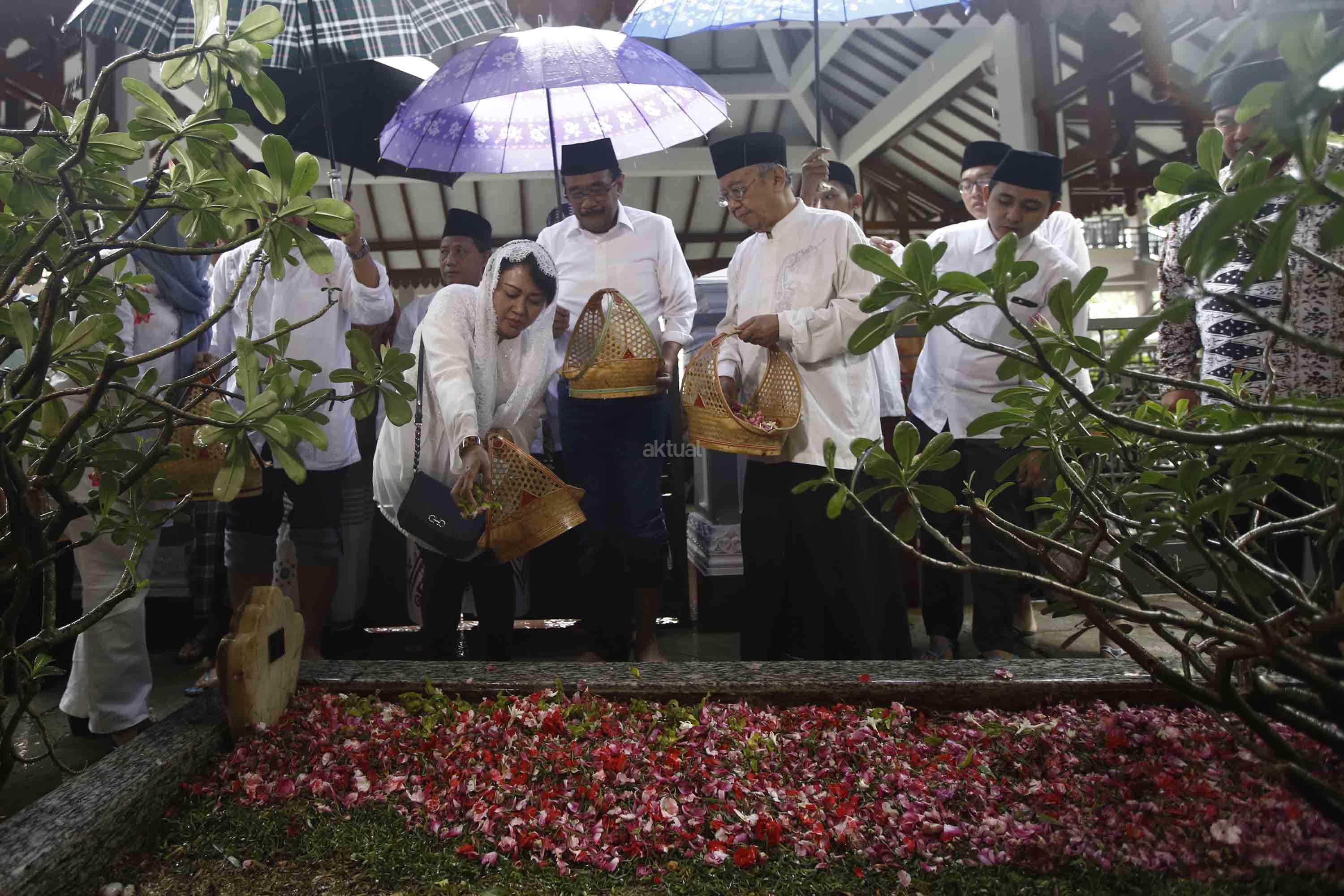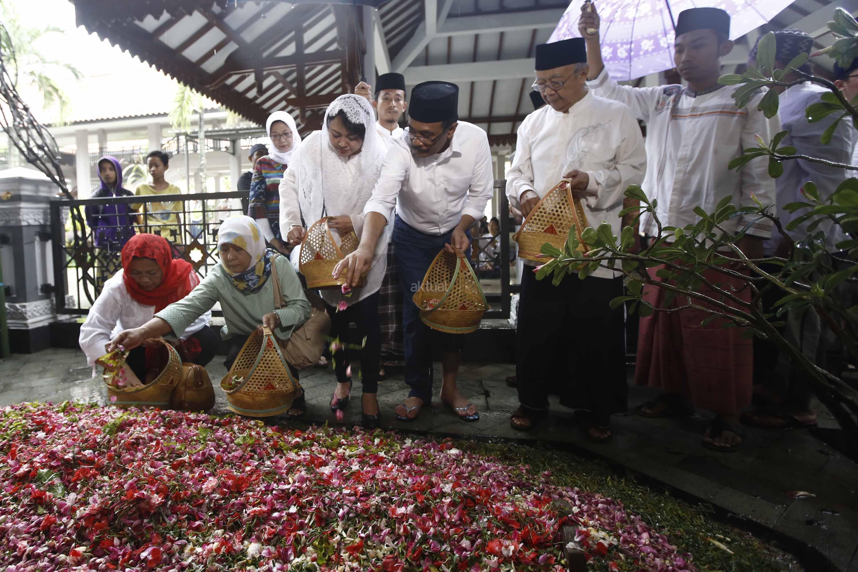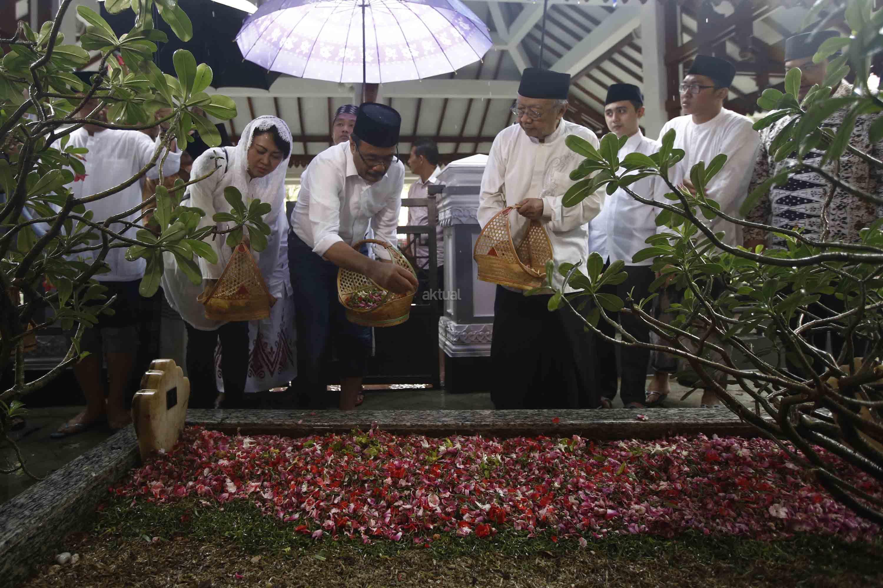 Calon Wakil Gubernur DKI Jakarta, Djarot Saiful Hidayat (kiri) didampingi Istri Happy Farida Hidayat dan Pengasuh Ponpes Tebuireng KH Salahuddin Wahid (kedua kanan) menaburkan bunga di atas makam Presiden ke-4 KH Abdurrahman Wahid alias Gus Dur di Ponpes Tebuireng, Jombang, Jawa Timur, Jumat (11/11). Selain ziarah ke makam Gus Dur, Djarot juga berziarah ke makam pendiri NU KH Hasyim Ashari dan KH Abdul Wahid Hasyim sebagai wujud penghormatan serta mendoakan arwah para pejuang kemerdekaan. AKTUAL/HO