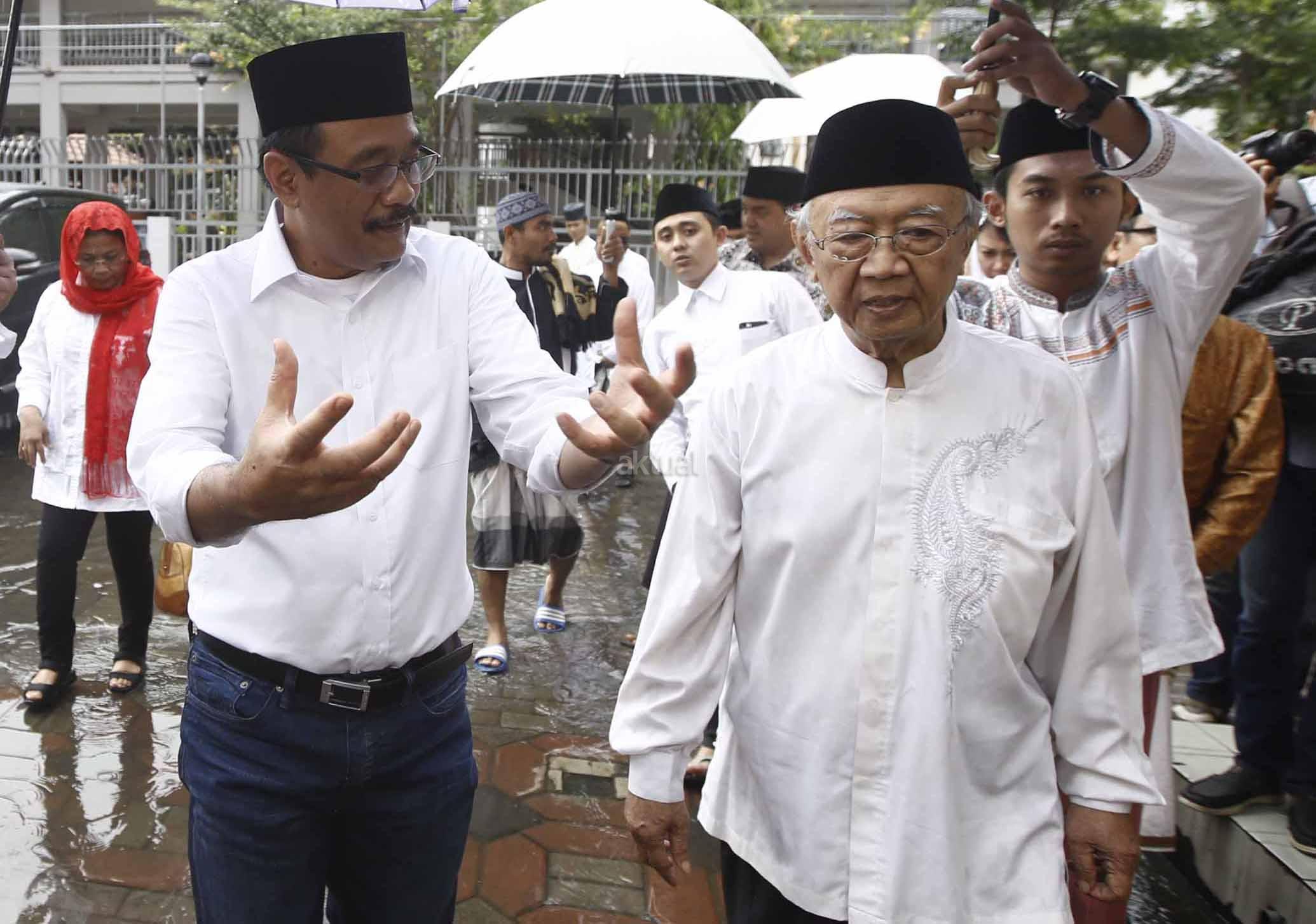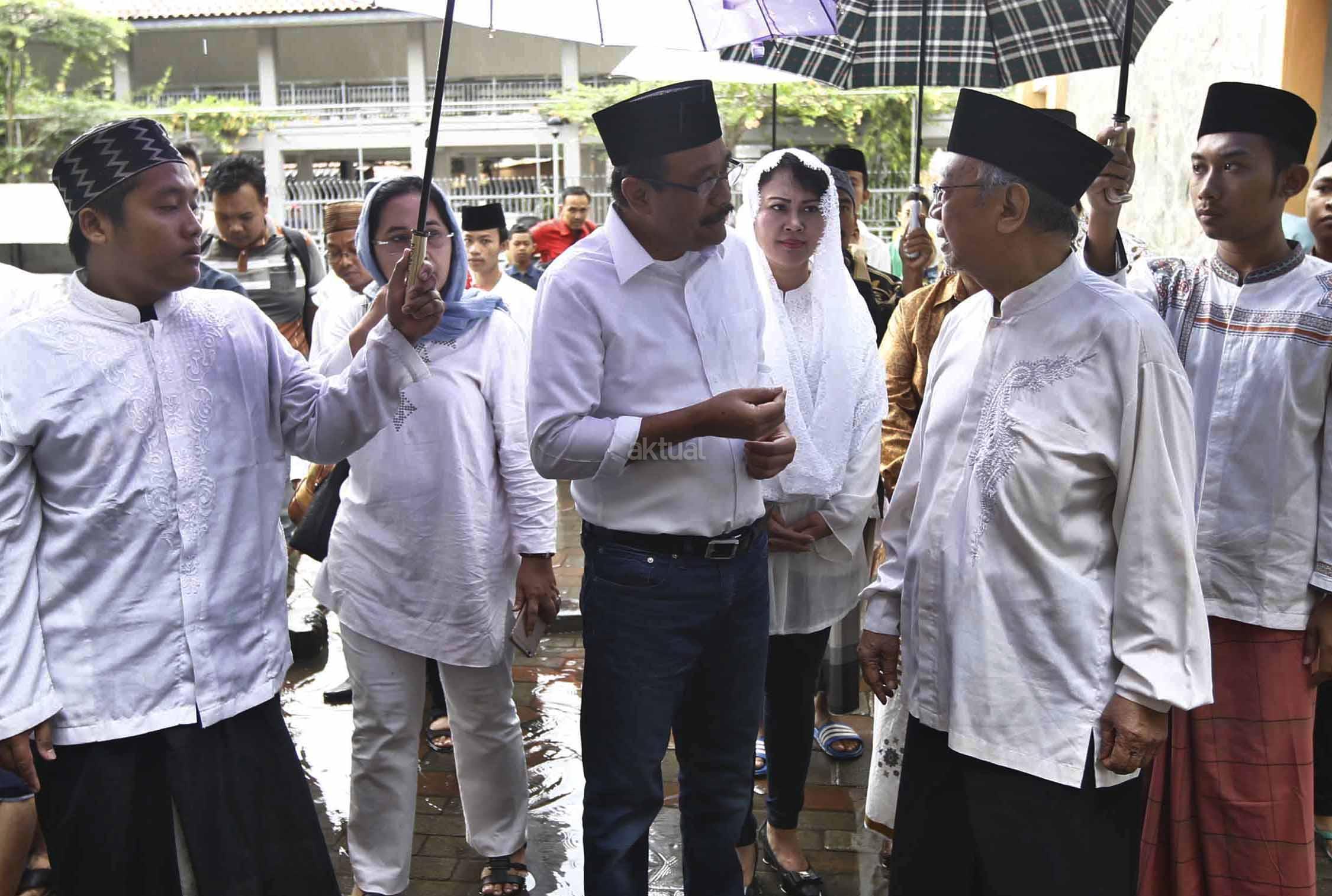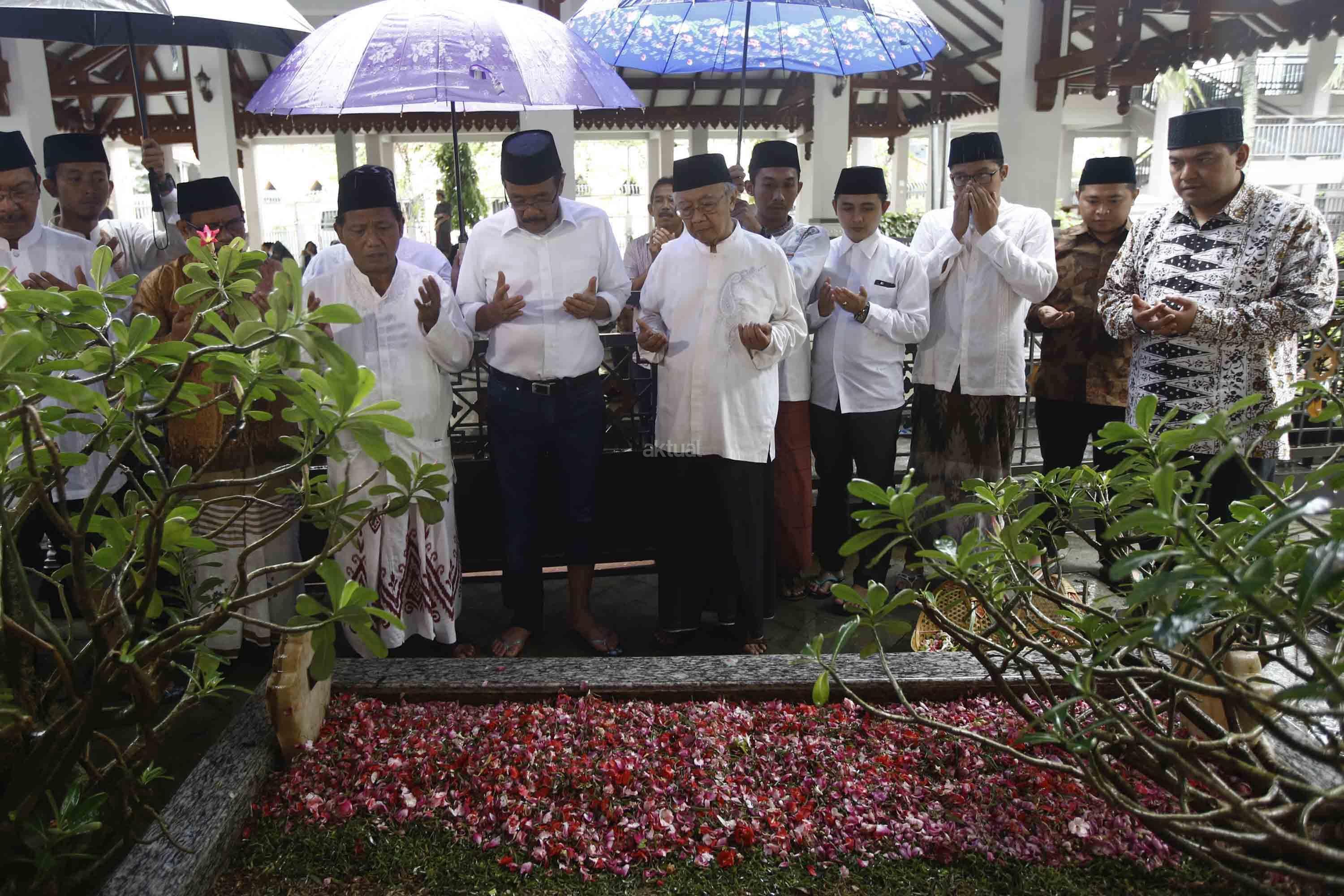 Calon Wakil Gubernur DKI Jakarta, Djarot Saiful Hidayat (kiri) didampingi Istri Happy Farida Hidayat dan Pengasuh Ponpes Tebuireng KH Salahuddin Wahid (kedua kanan) menaburkan bunga di atas makam Presiden ke-4 KH Abdurrahman Wahid alias Gus Dur di Ponpes Tebuireng, Jombang, Jawa Timur, Jumat (11/11). Selain ziarah ke makam Gus Dur, Djarot juga berziarah ke makam pendiri NU KH Hasyim Ashari dan KH Abdul Wahid Hasyim sebagai wujud penghormatan serta mendoakan arwah para pejuang kemerdekaan. AKTUAL/HO