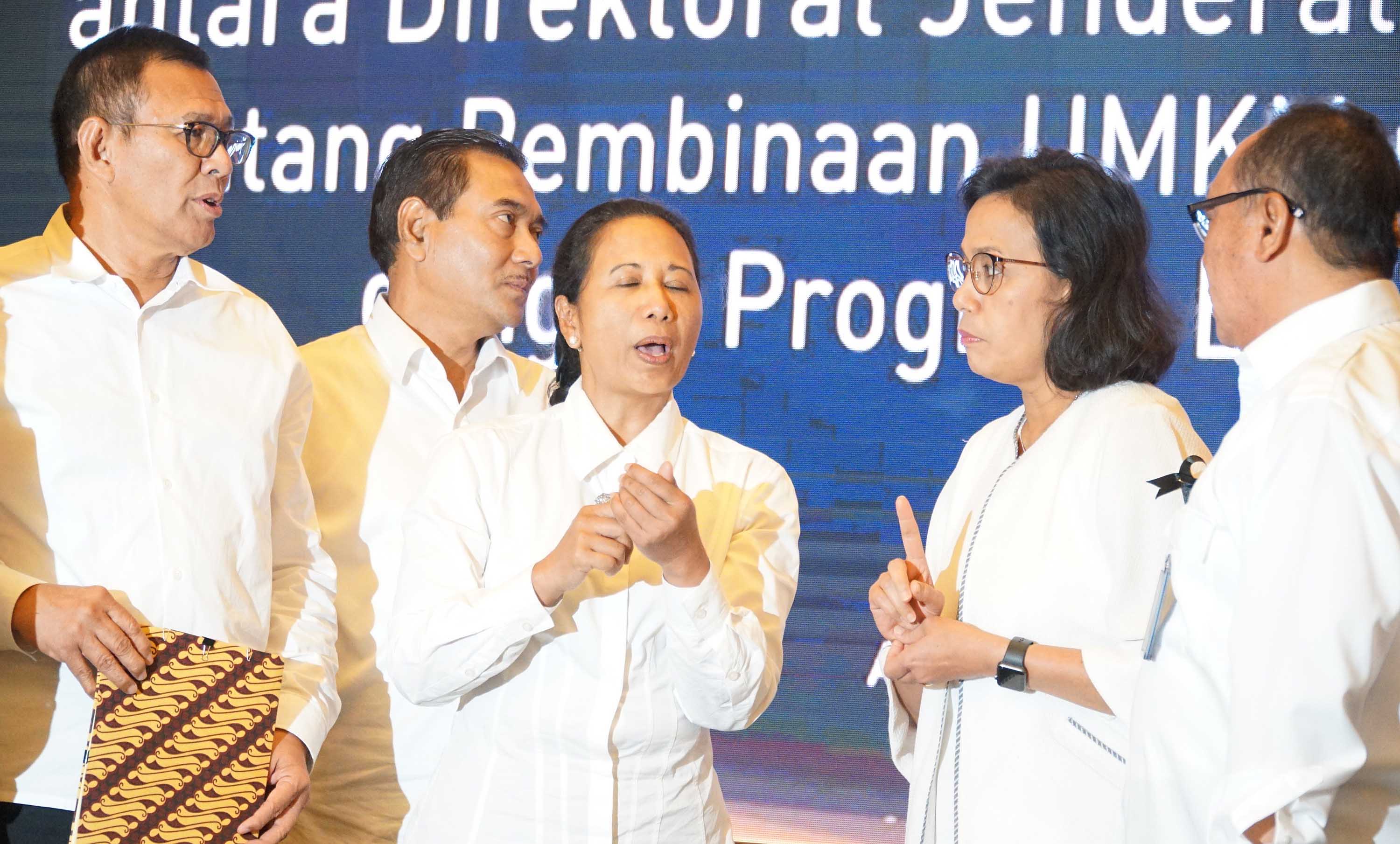 Menteri Keuangan RI Sri Mulyani Indrawati (Kedua dari Kiri), Menteri Badan Usaha Milik Negara (BUMN) RI Rini M Soemarno (tengah), Direktur Jenderal Pajak Kementerian Keuangan RI Robert Pakpahan (Kedua Kanan), Direktur Utama BNI Achmad Baiquni ( Kiri) Direktur Utama BTN Maryono (Kanan) pada Acara Penandatanganan Perjanjian Kerja Sama antara Direktorat Jenderal Pajak dengan HIMBARA dan TELKOM tentang Pembinaan UMKM melalui Program Rumah Kreatif BUMN dengan Program Business Development Services DJP yang diselenggarakan di Jakarta, Rabu (31 Oktober 2018). Melalui program tersebut, 472.272 pelaku UMKM mitra binaan RKB mendapatkan edukasi terkait pajak yang wajib dibayarkan oleh para UMKM. Pembayaran pajak dapat dilakukan melalui BNI dan bank BUMN lainnya. AKTUAL/Eko S Hilman