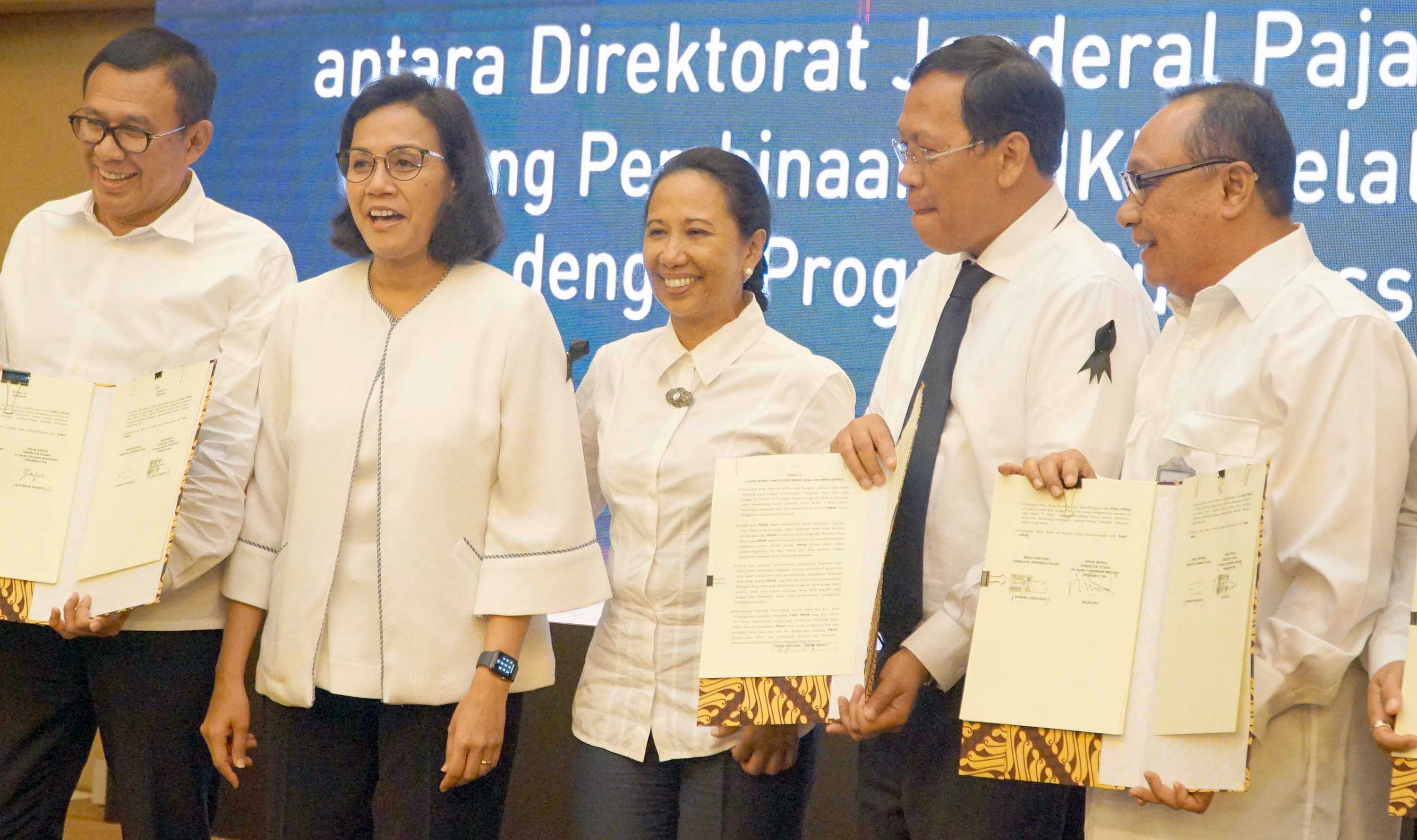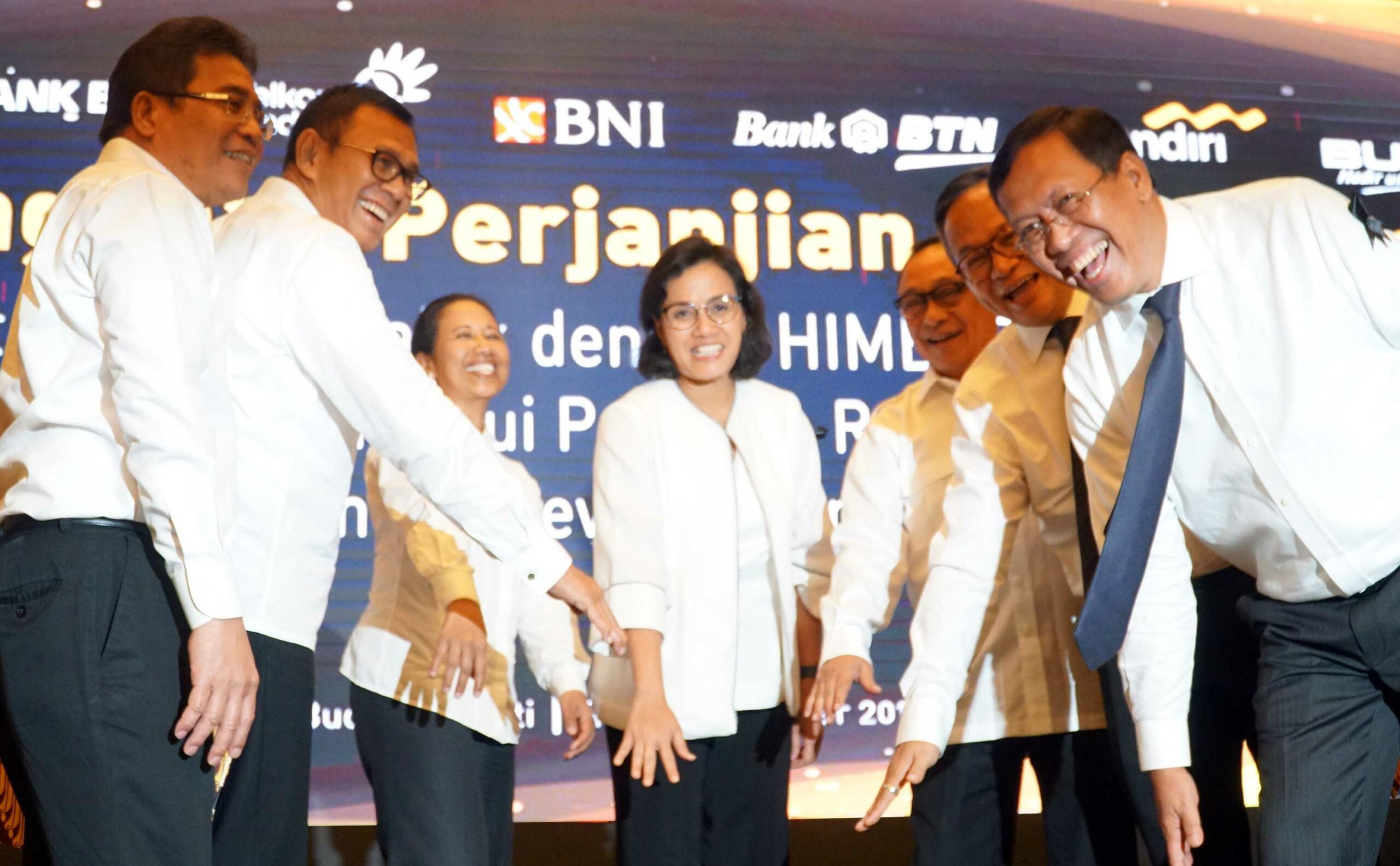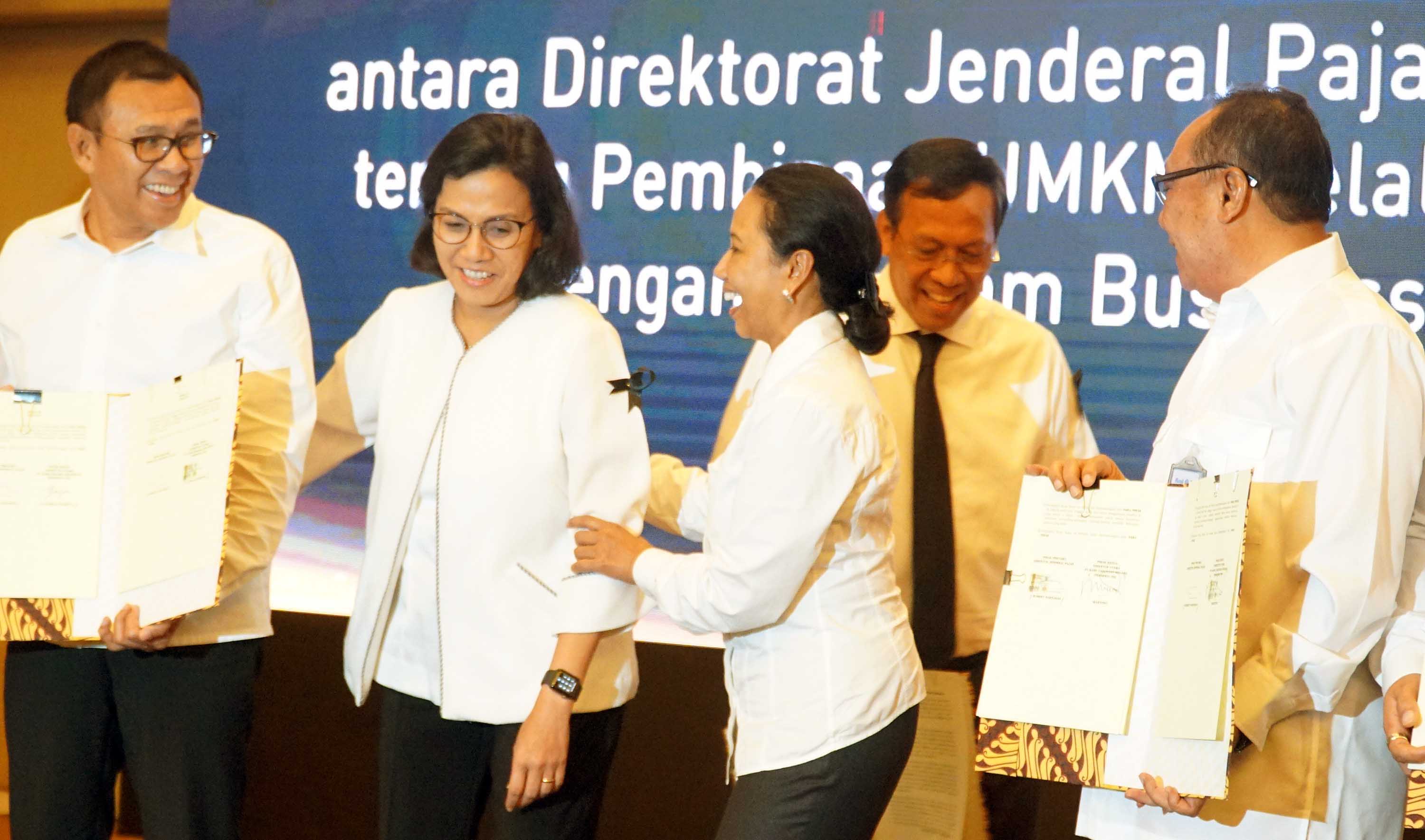 Menteri Keuangan RI Sri Mulyani Indrawati ( Kiri), Direktur Jenderal Pajak Kementerian Keuangan RI Robert Pakpahan (tengah), Direktur Utama BNI Achmad Baiquni (Kelima dari kanan) Direktur Utama BTN Maryono (ketiga dari Kanan), dan Direktur Utama TELKOM Alex J Sinaga (ketiga dari kanan) pada Acara Penandatanganan Perjanjian Kerja Sama antara Direktorat Jenderal Pajak dengan HIMBARA dan TELKOM tentang Pembinaan UMKM melalui Program Rumah Kreatif BUMN dengan Program Business Development Services DJP yang diselenggarakan di Jakarta, Rabu (31 Oktober 2018). Melalui program tersebut, 472.272 pelaku UMKM mitra binaan RKB mendapatkan edukasi terkait pajak yang wajib dibayarkan oleh para UMKM. Pembayaran pajak dapat dilakukan melalui BNI dan bank BUMN lainnya. AKTUAL/Eko S Hilman