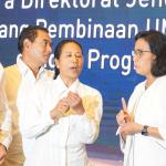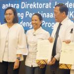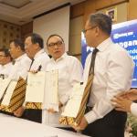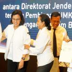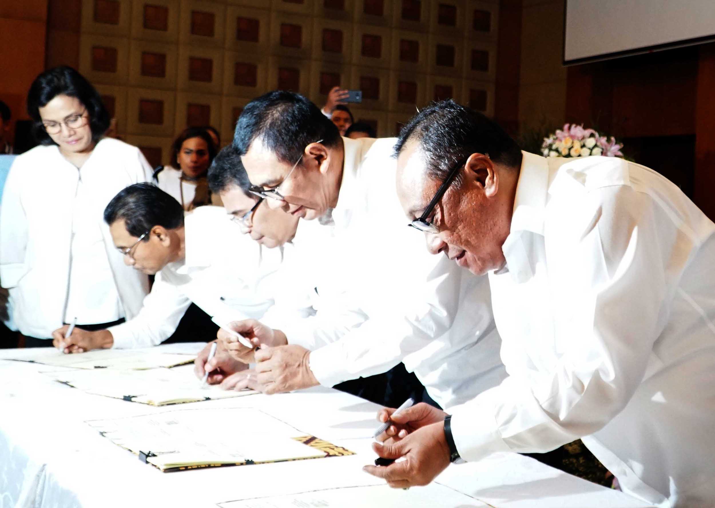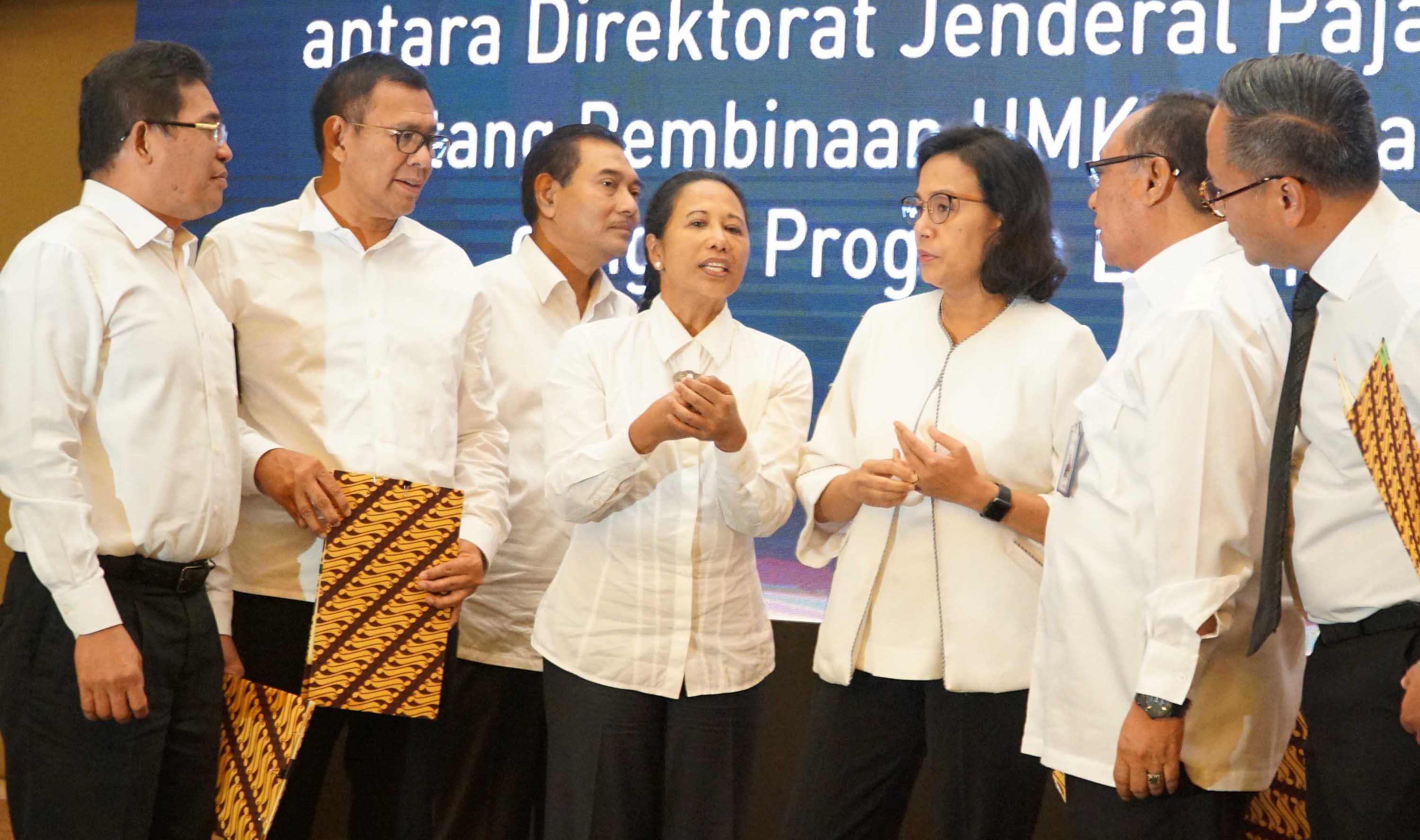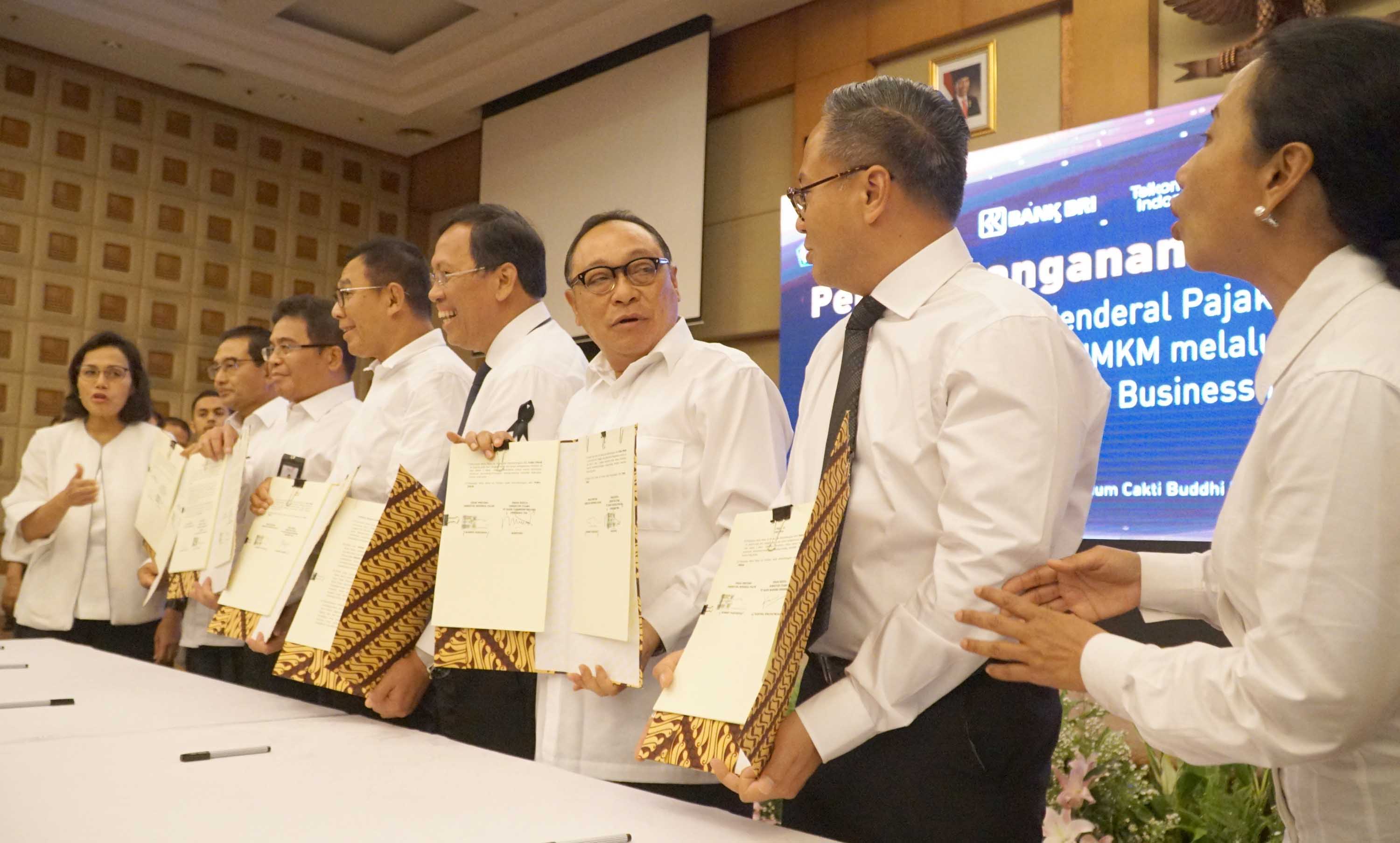Menteri Keuangan RI Sri Mulyani Indrawati ( Kiri), Direktur Jenderal Pajak Kementerian Keuangan RI Robert Pakpahan (tengah), Direktur Utama BNI Achmad Baiquni (Kelima dari kanan) Direktur Utama BTN Maryono (ketiga dari Kanan), dan Direktur Utama TELKOM Alex J Sinaga (ketiga dari kanan) pada Acara Penandatanganan Perjanjian Kerja Sama antara Direktorat Jenderal Pajak dengan HIMBARA dan TELKOM tentang Pembinaan UMKM melalui Program Rumah Kreatif BUMN dengan Program Business Development Services DJP yang diselenggarakan di Jakarta, Rabu (31 Oktober 2018). Melalui program tersebut, 472.272 pelaku UMKM mitra binaan RKB mendapatkan edukasi terkait pajak yang wajib dibayarkan oleh para UMKM. Pembayaran pajak dapat dilakukan melalui BNI dan bank BUMN lainnya. AKTUAL/Eko S Hilman