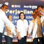 Menteri Keuangan RI Sri Mulyani Indrawati (ketiga dari kanan), Menteri Badan Usaha Milik Negara (BUMN) RI Rini M Soemarno (tengah), Direktur Utama BNI Achmad Baiquni (Kedua Kiri) Direktur Utama BTN Maryono (kedua Kanan), dan Direktur Utama TELKOM Alex J Sinaga (kiri) serta Dirut Bank Mandiri, Kartika Wirjoatmodjo ( kanan) serta Direktur Utama BRI, Suprajarto pada Acara Penandatanganan Perjanjian Kerja Sama antara Direktorat Jenderal Pajak dengan HIMBARA dan TELKOM tentang Pembinaan UMKM melalui Program Rumah Kreatif BUMN dengan Program Business Development Services DJP yang diselenggarakan di Jakarta, Rabu (31 Oktober 2018). Melalui program tersebut, 472.272 pelaku UMKM mitra binaan RKB mendapatkan edukasi terkait pajak yang wajib dibayarkan oleh para UMKM. Pembayaran pajak dapat dilakukan melalui BNI dan bank BUMN lainnya. AKTUAL/Eko S Hilman